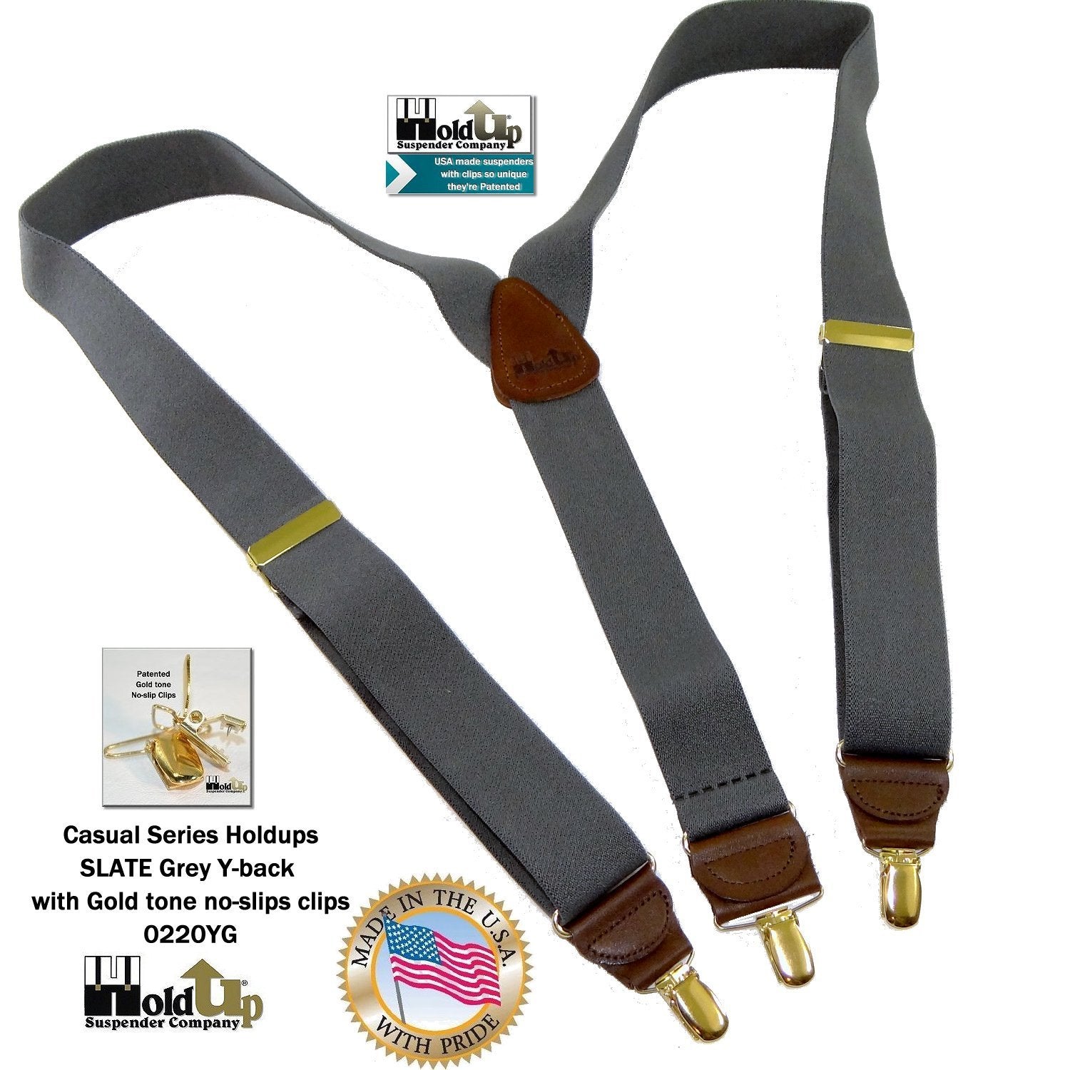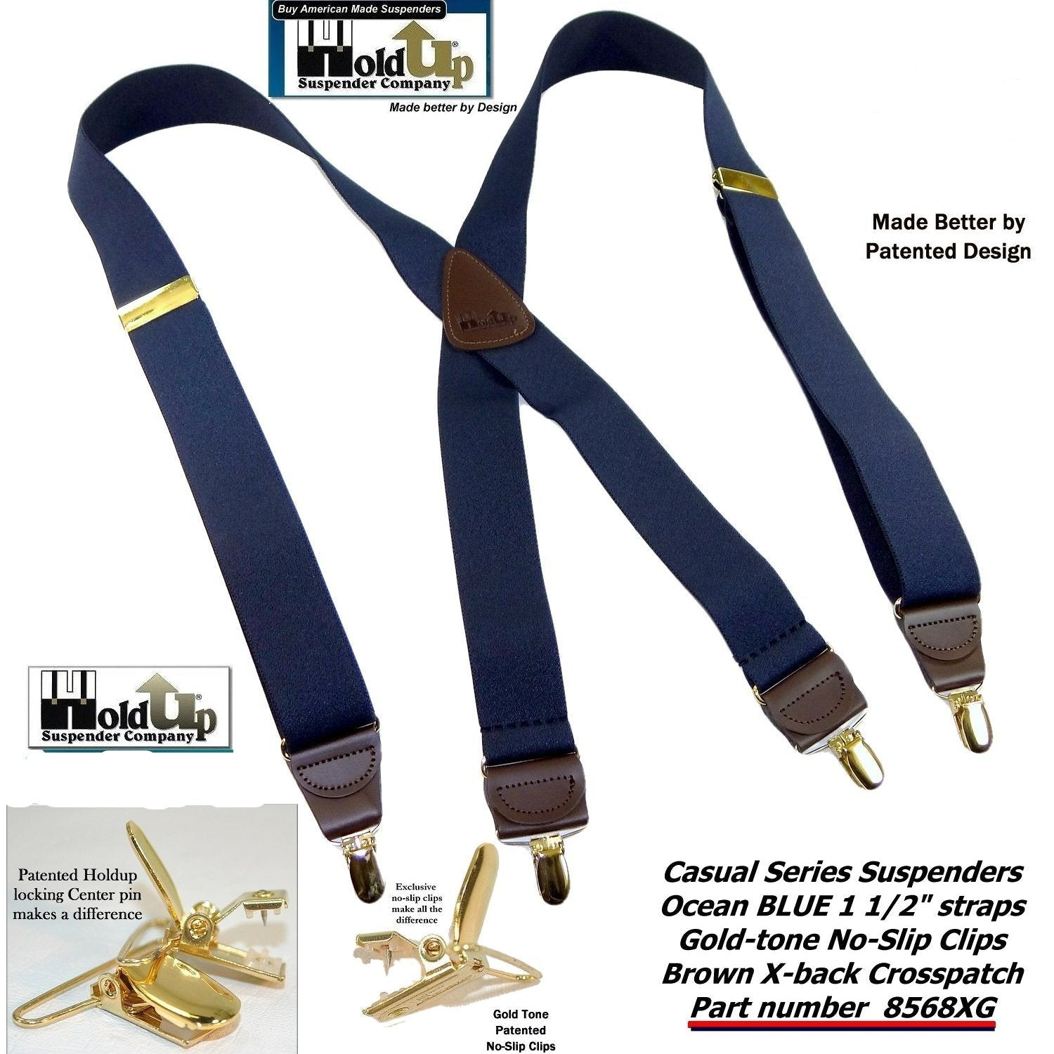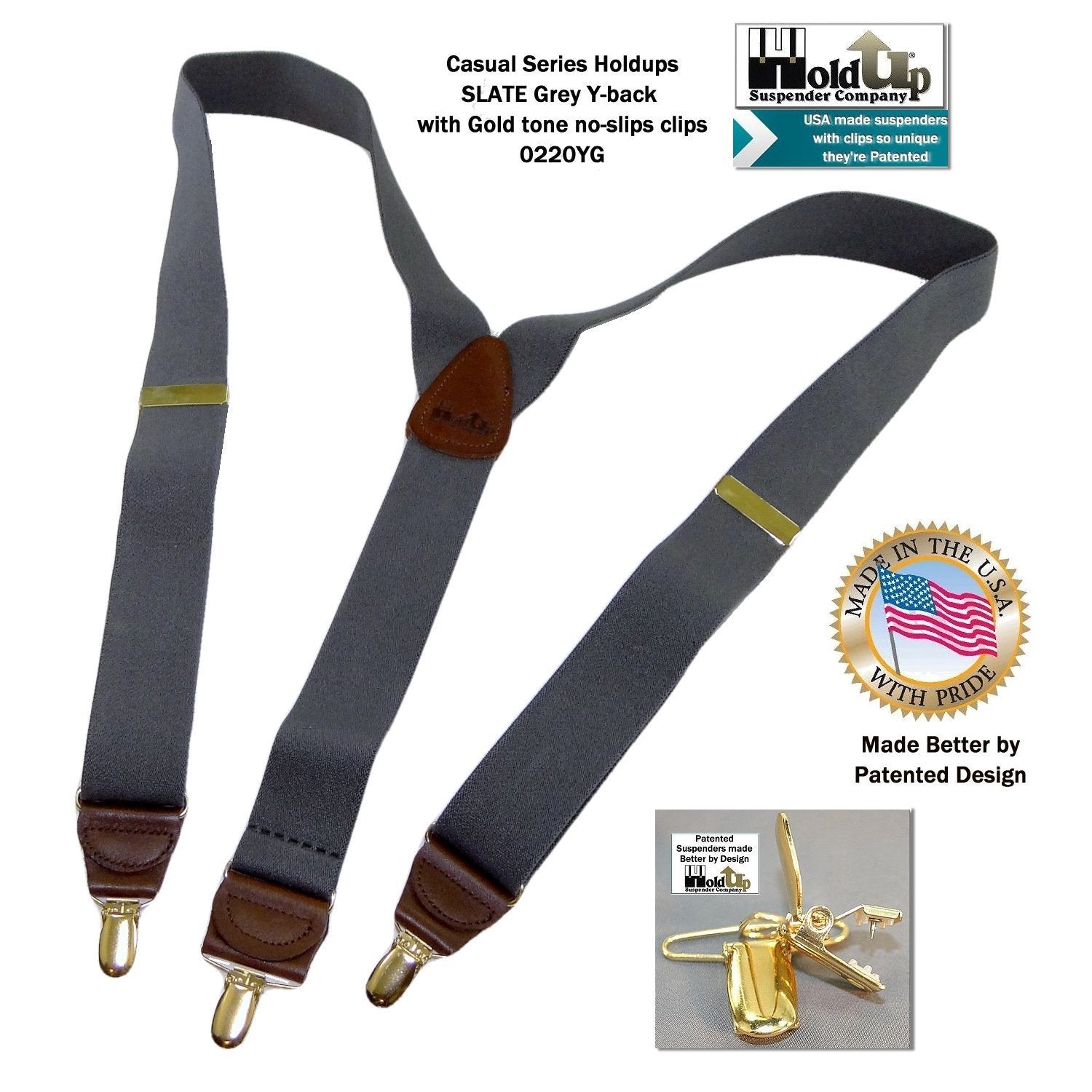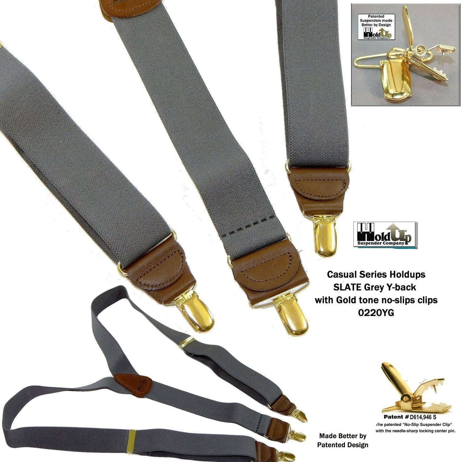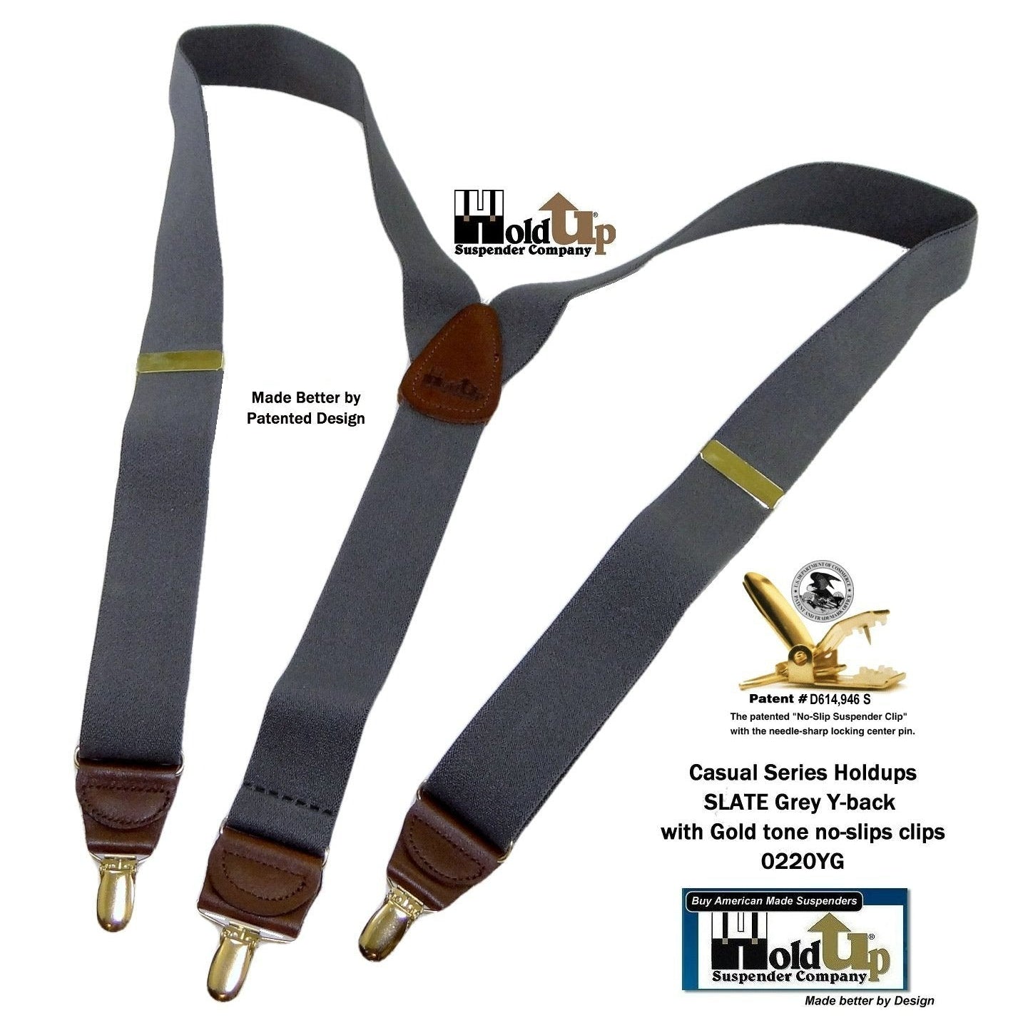 Our casual finger clip series Holdup Suspenders are all about choices. You get to choose from course weave elastic washable poly blend fabric colors. These casual series Holdups come in either X-Back or Y-Back styles with brown leather crosspatch embossed with our Holdup logo. Then you choose silver or gold finished no-slip metal clips and matching length adjusters. Securely Order your favorite color, back style preference and clip polished finish color options from our new Web shop collection of Casual Series Holdup Suspenders. Pay using your Amazon or PayPal account using your preferred credit/Debit Card with Free Freight option at checkout.