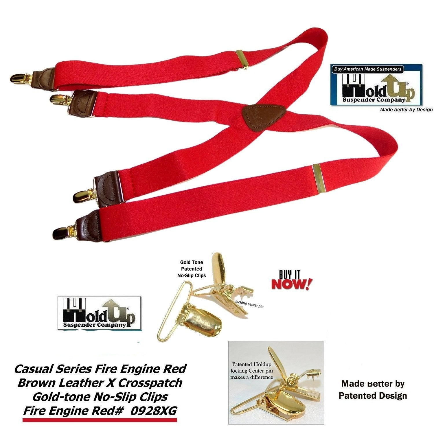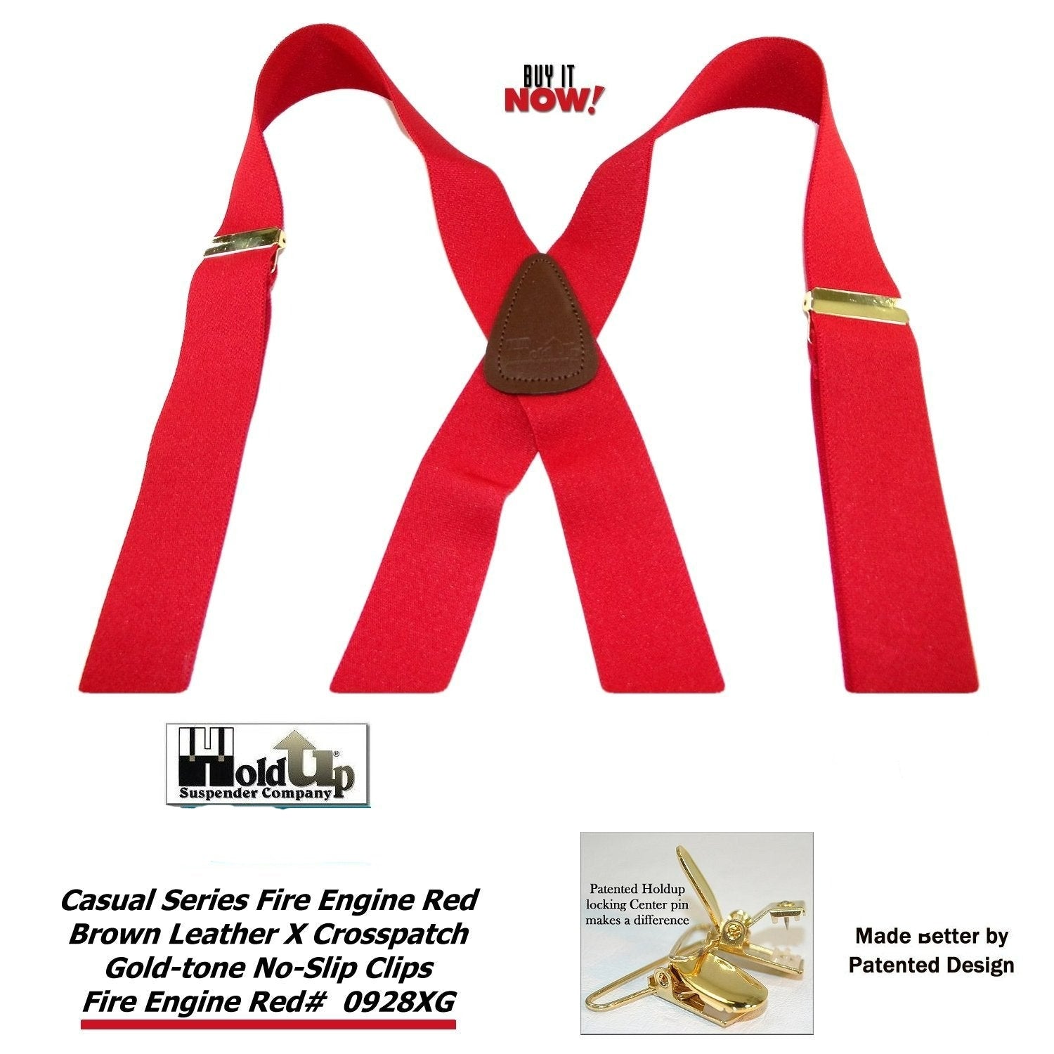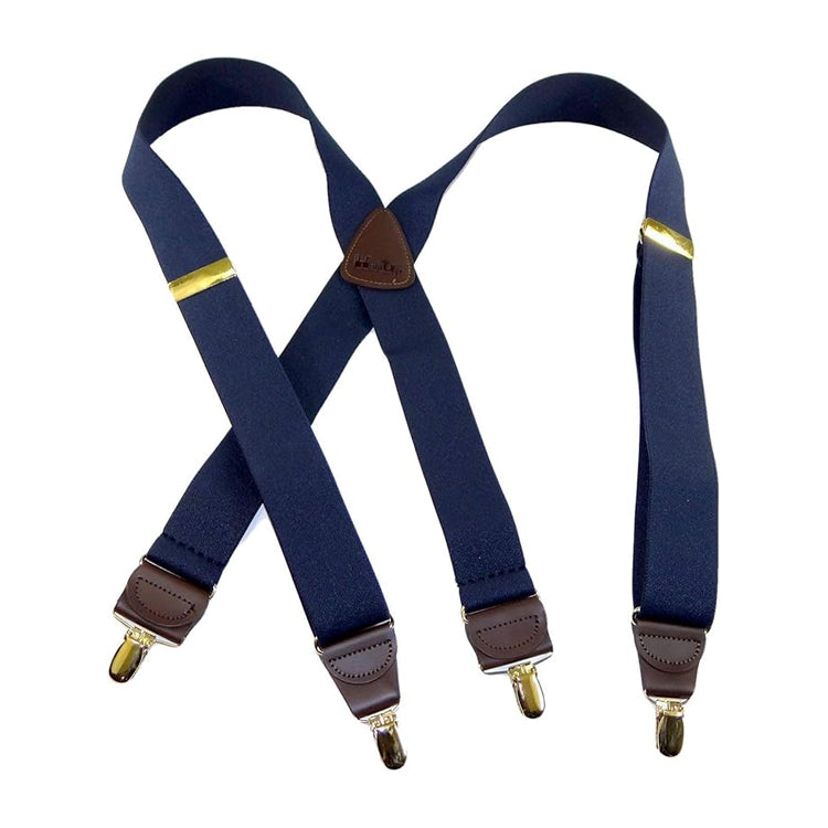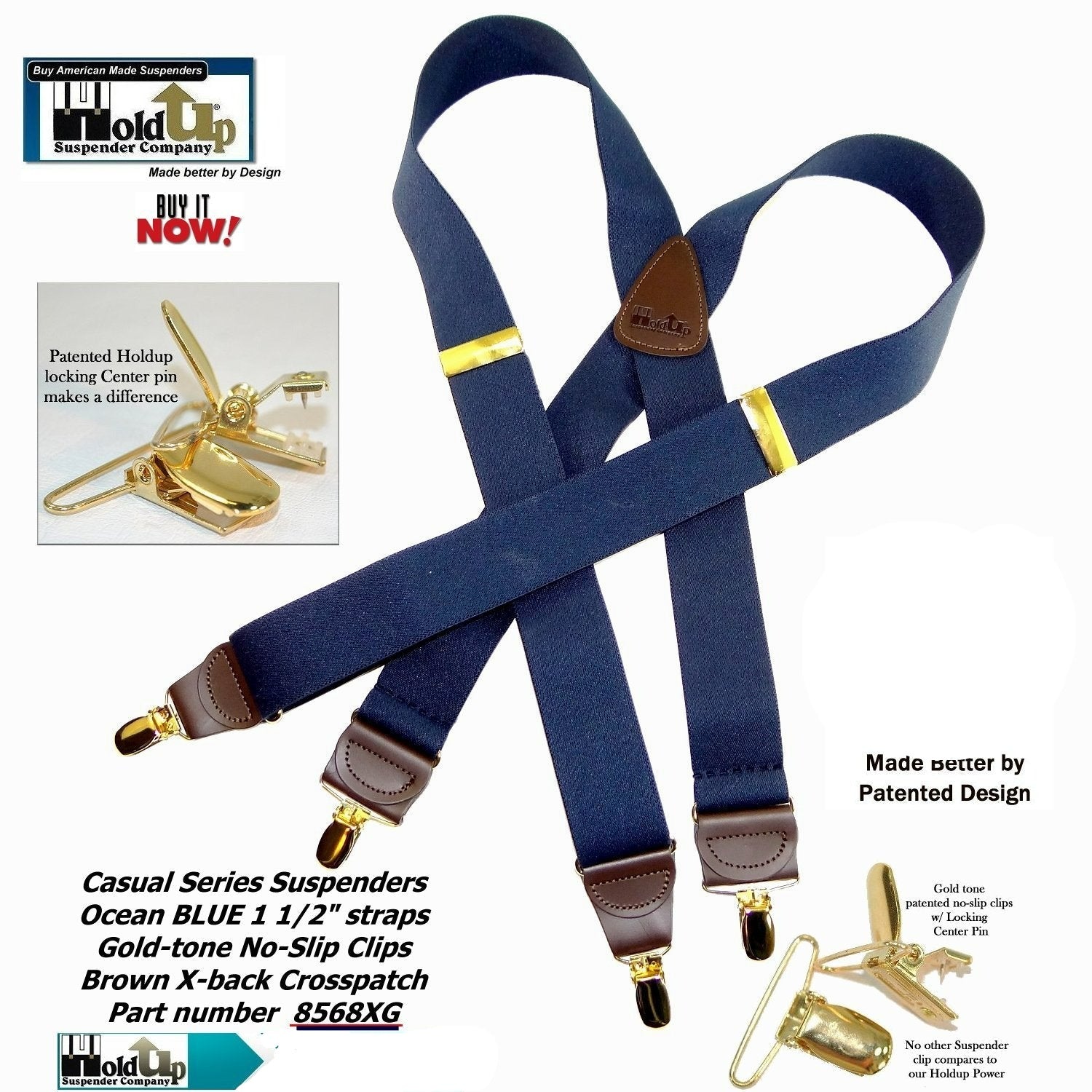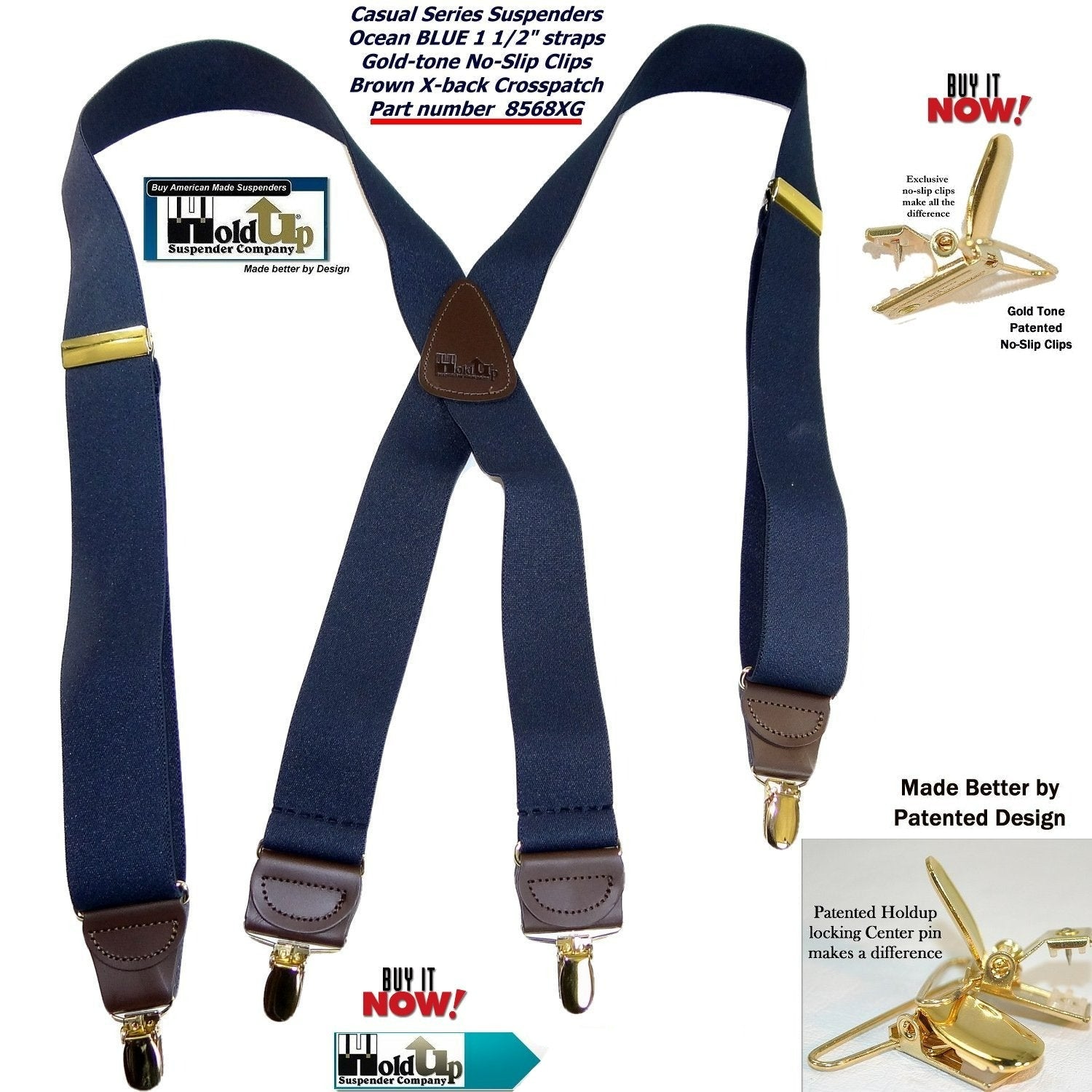 Our casual finger clip series Holdup Suspenders are all about choices. You get to choose from course weave elastic washable poly blend fabric colors. These casual series Holdups come in either X-Back or Y-Back styles with brown leather crosspatch embossed with our Holdup logo. Then you choose silver or gold finished no-slip metal clips and matching length adjusters. Securely Order your favorite color, back style preference and clip polished finish color options from our new Web shop collection of Casual Series Holdup Suspenders. Pay using your Amazon or PayPal account using your preferred credit/Debit Card with Free Freight option at checkout.