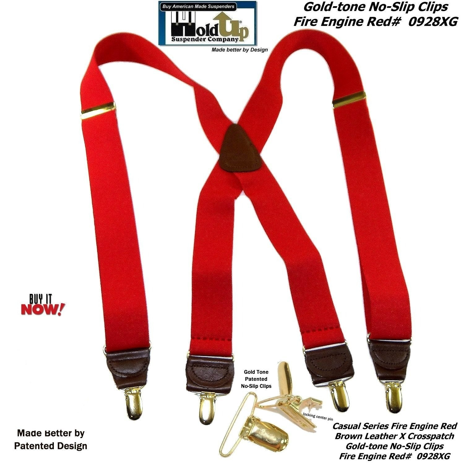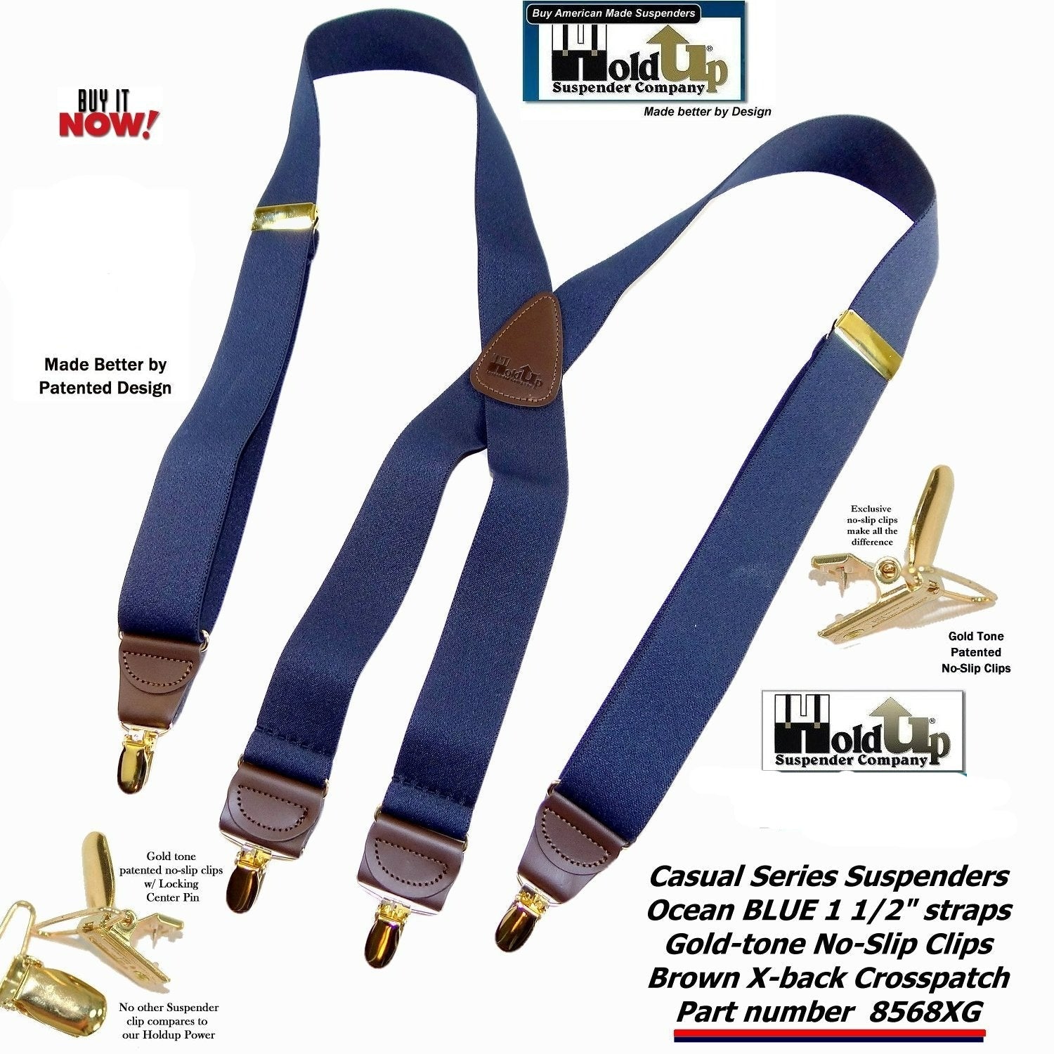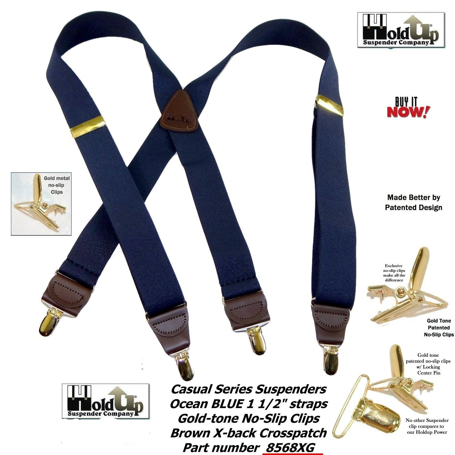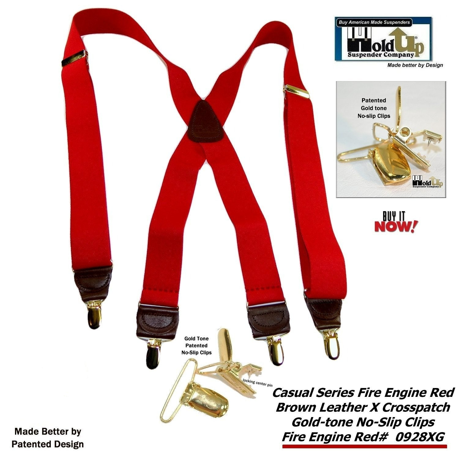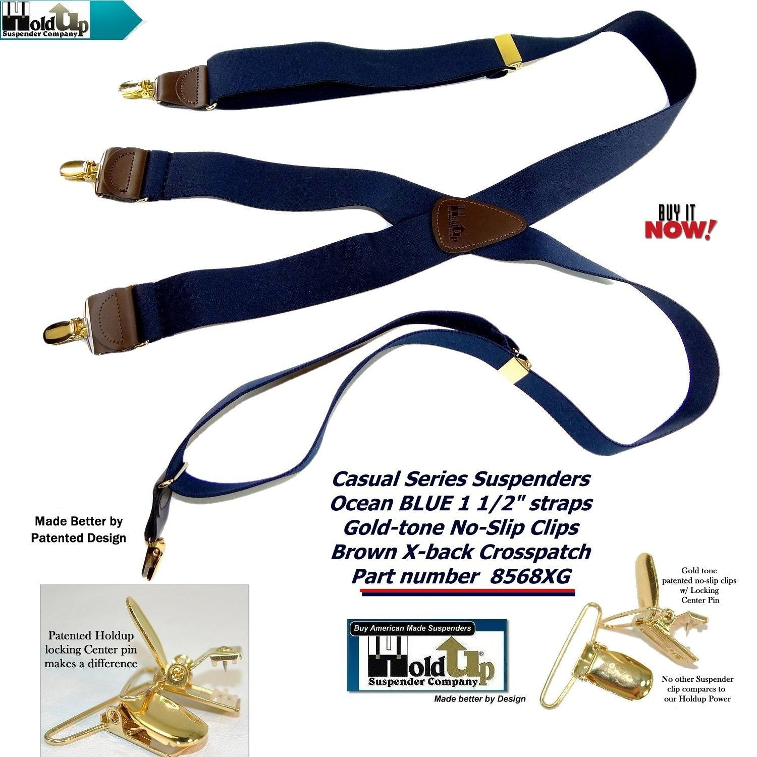 Our casual finger clip series Holdup Suspenders are all about choices. You get to choose from course weave elastic washable poly blend fabric colors. These casual series Holdups come in either X-Back or Y-Back styles with brown leather crosspatch embossed with our Holdup logo. Then you choose silver or gold finished no-slip metal clips and matching length adjusters. Securely Order your favorite color, back style preference and clip polished finish color options from our new Web shop collection of Casual Series Holdup Suspenders. Pay using your Amazon or PayPal account using your preferred credit/Debit Card with Free Freight option at checkout.