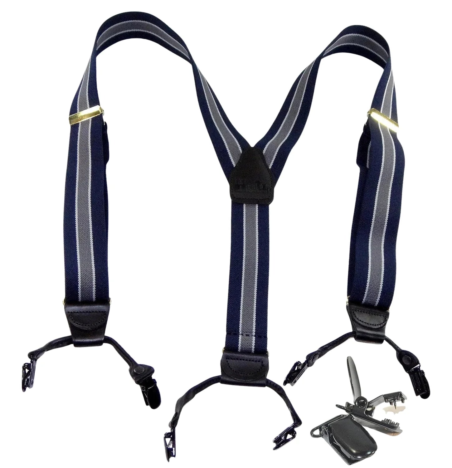 Stripes Series dual clip Double-Ups style Suspenders are made by Holdup Suspender Company. All Striped Holdups come in Y-back only with Holdup embossed logo in a top quality black leather crosspatch and have patented black no-slip center pin type clips.