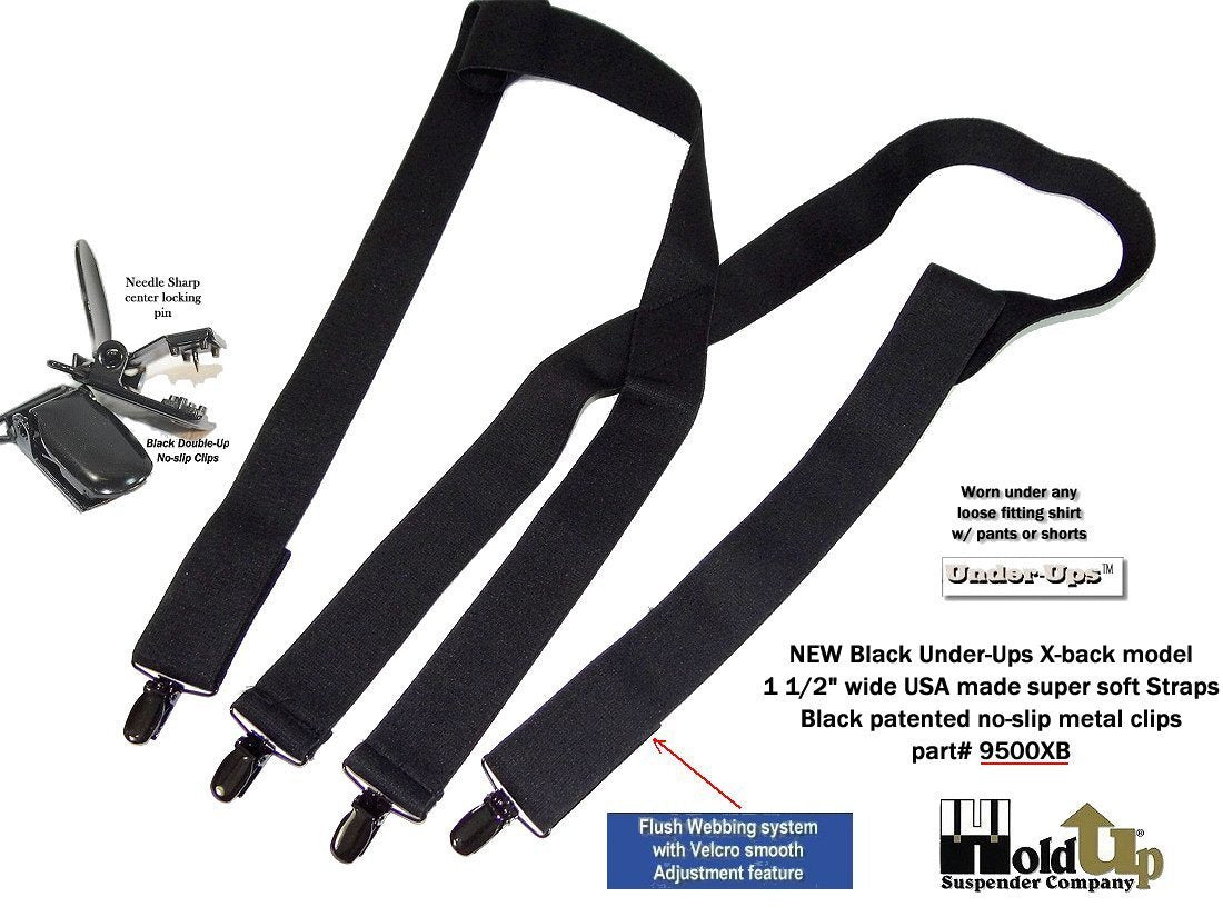 These super comfortable all black suspenders are made to be worn out of sight for those not needing to tuck in their shirts and attach at waist with 4 of our patented black No-slip clips. This concept is entirely new in men's suspenders as these are made to wear under your shirt next to your skin. Holdup Suspender Company patented these undergarment pant suspenders, which are trademarked as Under-Ups. Invisible or hidden suspenders for the customer who prefers to wear their Hold-Up suspenders under a loose fitting shirt with shorts or pants. Buy using your Amazon or PayPal account and get free freight offer at checkout. These can be worn with shorts