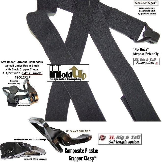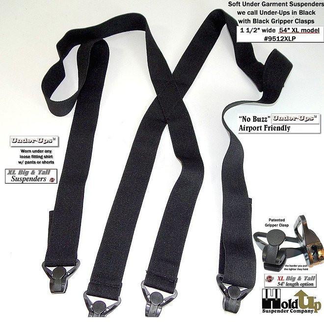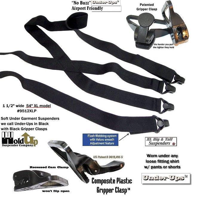 They can be worn under sweaters or jackets in the winter months too. The super soft Made in a soft durable USA poly-blend washable elastic fabric that is 1-1/2" wide and for the tall men. The new Velcro type flush length adjustment system is used in all our Under-UpsTM suspenders to give you a smooth look eliminating the usual adjuster buckle bulge. Now the taller guy has a black suspenders that feels comfortable when worn under your loose fitting shirt. Our customers asked for a no-alarm Airport Friendly Extra Long XL undergarment suspenders in black... and we listened. This extra long 54" length 9512XLB style Under-Ups have a sewn X-back styling and black patented plastic gripper clasps. The black Gripper Clasps will last through years of wear without flying off your pants. Finally a suspender composite plastic airport friendly Clasp that holds tighter the harder you pull on them. These suspenders will not trigger secure building or airport walk through or wand type metal detectors.