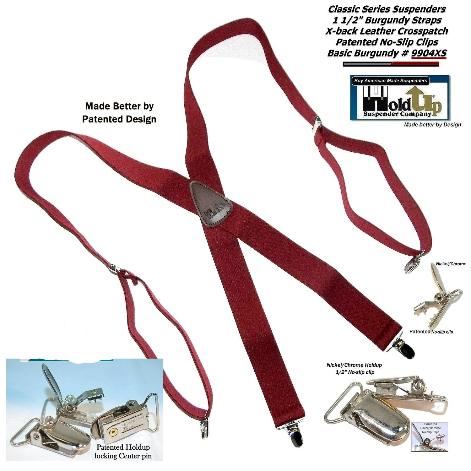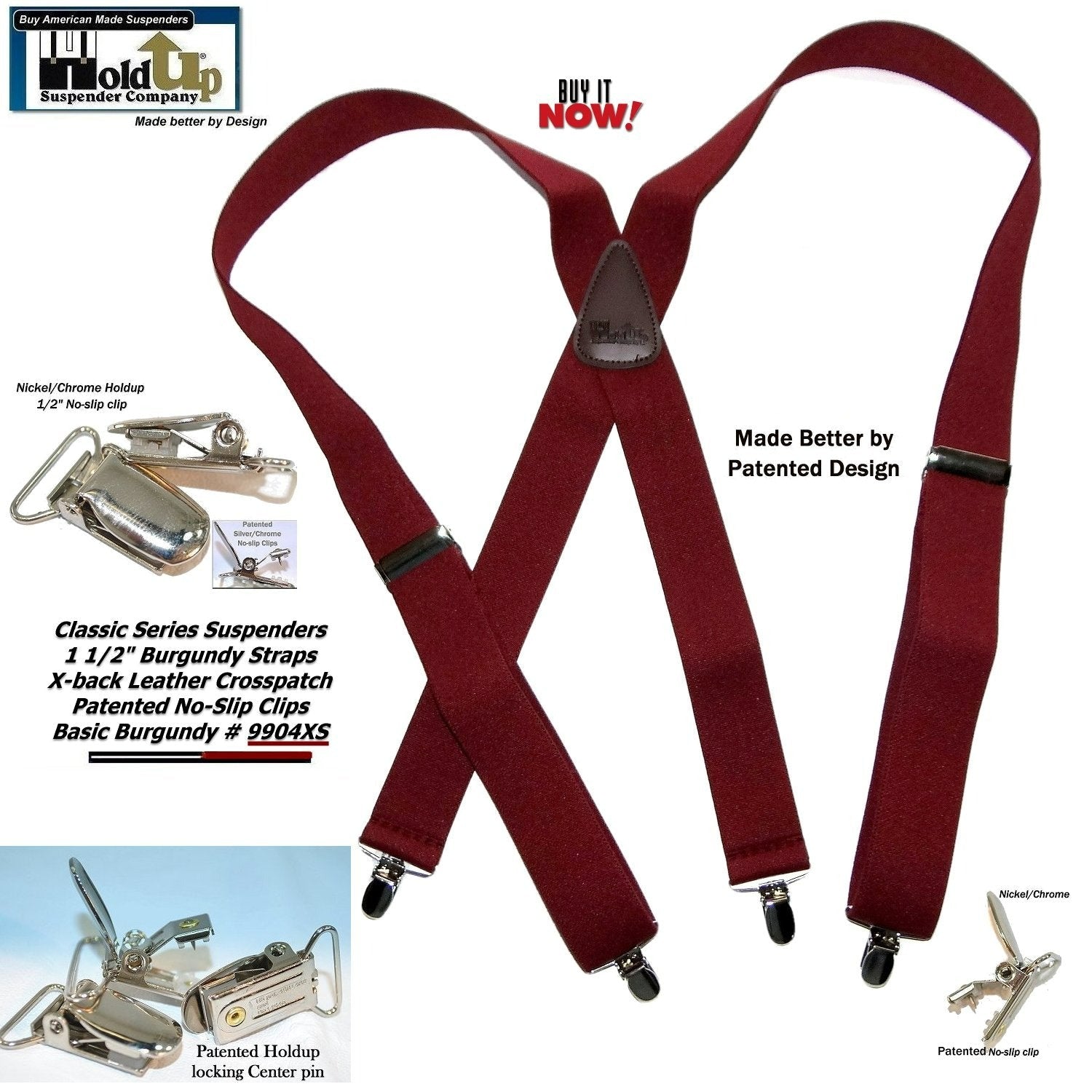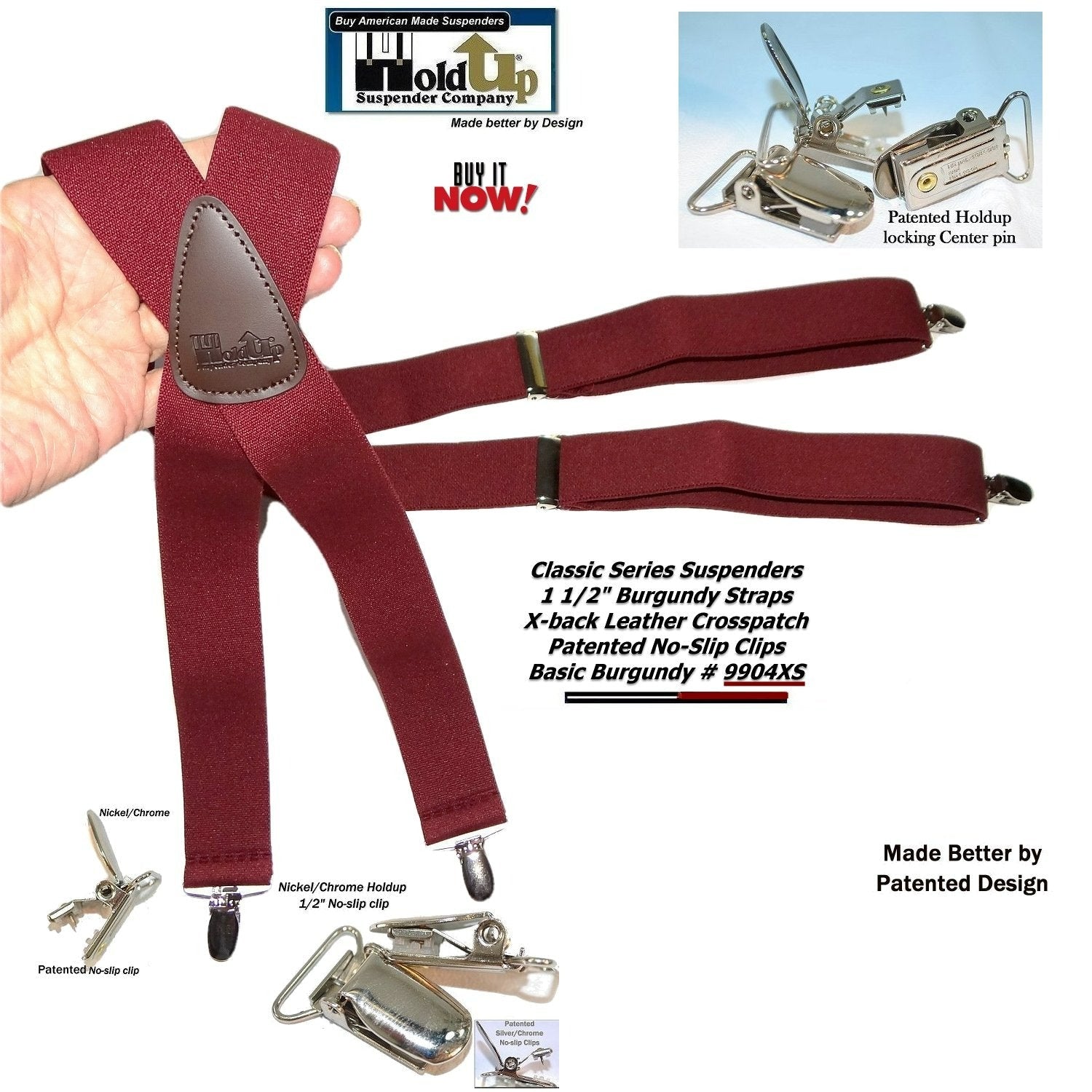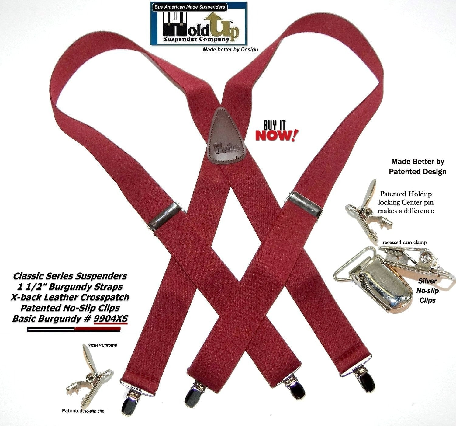 Classic Series Holdup Suspenders now come in a basic dark "Burgundy"  solid color with washable cotton poly-blend straps. These rich burgundy colored Holdups have brown leather X-back style crosspatch embossed with our trademarked Holdup logo. These also have triple plated chrome finished patented NO-SLIP® suspender clips and matching silver-tone strap length adjuster. Our patented chrome-plated clips are guaranteed to never slip, slide, or fly off your pants because of the exclusive needle sharp center locking pin and new slant faced clamp to prevent flipping open while sitting down on couches or car seats. Made with milled elastic poly-blend course weave colorfast fabric straps. These are the best choice in low-cost Holdup brand patented suspenders so you don't have to suffer wiht cheap imported suspenders. These dark burgundy Classic Holdups are 1 1/2" wide, adjustable to 48" in length to fit men to 6" tall and carry a 30 day 100% satisfaction money-back guarantee. Buy using your Amazon or PayPal account or favorite Debit card and all orders get free freight option at secure checkout.