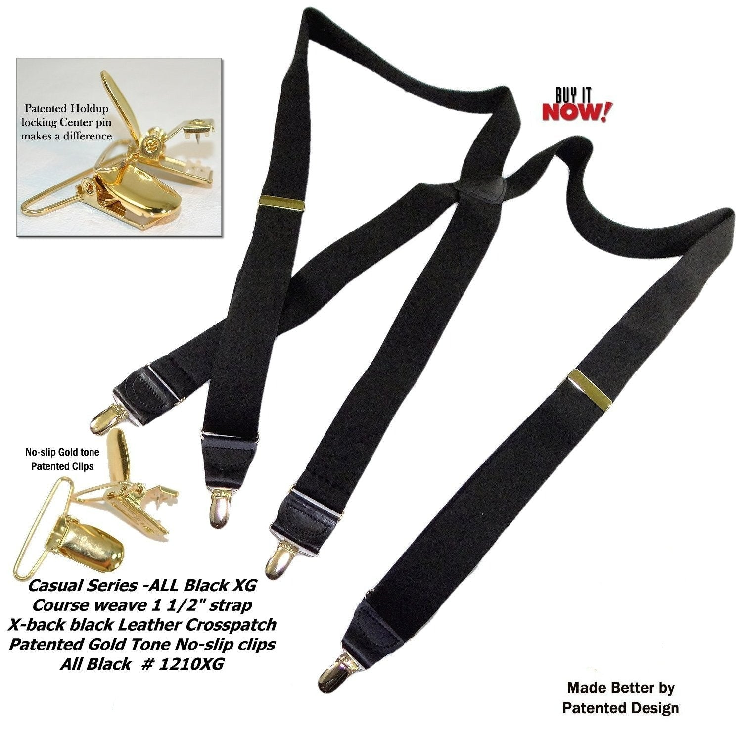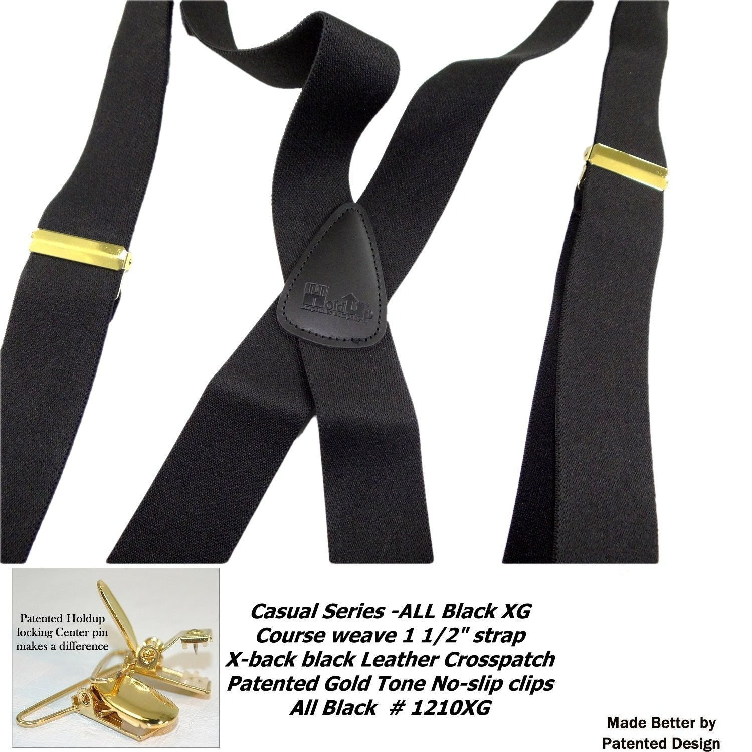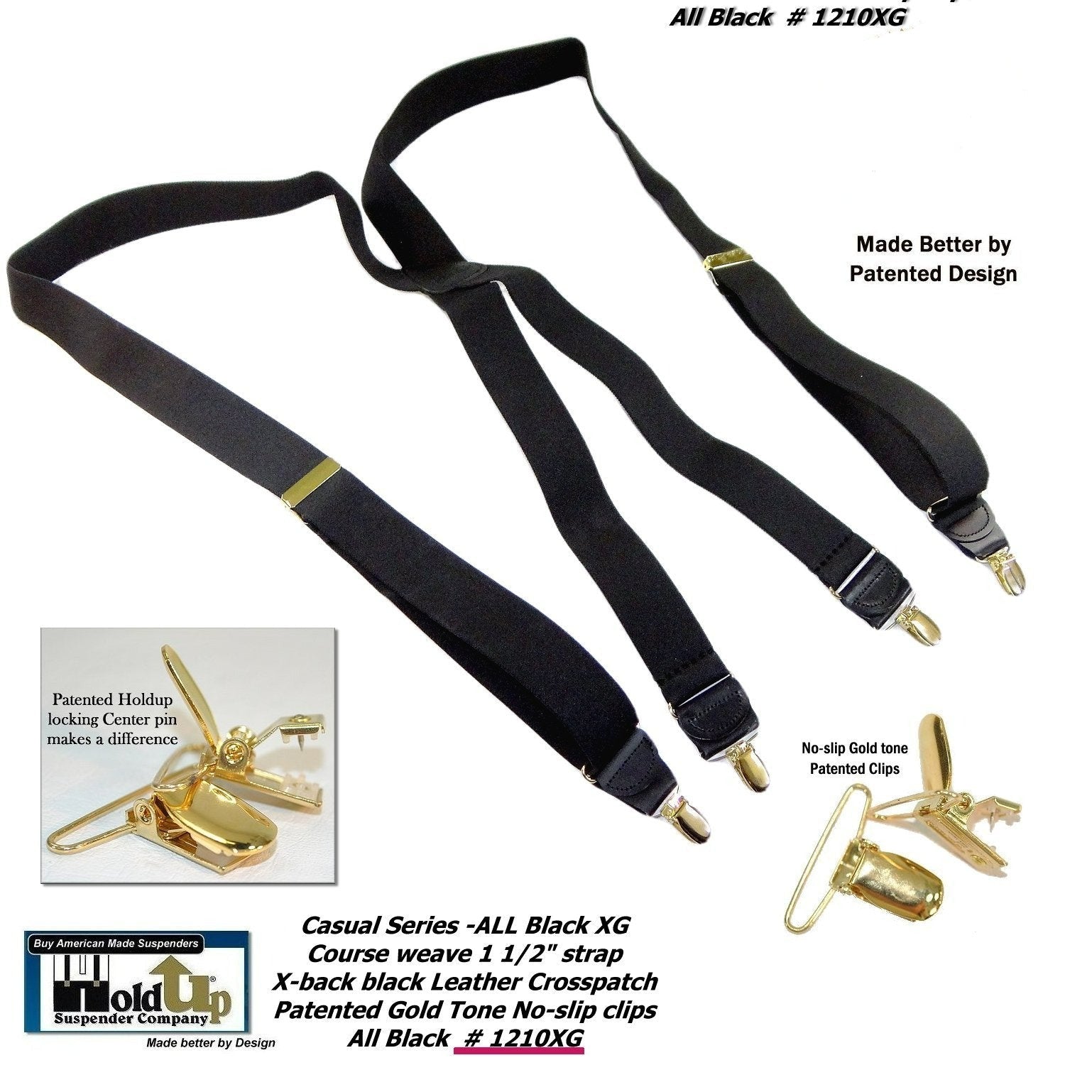 - Holdup Brand All Black X-back Suspenders with gold-tone USA Patented no-slip clips with needle sharp center holding pin