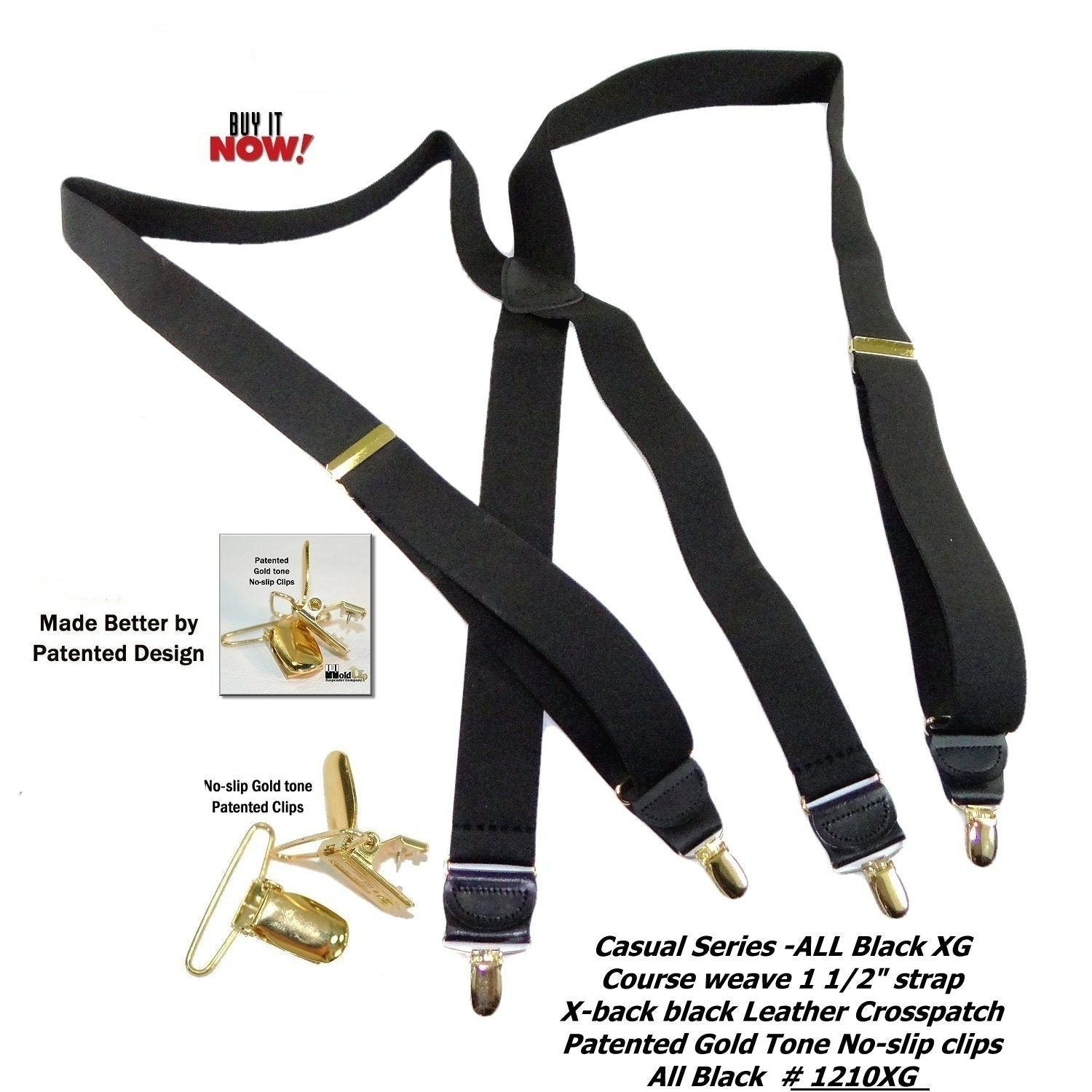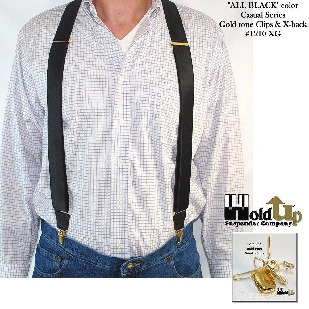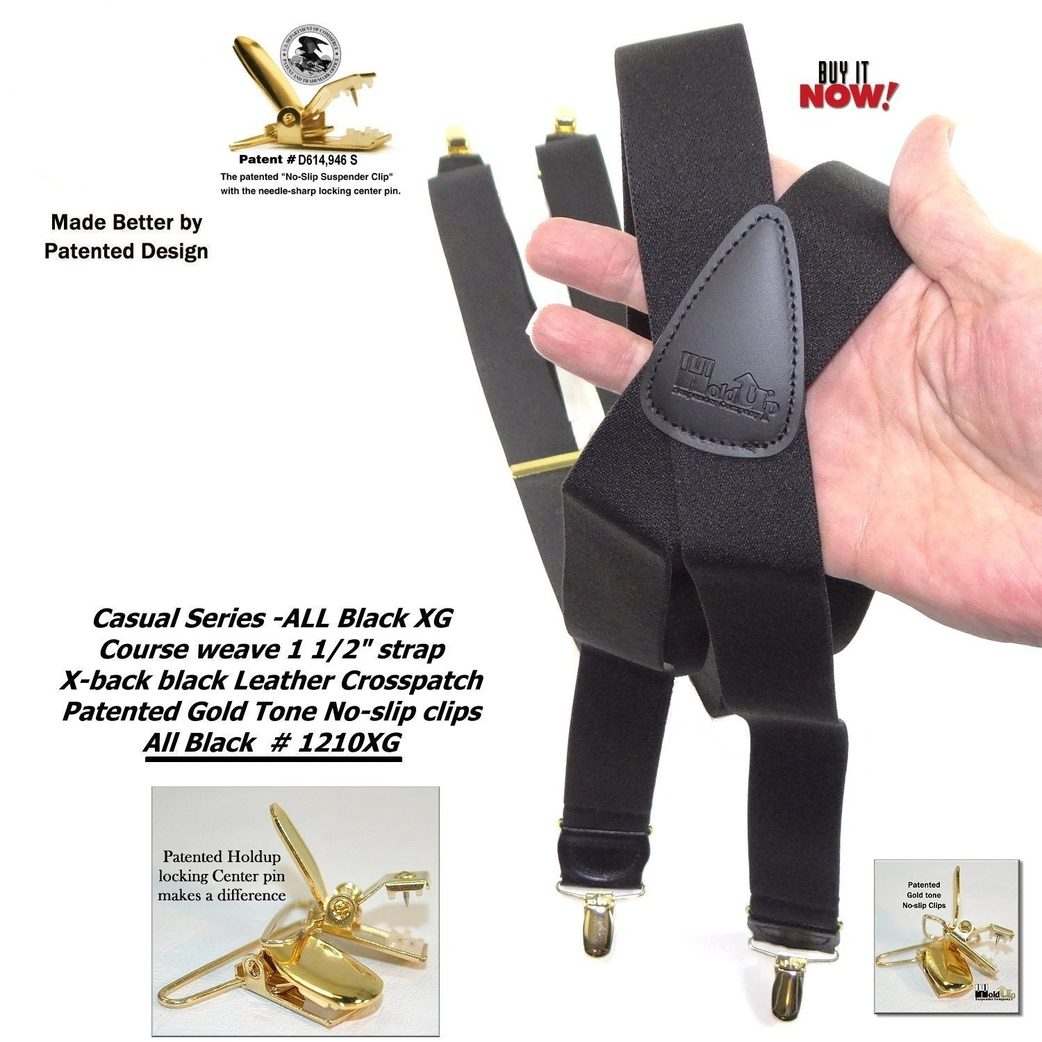 - Holdup Brand All Black X-back Suspenders with gold-tone USA Patented no-slip clips with needle sharp center holding pin