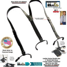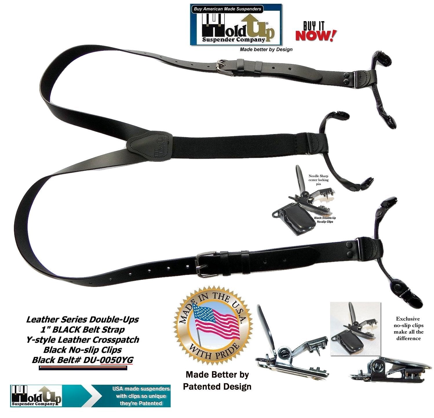 BLACK BELT STRAP STYLE Leather Double-Up Suspenders by Holdup Suspender Company have genuine Bonded leather narrow 1" straps. These Black leather Hold-ups have a 1" width and Easily adjusts to fit men 6 feet tall with 1 1/4" black elastic back for total comfort. These stylish black leather strap suspenders have a logo embossed Y-back crosspatch embossed with our Holdup Logo. The buckle length adjuster makes these fit me over 6 feet tall. The antique pewter buckle length adjuster and black elastic poly-blend black comfort back strap allows you to adjust these leather strap style suspenders to your height. Buy using your PayPal or Amazon account and you get FREE freight at checkout.
