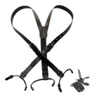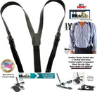 American made Black Belt Strap Style Leather Y-back fancy narrow Suspenders with black no-slip clips and tapered dual clip tab holders.