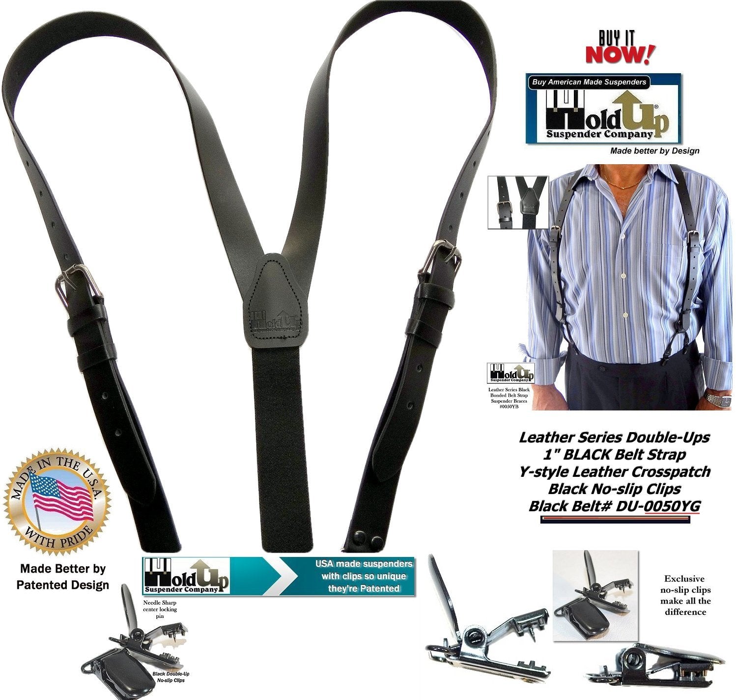 BLACK BELT STRAP STYLE Leather Double-Up Suspenders by Holdup Suspender Company have genuine Bonded leather narrow 1" straps. These Black leather Hold-ups have a 1" width and Easily adjusts to fit men 6 feet tall with 1 1/4" black elastic back for total comfort. These stylish black leather strap suspenders have a logo embossed Y-back crosspatch embossed with our Holdup Logo. The buckle length adjuster makes these fit me over 6 feet tall. The antique pewter buckle length adjuster and black elastic poly-blend black comfort back strap allows you to adjust these leather strap style suspenders to your height. Buy using your PayPal or Amazon account and you get FREE freight at checkout.