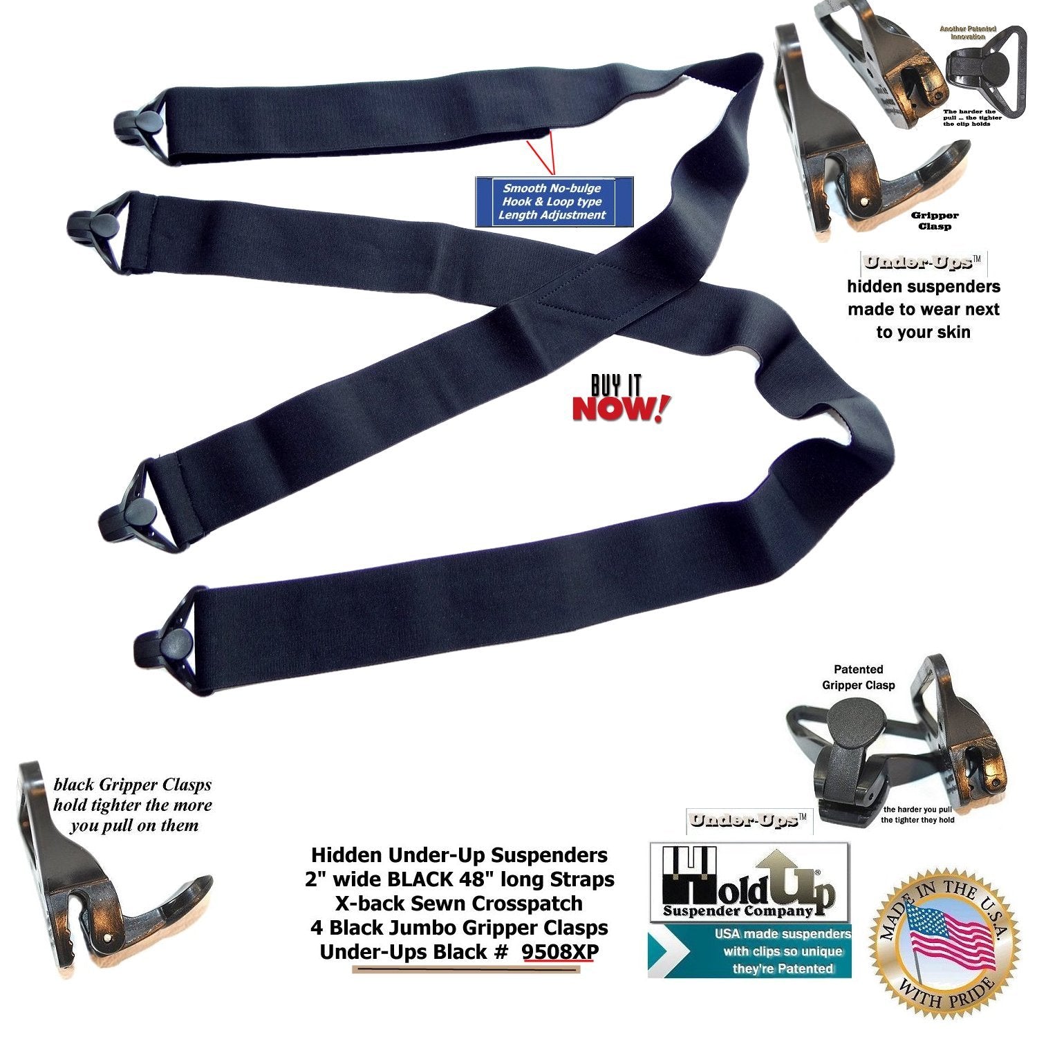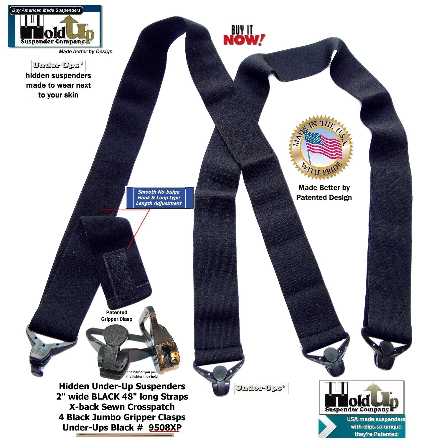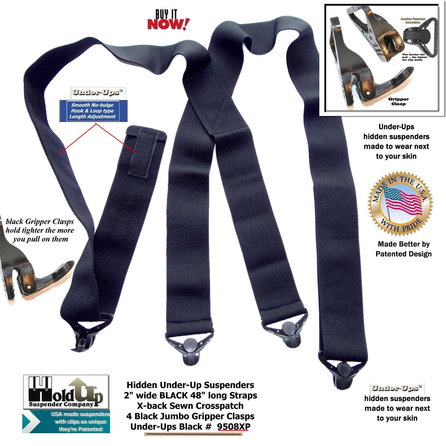 HoldUp Brand Suspenders Now Have 2" Wide All Black Under-Up Suspenders with metal free Jumbo Black Gripper Clasps and they won't trigger metal security point detectors. These Super Soft Suspenders are Made to be worn under your Shirt next to your Skin. Our Under-Up Suspenders are USA Made with a Smooth Cotton Poly-Blend Super Soft Elastic Fabric like a thick Ace Bandage so they are very comfortable. These Suspenders are Perfect for anyone who prefers to wear their Suspenders under their Shirt and are extremely Comfortable. This style Under-Up Suspender feature These Under-Up Suspenders have 4 Jumbo Black Gripper Clasps that Grip tighter the harder you pull on them. Worn with Pants or Short these suspenders are 2" Wide the built-in hook and loop smoothline strap length adjustment system easily adjust to fit men or women up to 6 Feet Tall. The Under-Up Suspenders also feature our Newly Patented flush webbing strap length adjuster design which eliminates the Bulky Plastic adjusters by using built-in Hook and Loop style strap Fastening System to enhance the comfort of these Super Soft Suspenders. Buy a Pair Of Undergarment all Black Suspenders Right HERE at HoldUpSuspender.com using Your Paypal or Amazon account with Free freight offer on all orders.