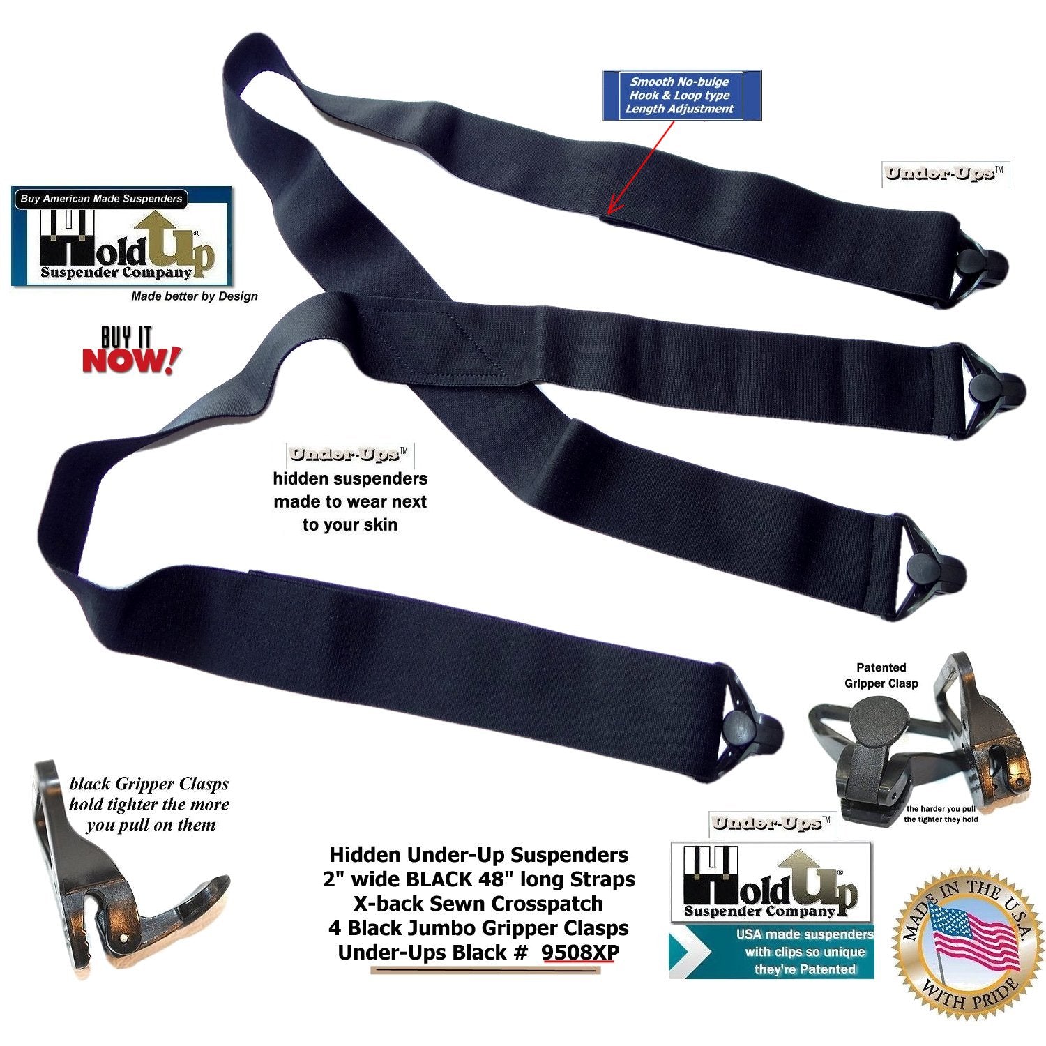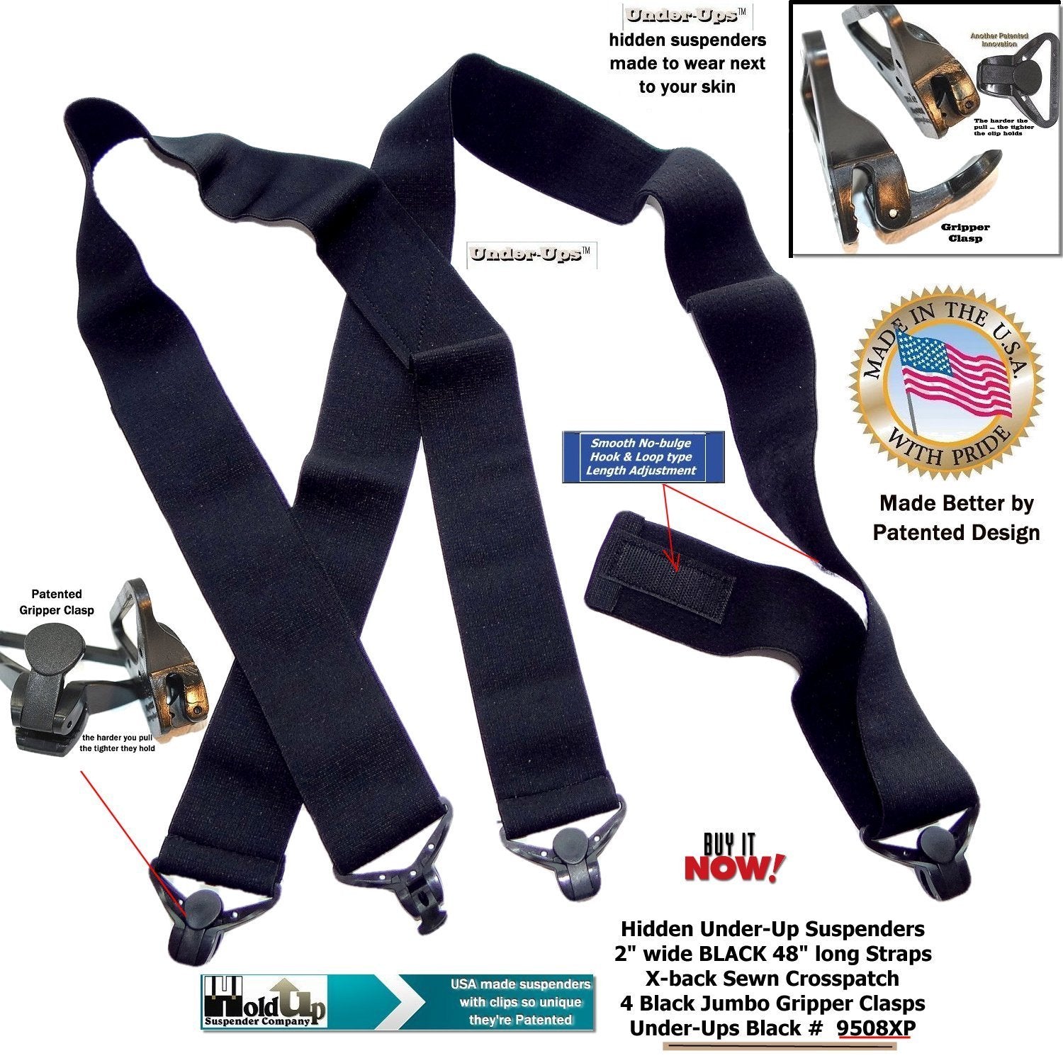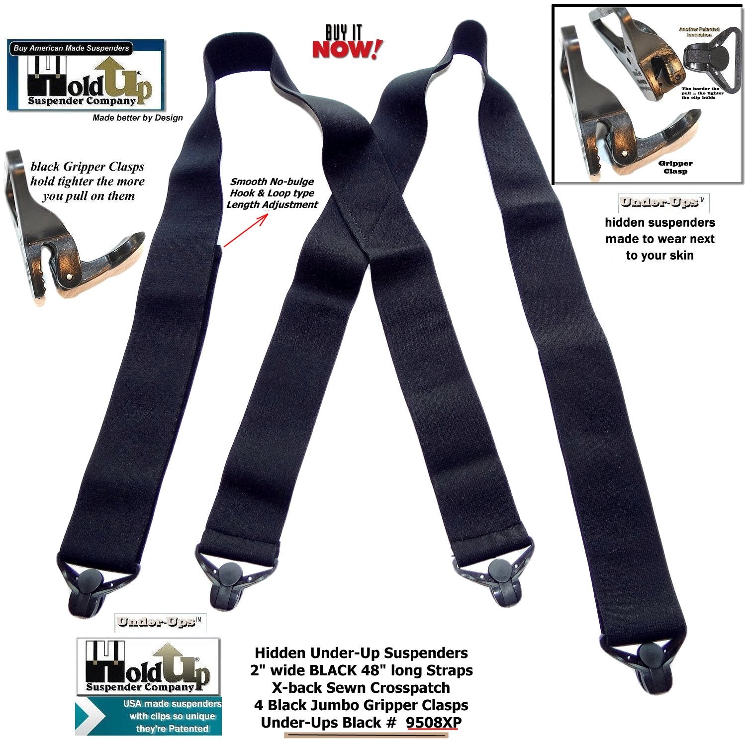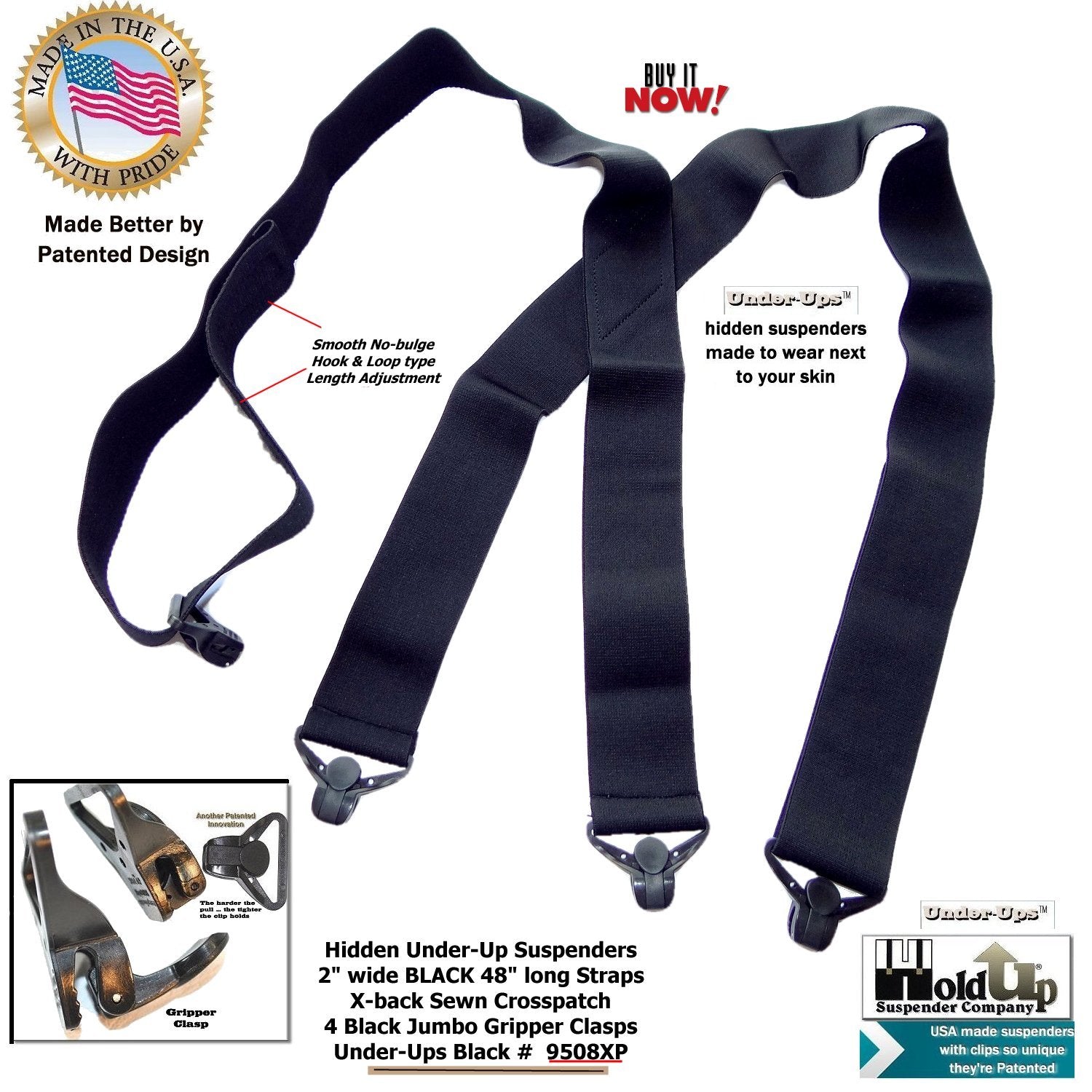 HoldUp Brand Suspenders Now Have 2" Wide All Black Under-Up Suspenders with metal free Jumbo Black Gripper Clasps and they won't trigger metal security point detectors. These Super Soft Suspenders are Made to be worn under your Shirt next to your Skin. Our Under-Up Suspenders are USA Made with a Smooth Cotton Poly-Blend Super Soft Elastic Fabric like a thick Ace Bandage so they are very comfortable. These Suspenders are Perfect for anyone who prefers to wear their Suspenders under their Shirt and are extremely Comfortable. This style Under-Up Suspender feature These Under-Up Suspenders have 4 Jumbo Black Gripper Clasps that Grip tighter the harder you pull on them. Worn with Pants or Short these suspenders are 2" Wide the built-in hook and loop smoothline strap length adjustment system easily adjust to fit men or women up to 6 Feet Tall. The Under-Up Suspenders also feature our Newly Patented flush webbing strap length adjuster design which eliminates the Bulky Plastic adjusters by using built-in Hook and Loop style strap Fastening System to enhance the comfort of these Super Soft Suspenders. Buy a Pair Of Undergarment all Black Suspenders Right HERE at HoldUpSuspender.com using Your Paypal or Amazon account with Free freight offer on all orders.