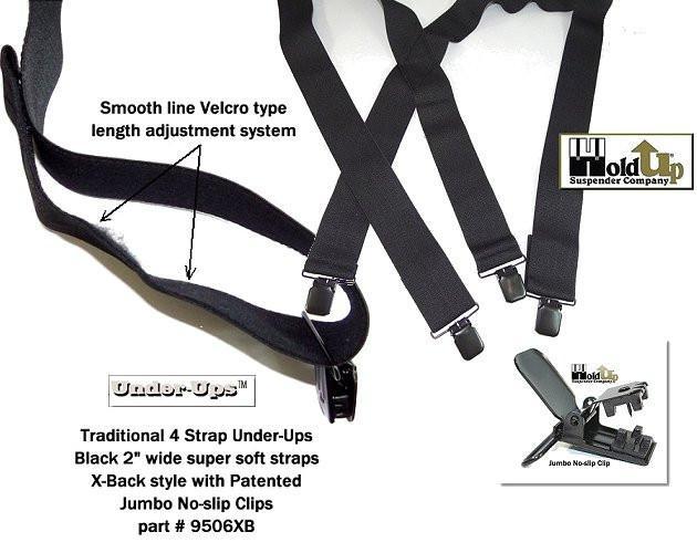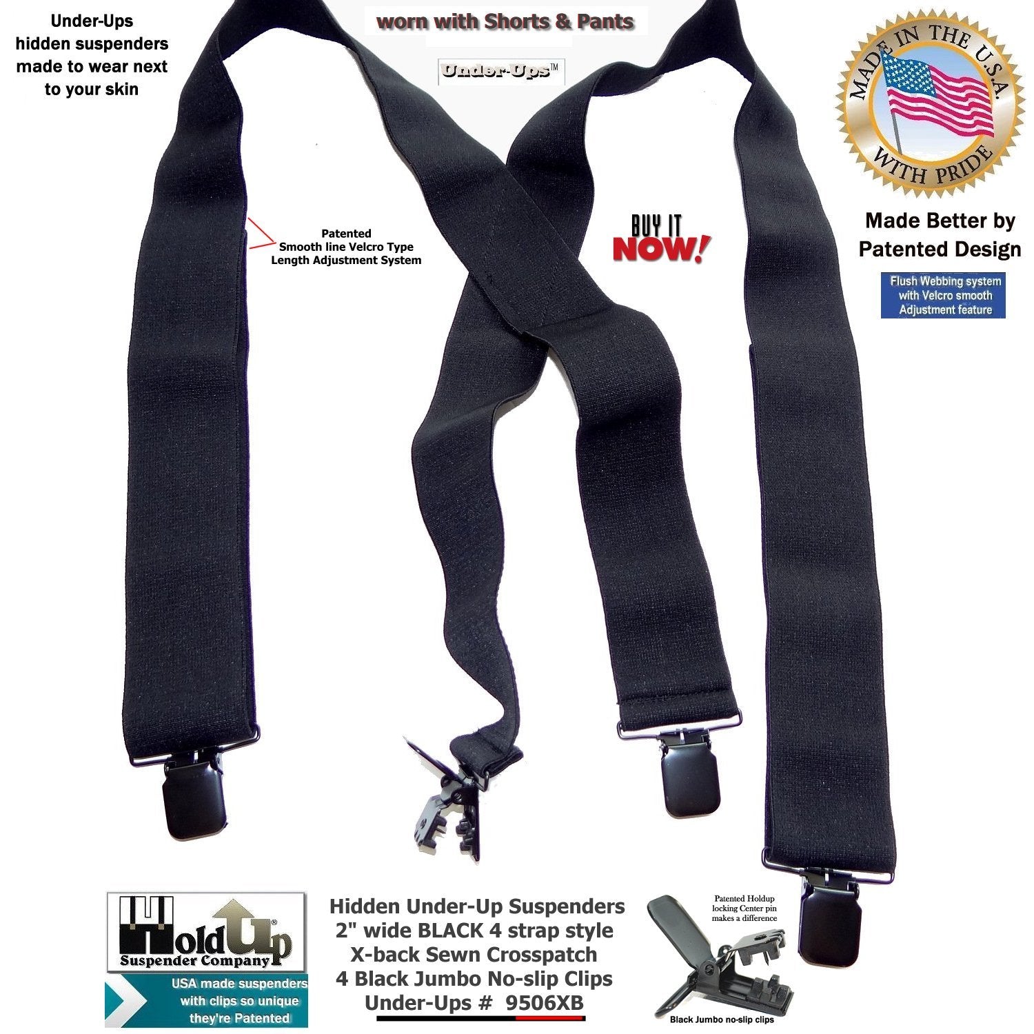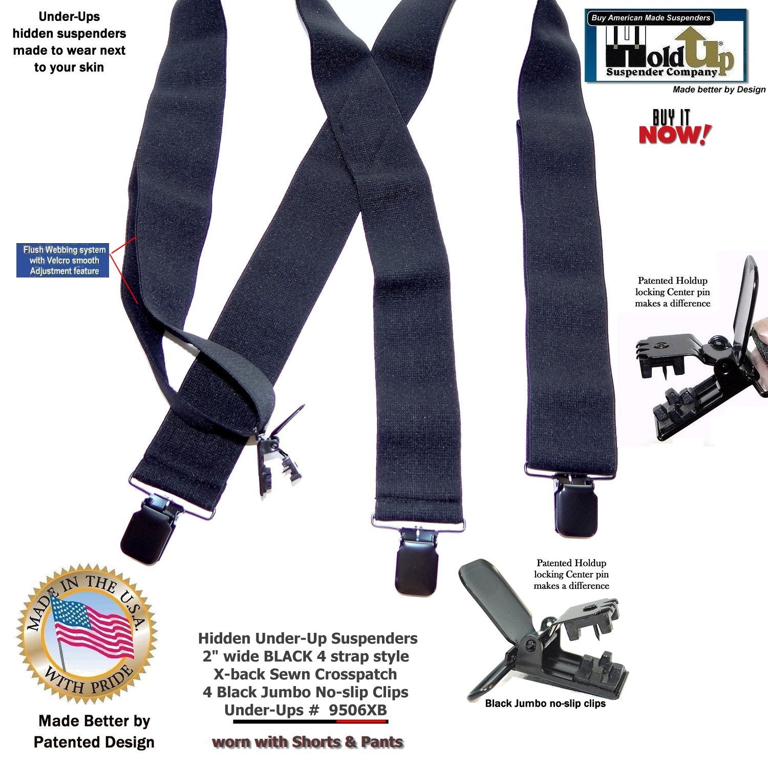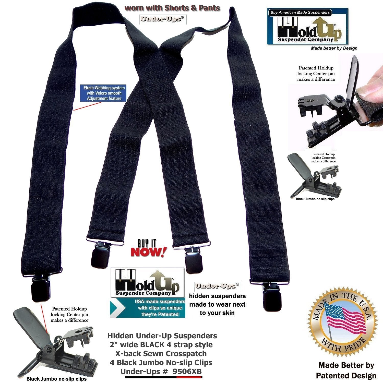 - 4 patented Jumbo Hold-up® Patented No-slip® metal clips with needle sharp center pin on these all black wider undergarment suspenders are made to wear under your shirt or jacket with pants or shorts