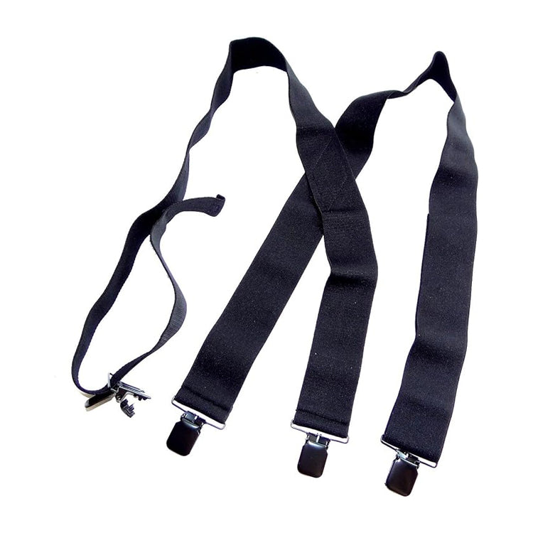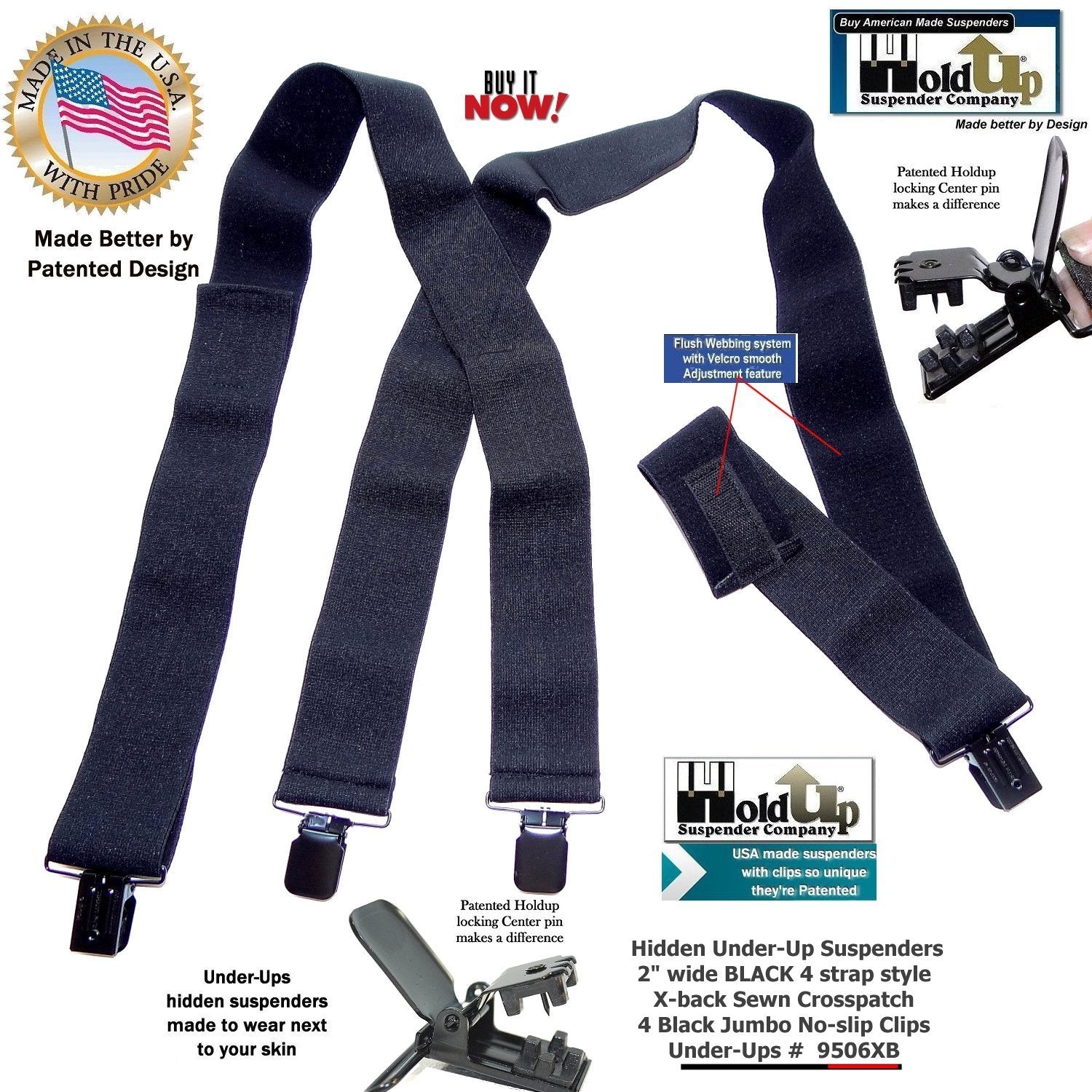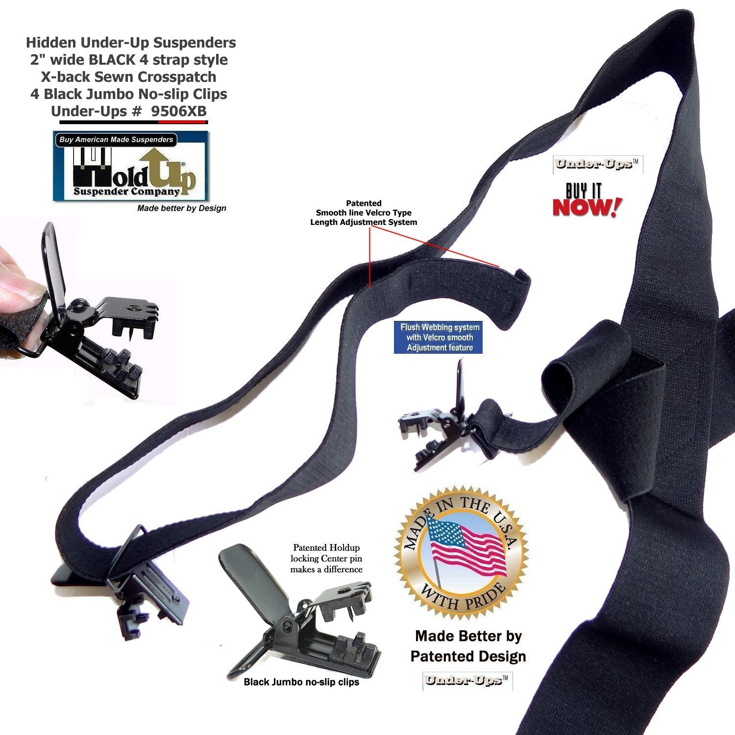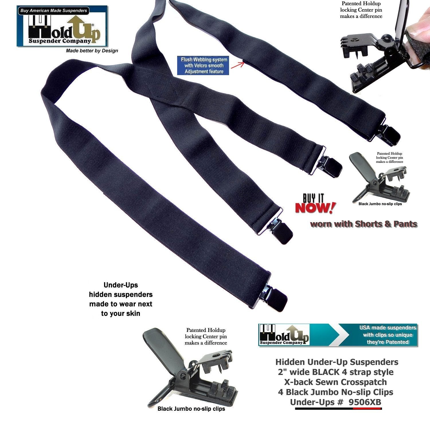 - 4 patented Jumbo Hold-up® Patented No-slip® metal clips with needle sharp center pin on these all black wider undergarment suspenders are made to wear under your shirt or jacket with pants or shorts