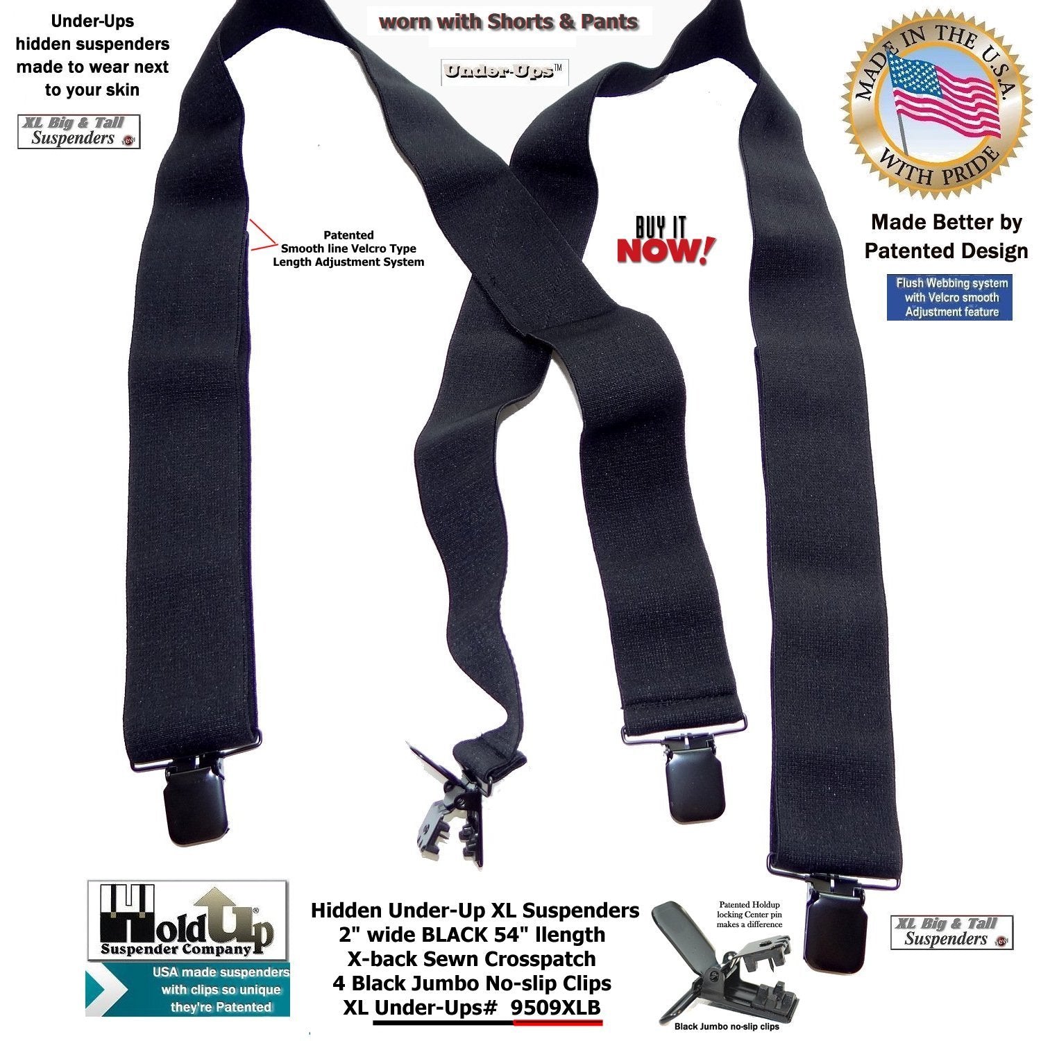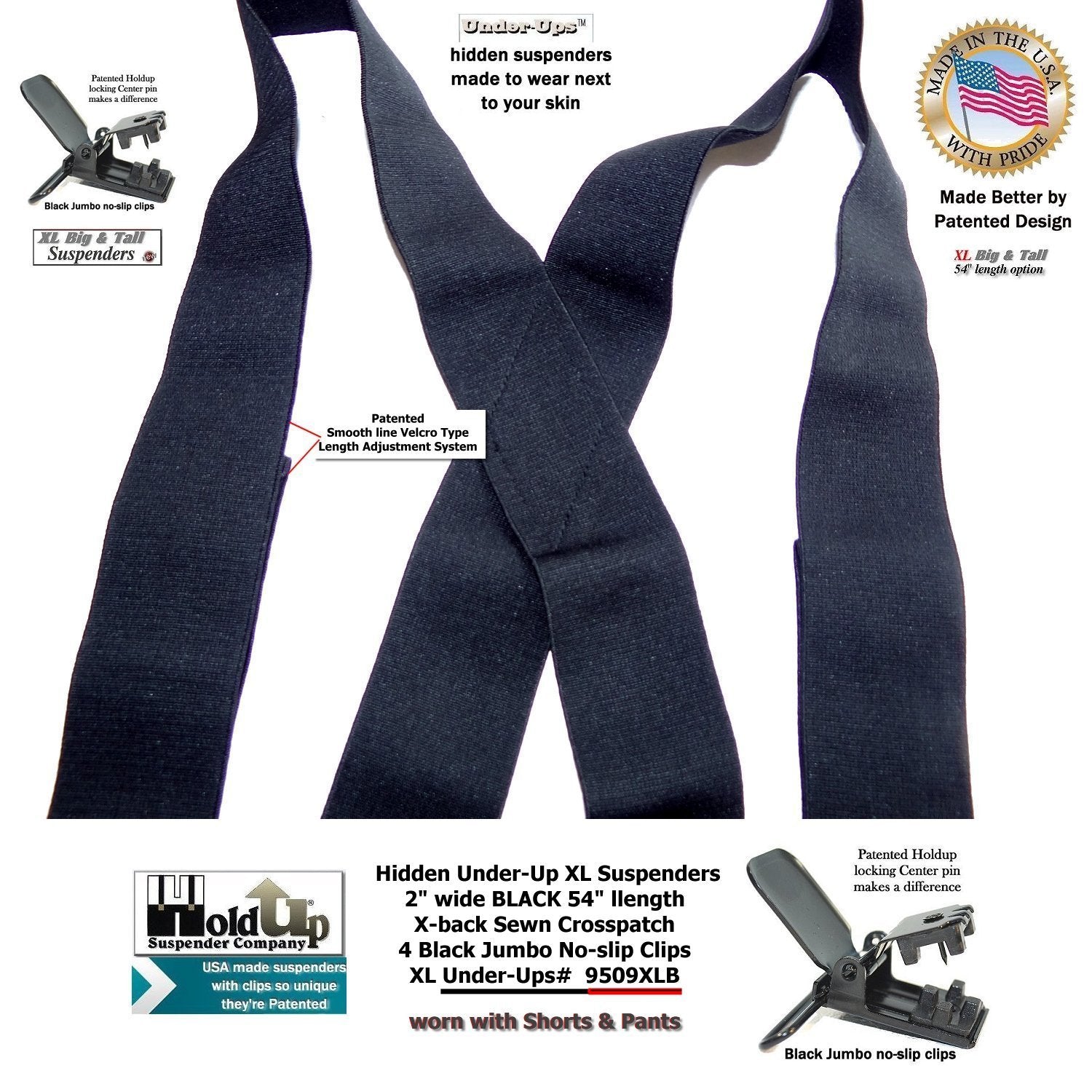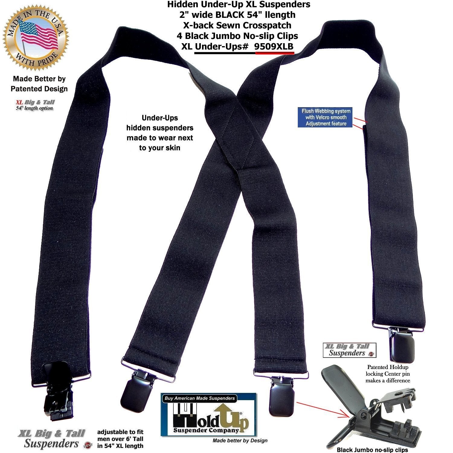 The super soft Made in a soft durable USA poly-blend washable elastic fabric that is 2" wide and the length is adjustable to fit men to 6' 5" or the heavy set men. The new Velcro type flush length adjustment system is used in all our Under-UpsTM suspenders to give you a smooth look eliminating the usual length adjuster buckle bulge. Now the taller guy has a black wide suspenders that feels comfortable when worn under your loose fitting shirt. Our loyal brand customers asked for an XL undergarment suspenders in black... and we listened offering these in several models. This extra long 54" length 9509XLB style Under-Ups have a sewn X-back styling and black jumbo NO-SLIP patented clips that will last through years of wear without flying off your pants. Finally a invisibleĀ black XL suspender for people of color who asked by our Under-UpsTM in black with a longer 54" length for the big and tall man