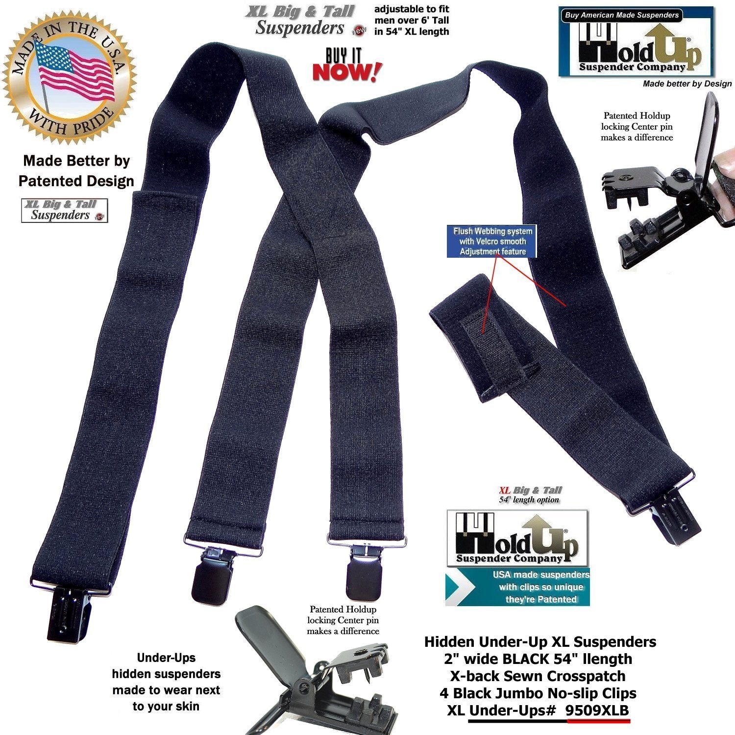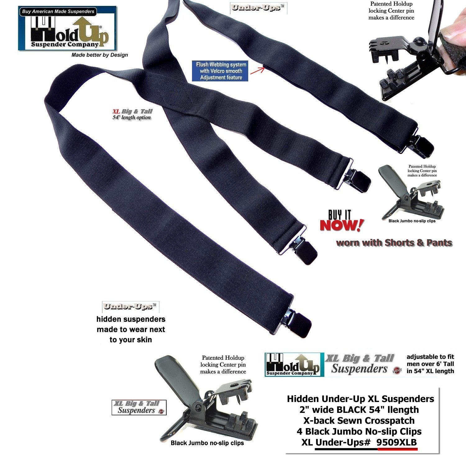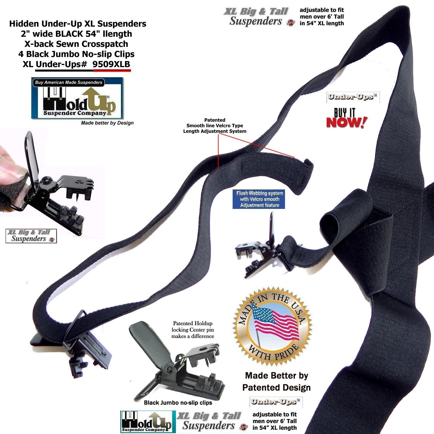 The super soft Made in a soft durable USA poly-blend washable elastic fabric that is 2" wide and the length is adjustable to fit men to 6' 5" or the heavy set men. The new Velcro type flush length adjustment system is used in all our Under-UpsTM suspenders to give you a smooth look eliminating the usual length adjuster buckle bulge. Now the taller guy has a black wide suspenders that feels comfortable when worn under your loose fitting shirt. Our loyal brand customers asked for an XL undergarment suspenders in black... and we listened offering these in several models. This extra long 54" length 9509XLB style Under-Ups have a sewn X-back styling and black jumbo NO-SLIP patented clips that will last through years of wear without flying off your pants. Finally a invisibleĀ black XL suspender for people of color who asked by our Under-UpsTM in black with a longer 54" length for the big and tall man