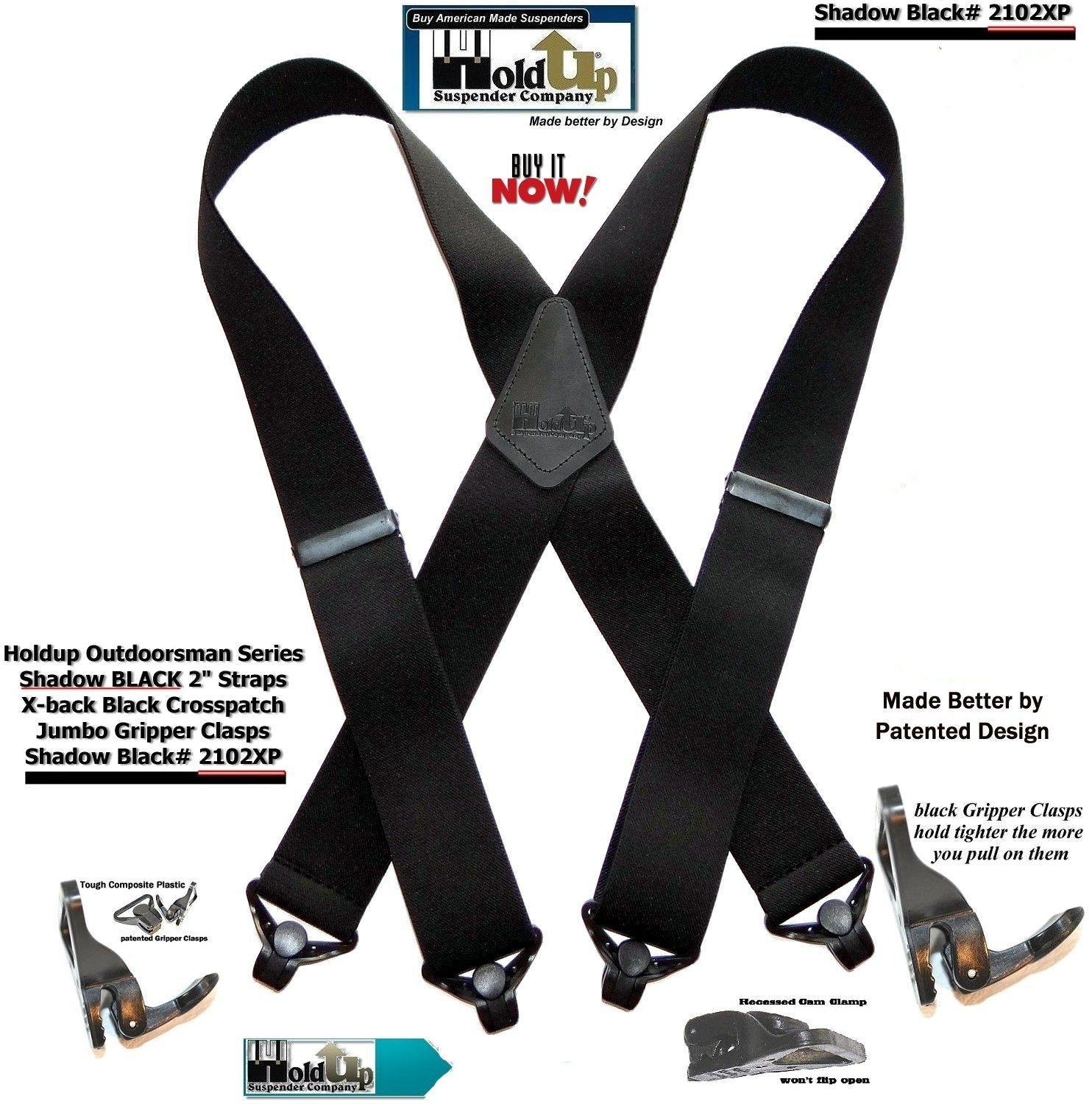 Holdup brand Shadow Black Outdoorsman X-back suspenders for handymen and Outdoorsmen need extra Holdup Power. These Heavy Duty rugged all-black comfortable HD suspenders are specifically designed for outdoor use in the harshest of environments where the 2" webbing and heavy-duty composite plastic GRIPPER CLASP gives extra holding power and all-day comfort. Motorcycle Bikers & construction workers love these too...These are 2" wide and 48" long (adjustable to fit up to a 6-foot tall person). Perfect gift for the outdoorsman that knows the limitations of conventional suspenders. All Holdup suspenders/braces are made of materials that are carefully chosen for elastic retention, extra holding power, and come with a Gripper Clasp guaranteed to never slip, slide, or fly off your pants! The patented plastic gripper clasps are cam activated which means the harder you pull on them the tighter they grip. Great for skiers, 4 wheeling outdoorsman, backpackers, and the motorcycle bikers love 'em too! We have an XL model also sold here that are great for the Big & Tall man who wants the comfort and security of this model suspender. So, Why not buy a pair of all black work suspenders made better by our patented design? Buy using your Amazon or PayPal account or any Debit/Credit card with free freight offer at checkout on all orders place here!