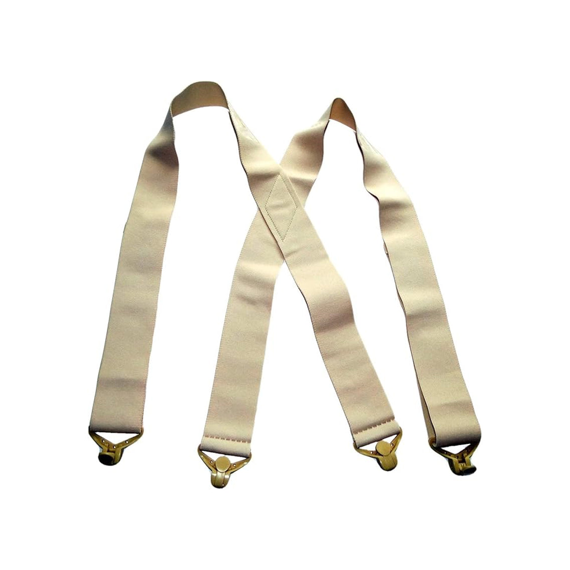 - Patented Smooth Line Hook and Loop Length Adjustment System on these beige no-alarm airport friendly X-back suspenders won't show bulges under your shirt