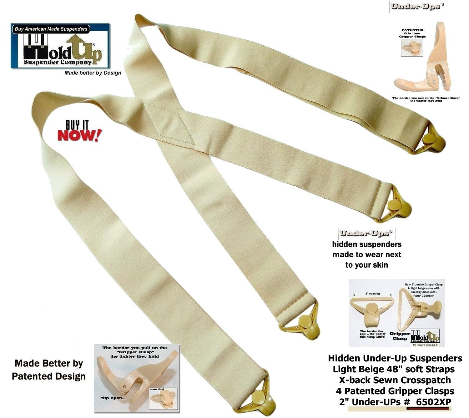 HoldUp Brand is Now Featuring Our "N0-Show" undergarment Soft Fabric Light Beige Suspenders with Our Exclusive Cam-Activated Composite Plastic Beige Gripper Clasps To Comfortable Wear under Your Loose Fitting Shirts with your favorite pair of Pants or Shorts. These Under-Up Series Beige Suspenders are 2" wide so they'll HoldUp any individuals pants or shorts in total comfort. We now have these in stock ready for shipping from our Amazon shop. Hold Up Brands Under-Up Series Suspenders are 2" wide, 48" long and Feature Our Patented Smooth Line Velcro "No Bulge Line" Length Adjustment System. The Patented Plastic Gripper Clasps are Cam-activated which means The Harder you pull on them The Tighter they Grip. These Under-Up suspenders come With a Smooth Cotton Poly-Blend Ace Bandage Type Soft Elastic Fabric So they are Extremely Comfortable on Skin Contact For an Unnoticeable wear. These Undergarment Beige Suspenders are exceptionally soft. They come in the traditional X-back style Without the leather Crosspatch for a " No-Show" invisible Appearance when worn under your shirt. These Hidden Under your shirt Suspenders are also Airport Friendly Meaning they can be worn under loose fitting shirts and you absolutely will not have to worry about The Plastic Claps triggering any metal detectors. They're great for frequent Airport Travelers or those entering secure buildings with metal detector checkpoints. These Undergarment Beige Suspenders are Hand washable and you drip dry them. Buy here in our HoldupSuspenders.com Web shop using your PayPal or Amazon account and get Free standard shipping to your door during secure checkout.