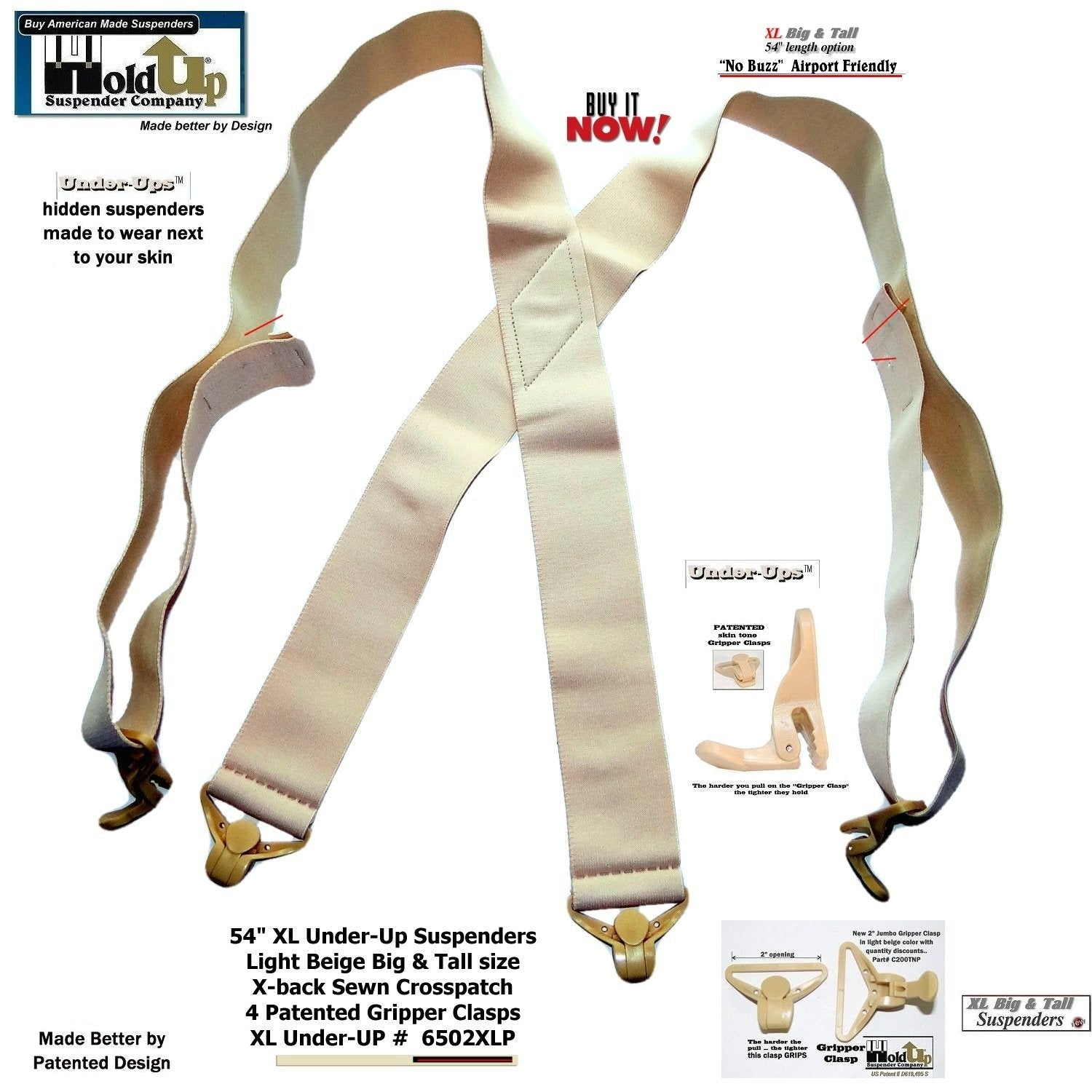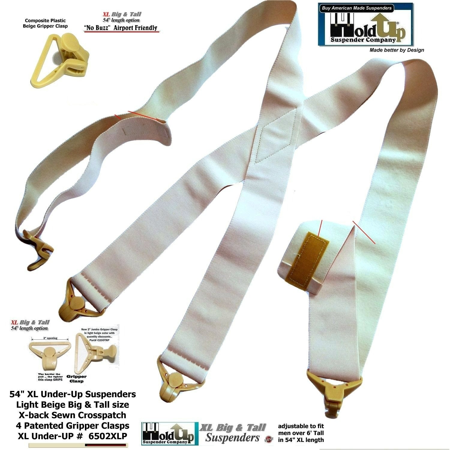 The HoldUp Brand Under-Up Series Beige Suspenders with Jumbo Composite plastic Gripper Clasps that won't trigger metal detectors at Airports or when entering secure buildings with security checkpoints.