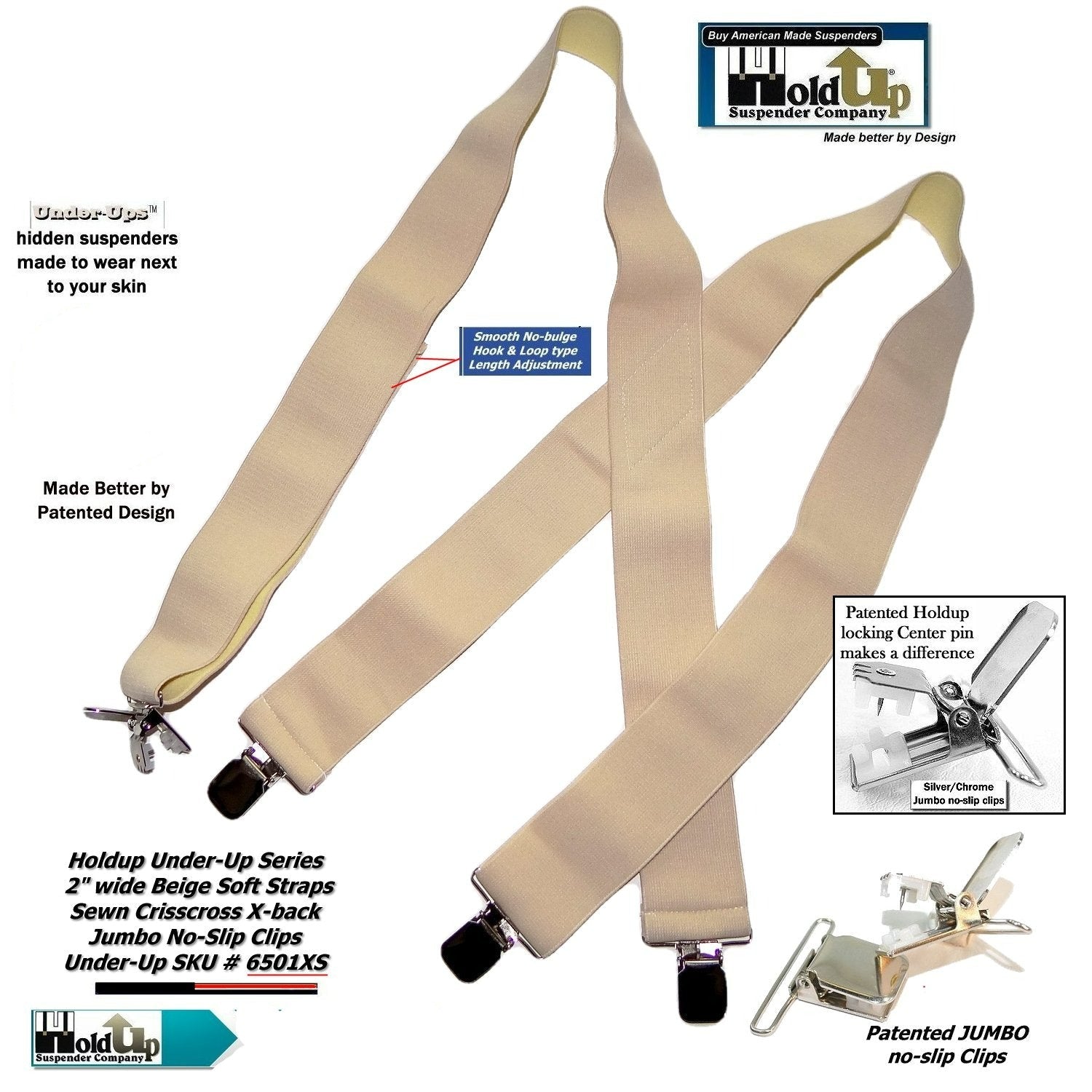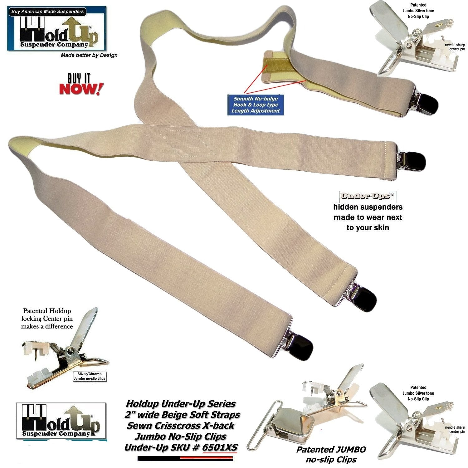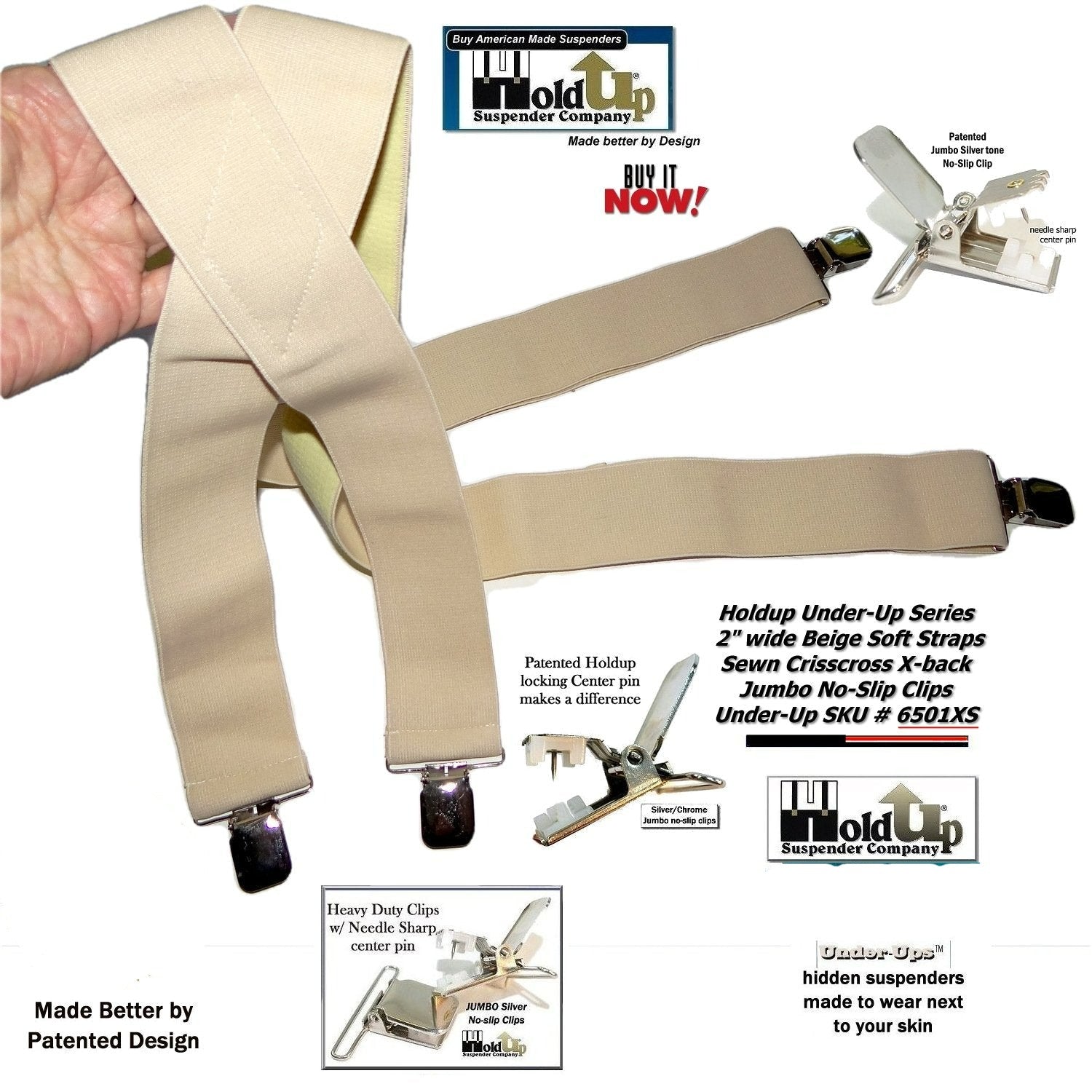 Looking for conventional X-back style HoldUp undergarment soft fabric suspenders with our exclusive Jumbo Silver Tone NO-SLIP Holdup clips for wearing under any loose fitting shirt? These are 2" wide so they'll HoldUp the bigger man's pants or shorts in total comfort. We now have these in stock ready for shipping from HoldupSuspenders.com webshop. These beige HD UnderUps have 2" wide Cotton Poly-blend thick Ace Bandage type hand-washable straps with a patented smoothline Hook-n-loop "no bulge line" strap length adjustment system. Beat the heat as these are perfect for wearing under any loose fitting summer shirts with pants or shorts. These have super soft undergarment elastic fabric in traditional X-back style. These can be worn under shirts and are made by Patented Design. These are so comfortable you'll hardly notice you're wearing them. Buy several of trademarked Under-Ups here in various styles using your Amazon or PayPal account and get FREE Freight offer at checkout.