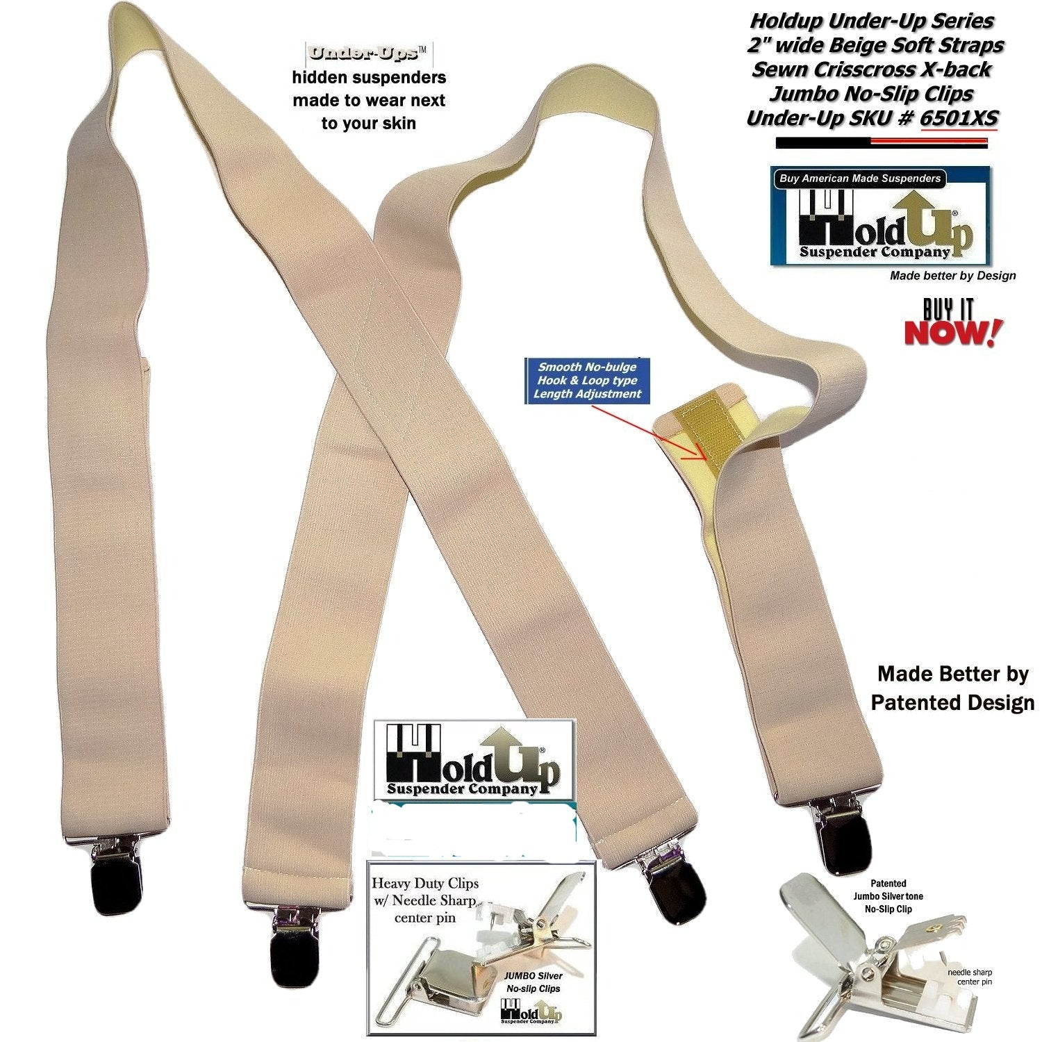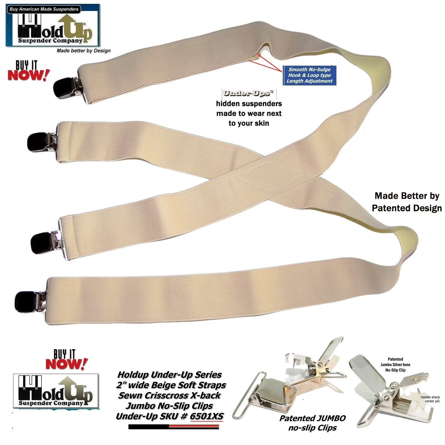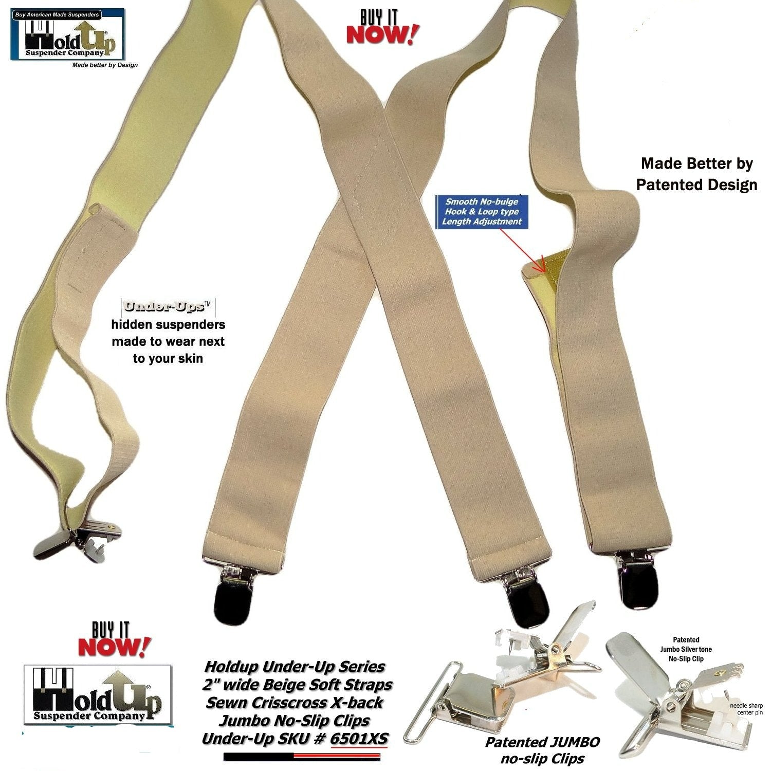 Looking for conventional X-back style HoldUp undergarment soft fabric suspenders with our exclusive Jumbo Silver Tone NO-SLIP Holdup clips for wearing under any loose fitting shirt? These are 2" wide so they'll HoldUp the bigger man's pants or shorts in total comfort. We now have these in stock ready for shipping from HoldupSuspenders.com webshop. These beige HD UnderUps have 2" wide Cotton Poly-blend thick Ace Bandage type hand-washable straps with a patented smoothline Hook-n-loop "no bulge line" strap length adjustment system. Beat the heat as these are perfect for wearing under any loose fitting summer shirts with pants or shorts. These have super soft undergarment elastic fabric in traditional X-back style. These can be worn under shirts and are made by Patented Design. These are so comfortable you'll hardly notice you're wearing them. Buy several of trademarked Under-Ups here in various styles using your Amazon or PayPal account and get FREE Freight offer at checkout.