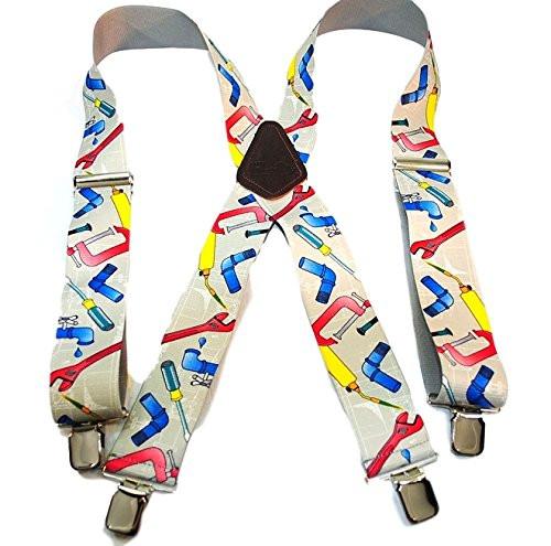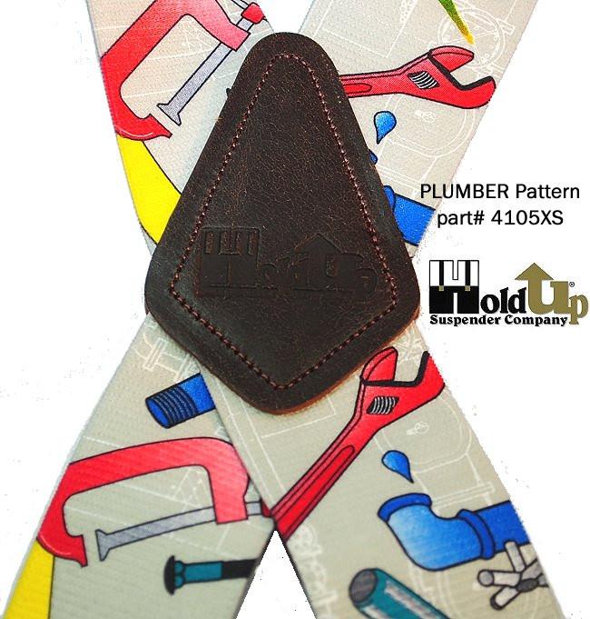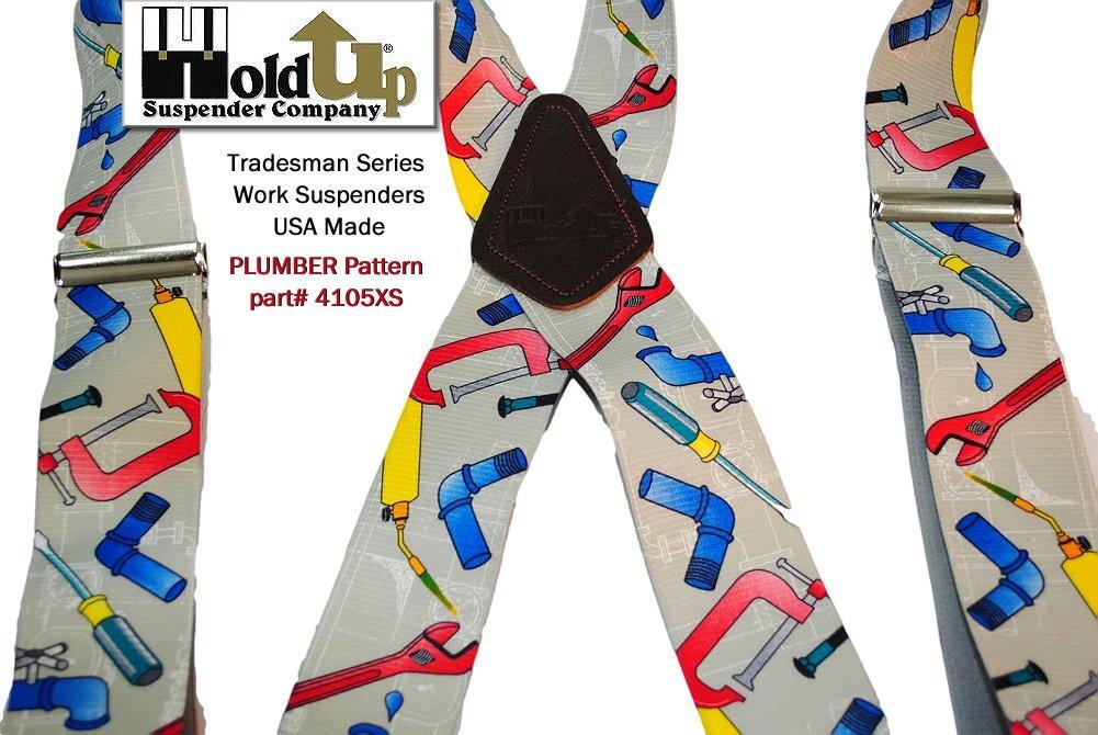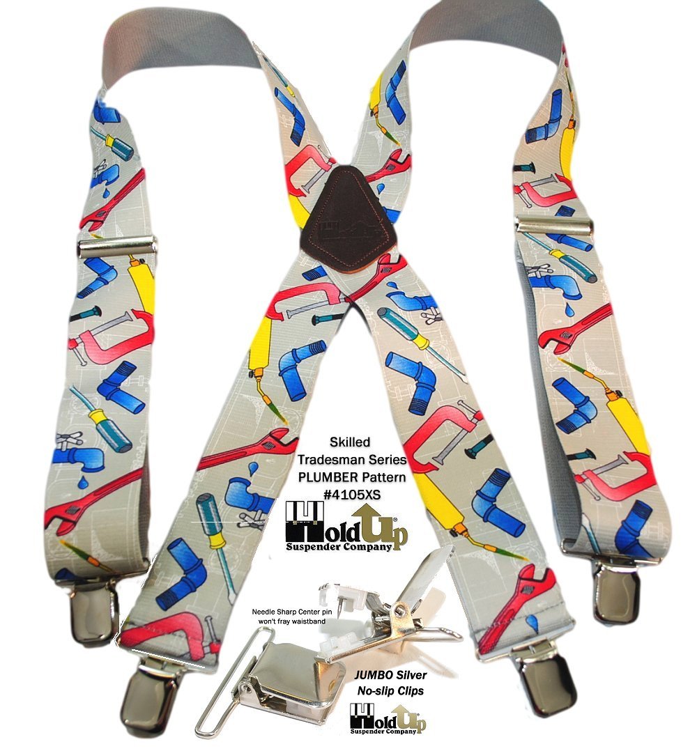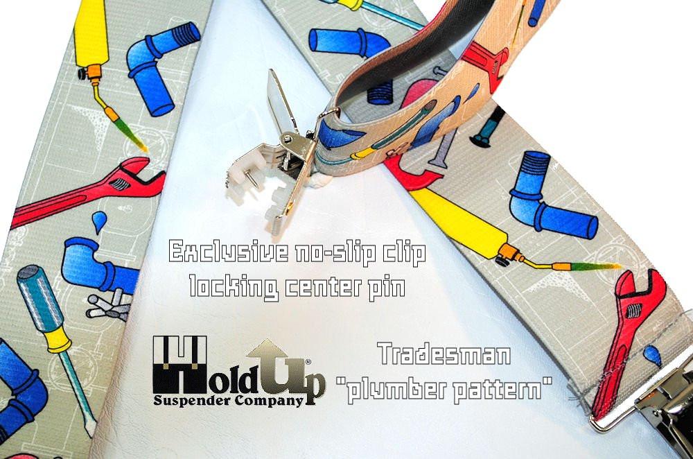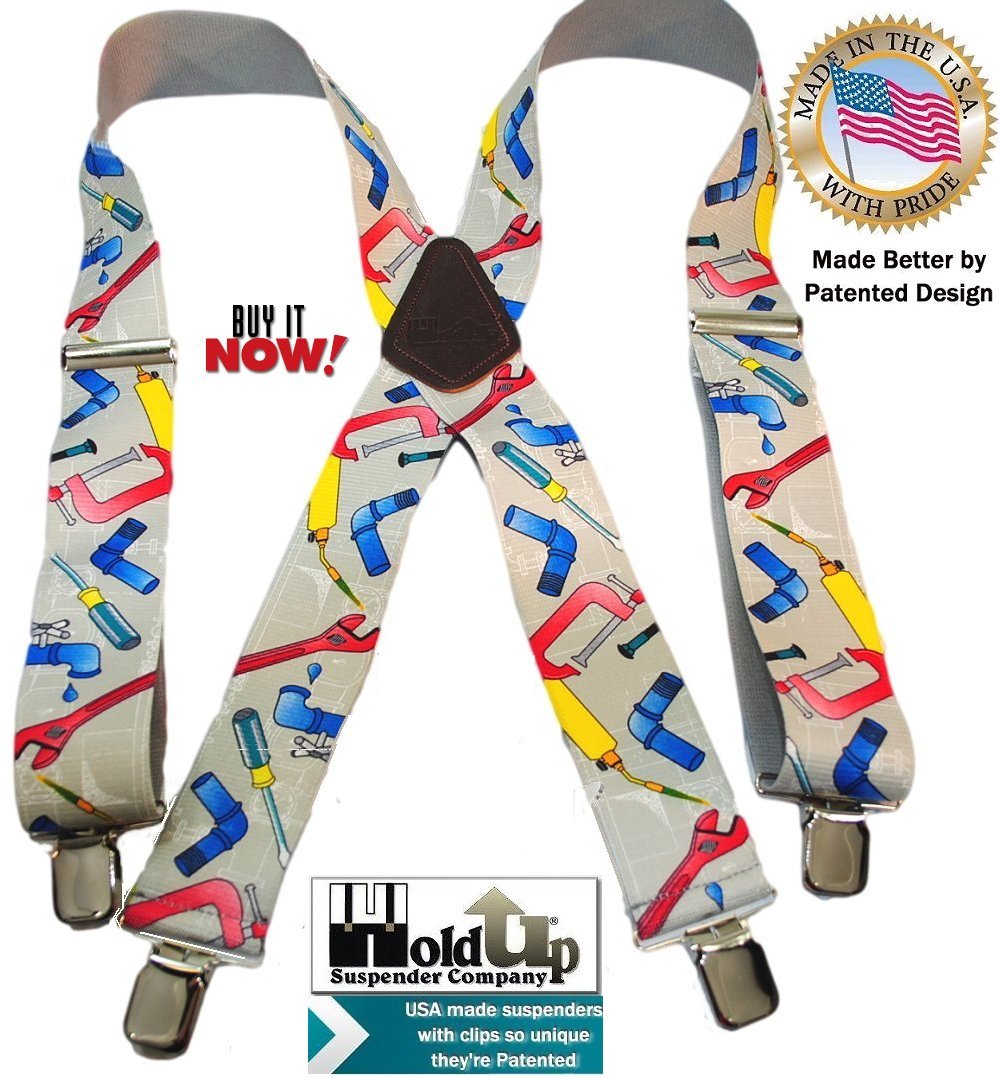 USA made 2" wide and 48" long Tradesman Series PLUMBER pattern Holdup work suspenders are specifically designed for securely holding up a working man's pants. With everything imaginable hanging from your trousers it's hard to keep them up with just an ordinary belt. The Tradesman suspender, shown here in the Plumber pattern, is specially designed with wider 2" straps and our patented no slip silver-tone metal JUMBO clip to assure your pants are Always Up while on the job! These are adjustable in length to 48" so they fit men over 6 feet tall.. These make perfect gifts for that hard working man who knows the limitations of conventional suspenders. All Hold-Upreg; brand suspenders use materials that are carefully chosen for long term elasticity, durability and a patented clip design guaranteed to not slip, slide, or fly off your work pants. These make great appreciation gifts for those handymen in your life. 2x4 Tradesman series work suspenders are designed for holding up the extra weight of tool belt holders and the variety of items workers attachment to their belts like cellphones, tools, and electrical tape rolls. Designed for maximum holding power and the plumbers, hubbies or home handymen will love wearing these at work. Unconditional 30 day money back guarantee. You'll love these or we'll give gladly refund your money. Hold-Up Suspender Company has the first suspender clip patent in 124 years to back up our USA made suspenders sold here at our Amazon web shop.