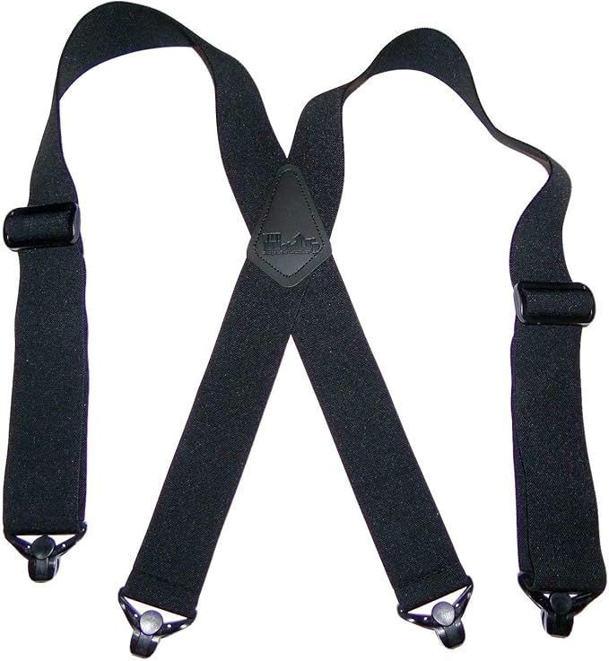 - 2" extra wide and 54" extra long black traveler suspenders with plastic gripper clasps