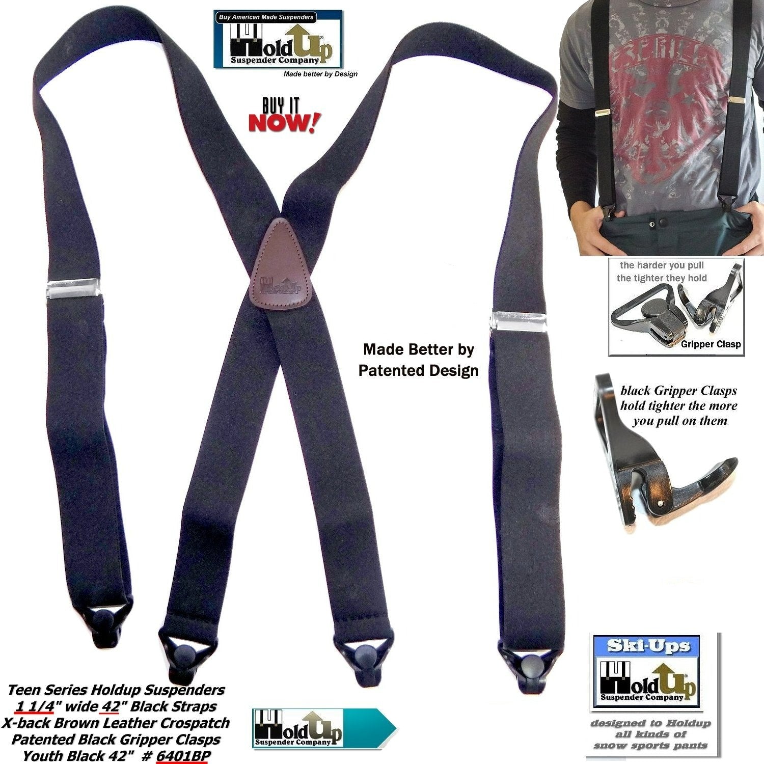 Holdup Youth Series all black clip-on Holdup suspenders have an adjustable 42" shorter length and black USA patented composite plastic Gripper clasps specially made for the active teenager. The USA patented plastic gripper clasps are cam activated which means the harder you pull on them the tighter they grip your jeans. These have X-back brown leather crosspatch embossed with the Trademarked Holdup logo and have silver-tone strap length adjusters. These suspenders feature 1 1/4" wide cotton poly-blend elastic washable black colorfast straps and are durable enough for years of wear. Active youth often need suspenders at school and when playing, skiing, snowboarding or other sports where they need something more than belts to hold up their jeans or waterproof pants. These come with a 30-day 100% satisfaction money-back guarantee and you buy using your PayPal or Amazon accounts with FREE FREIGHT offer at checkout if delivered by Amazon.