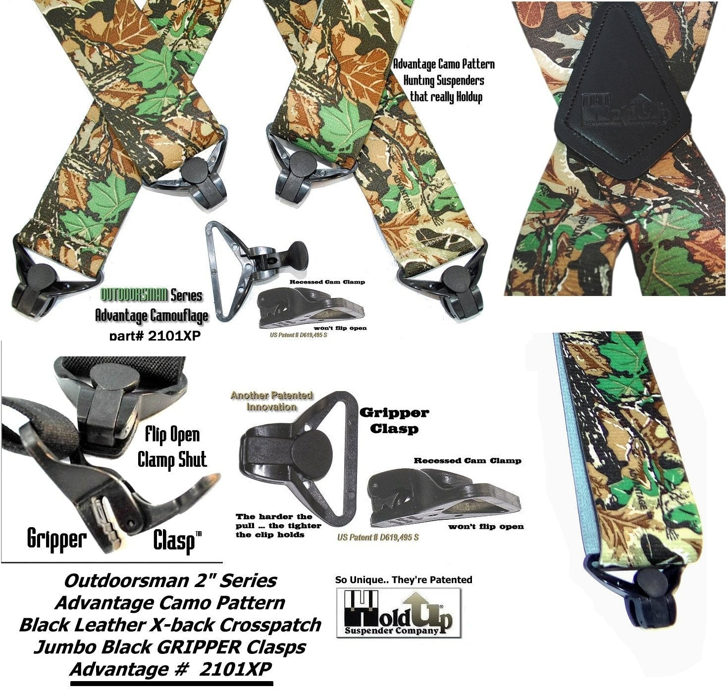 Holdup Suspender Company Outdoorsman Series Advantage Camo pattern work and hunting X-back suspenders with super strong black Composite Plastic Gripper Clasps. These clasps hold tighter the harder you pull on them. Perfect gift for the hunter or fisherman that knows the limitations of conventional suspenders and wants the latest in camouflage pattern suspenders with our newly patented Gripper Clasps.Â
