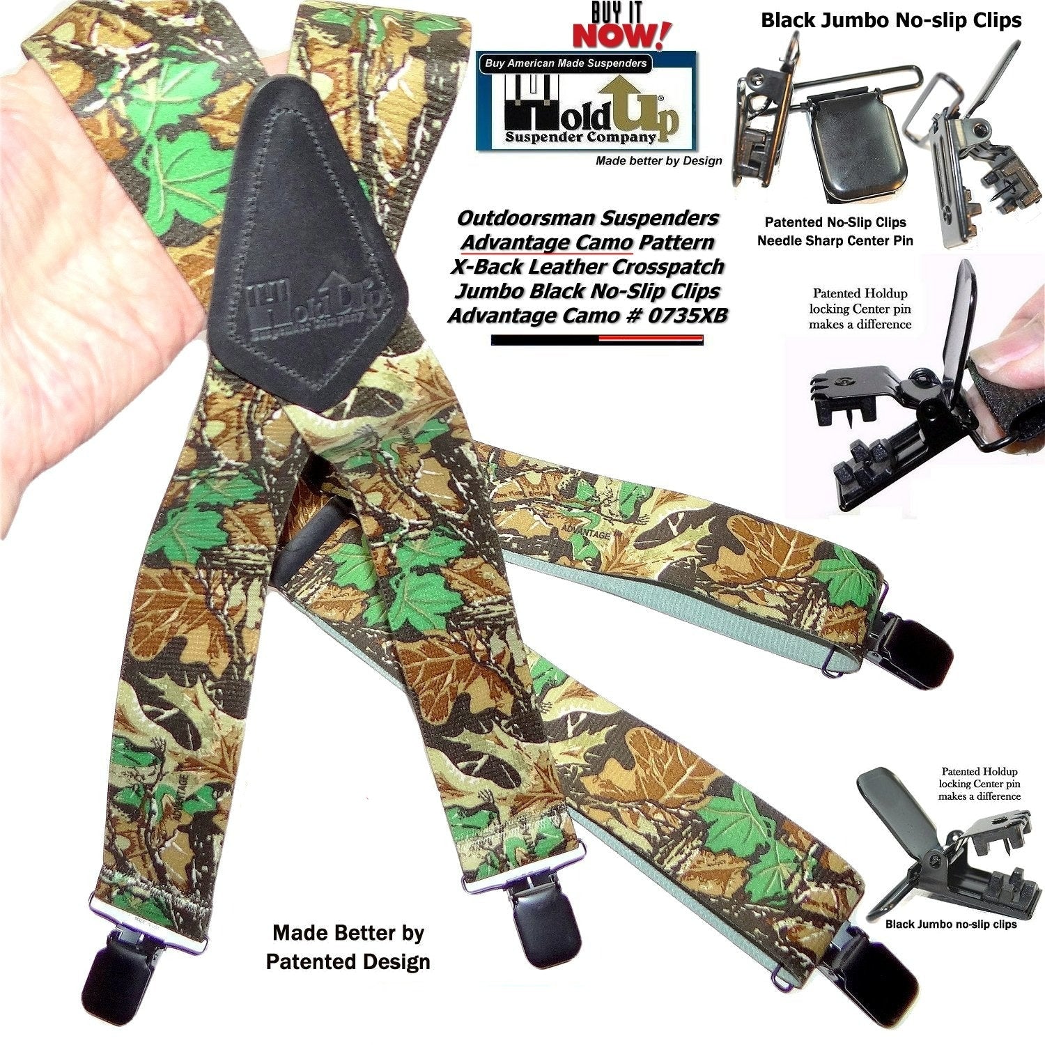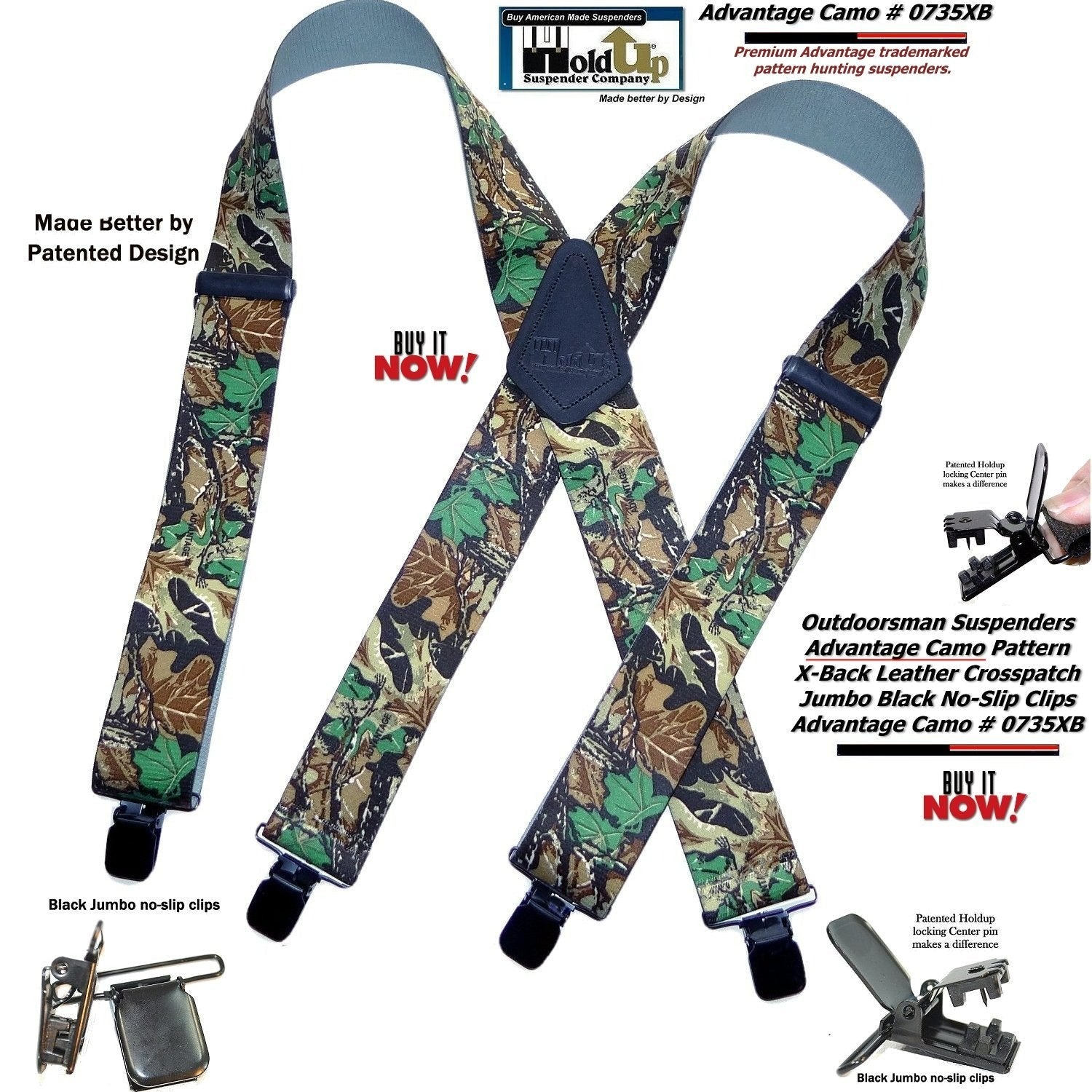 American made Holdup Hunting X-back Suspenders in Advantage camouflage pattern have patented Jumbo no-slip center pin type clips. Buy these using your Amazon or PayPal account choosing your preferred credit/debit card and get Free Freight offer at checkout. Outstanding Advantage Holdup hunting suspender features are listed below: