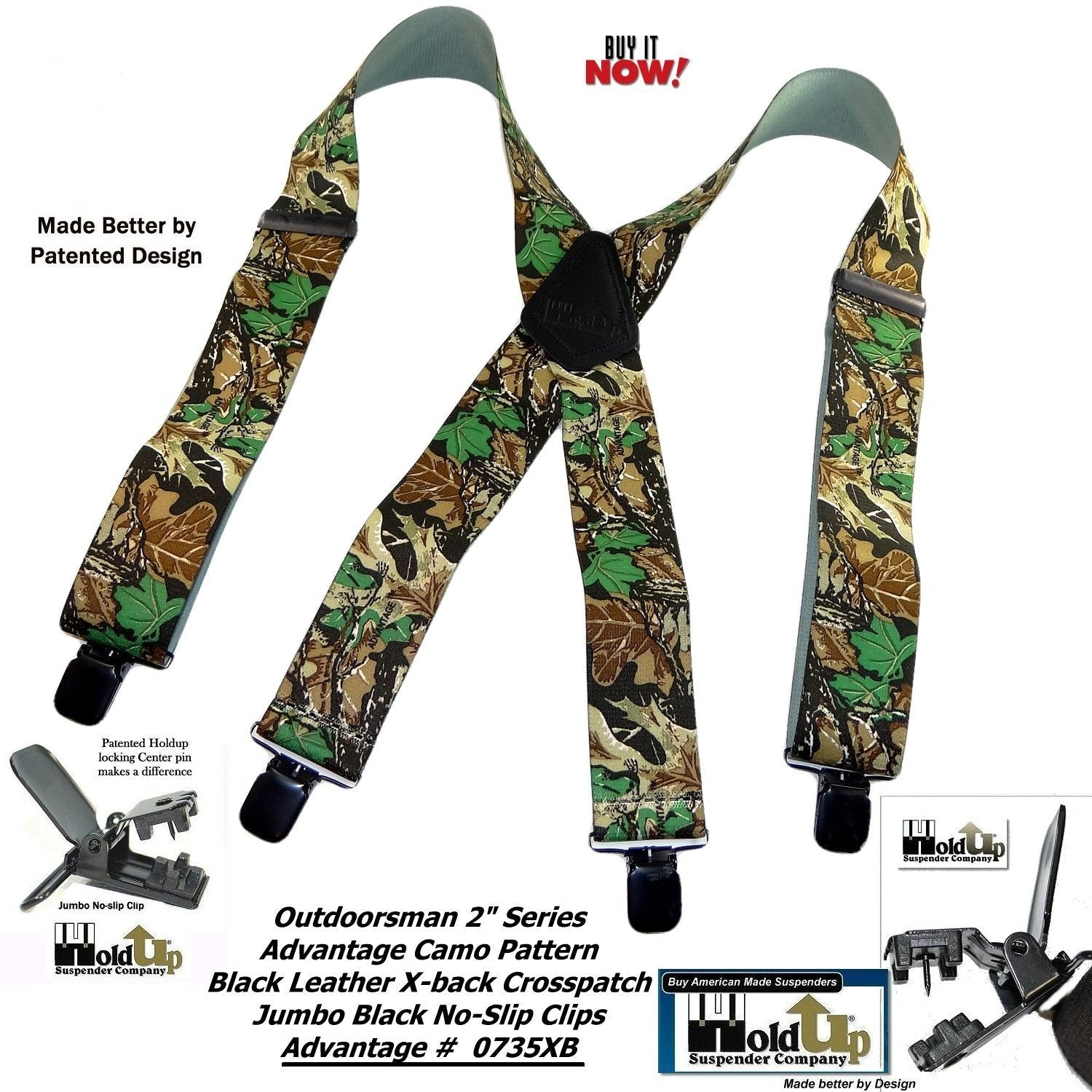 Holdup Advantage Pattern Camouflage Hunting Suspenders with 2" wide Straps and Black Patented No-slip Jumbo Clips