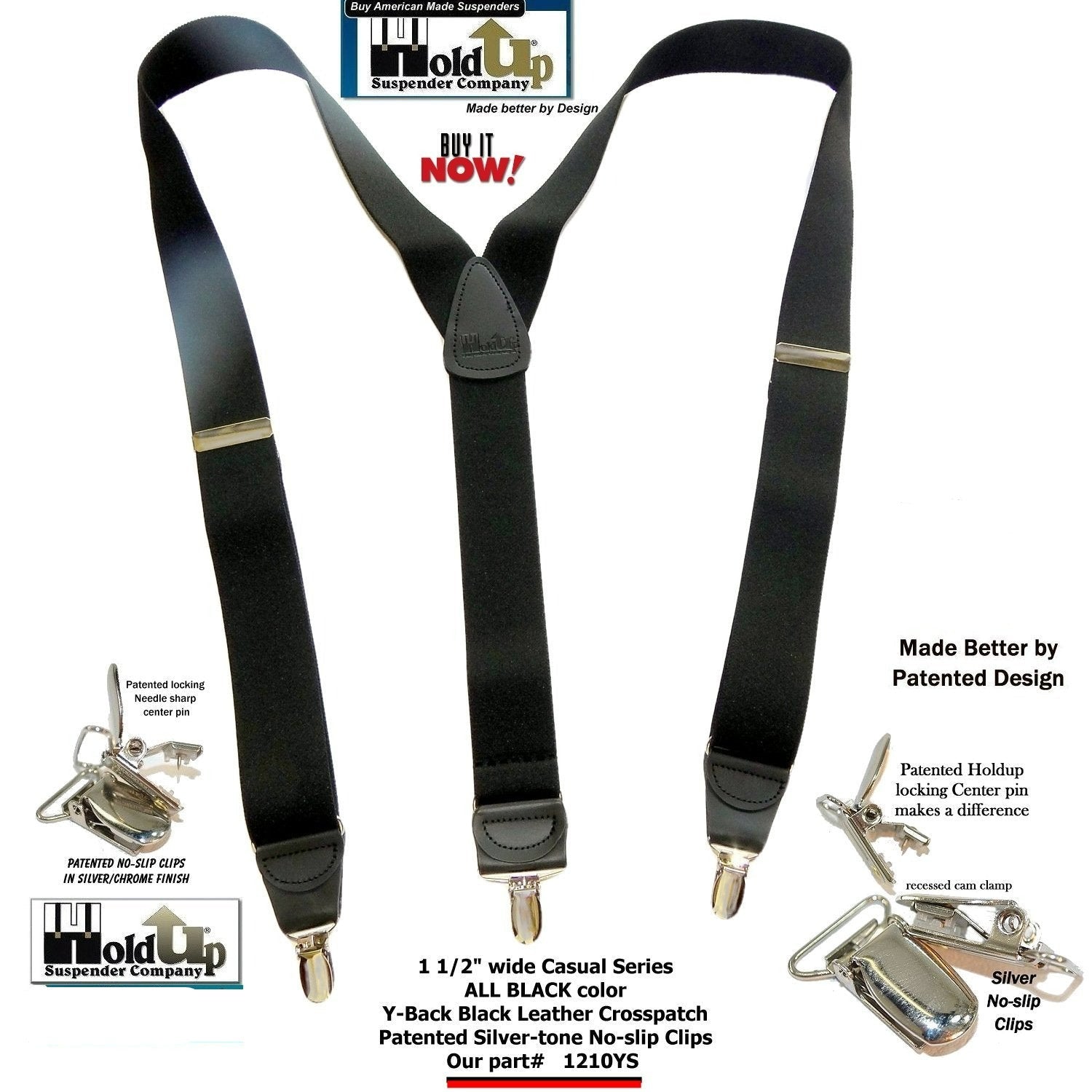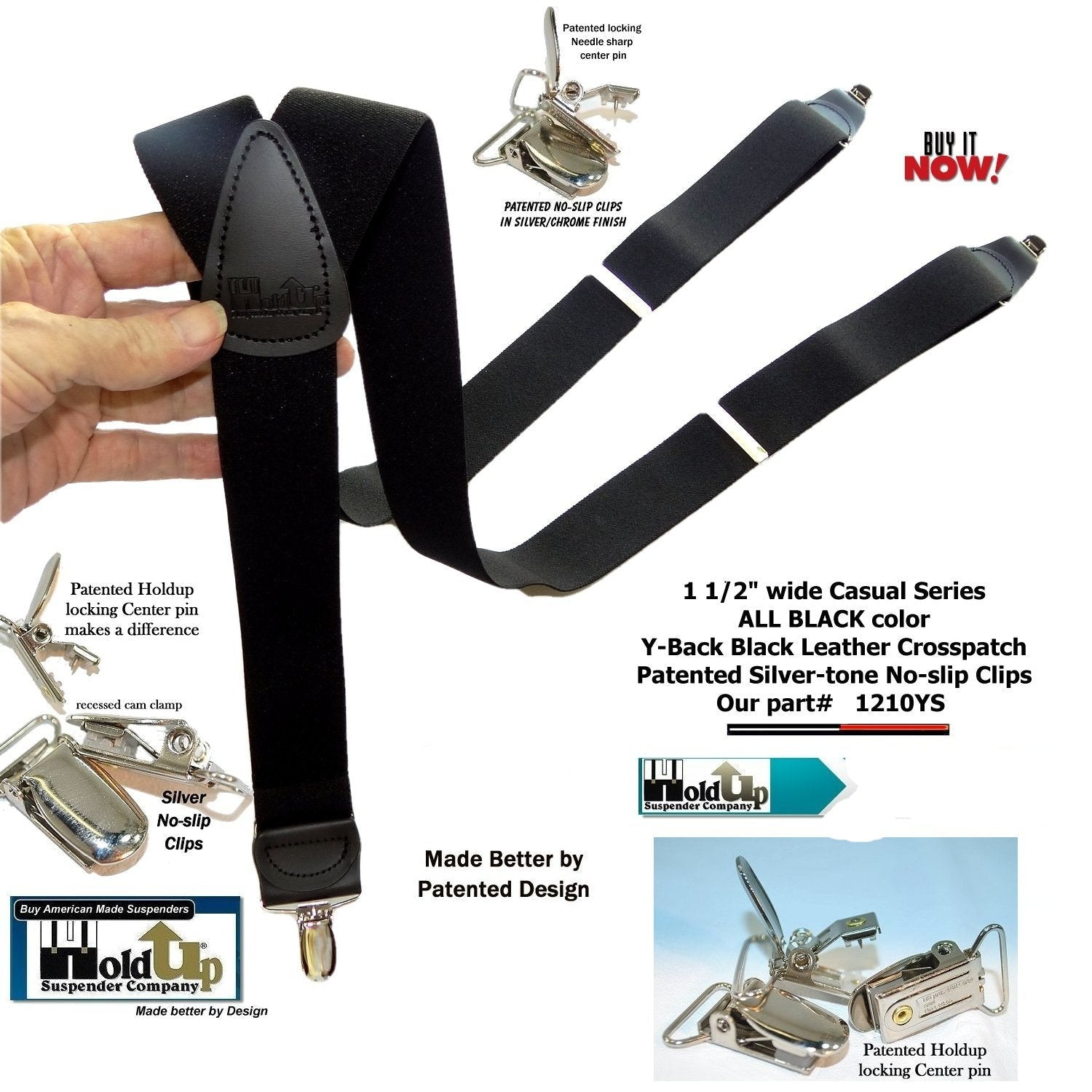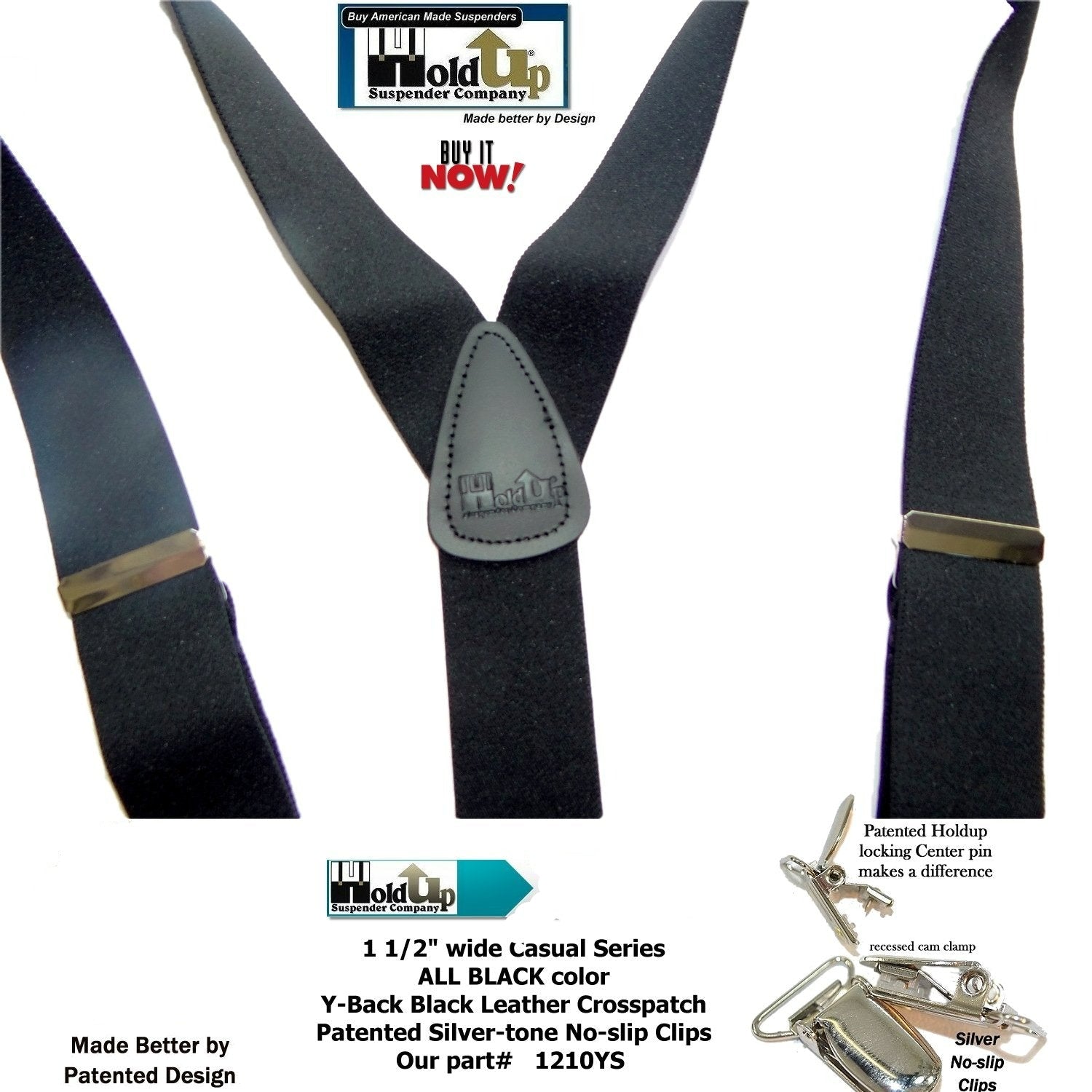 HoldUp Brand All Black Casual Series Y-back Suspenders with patented silver No-Slip clips