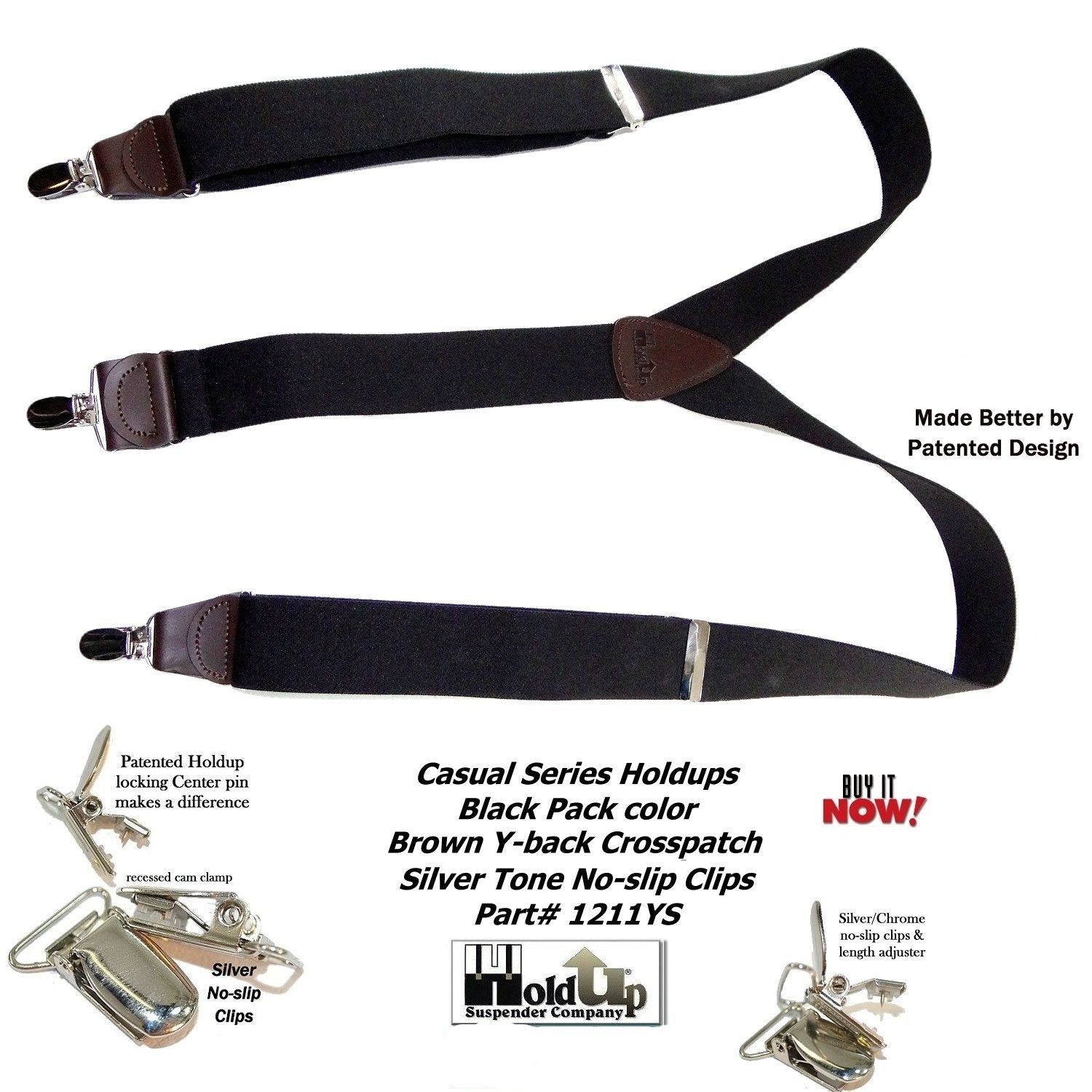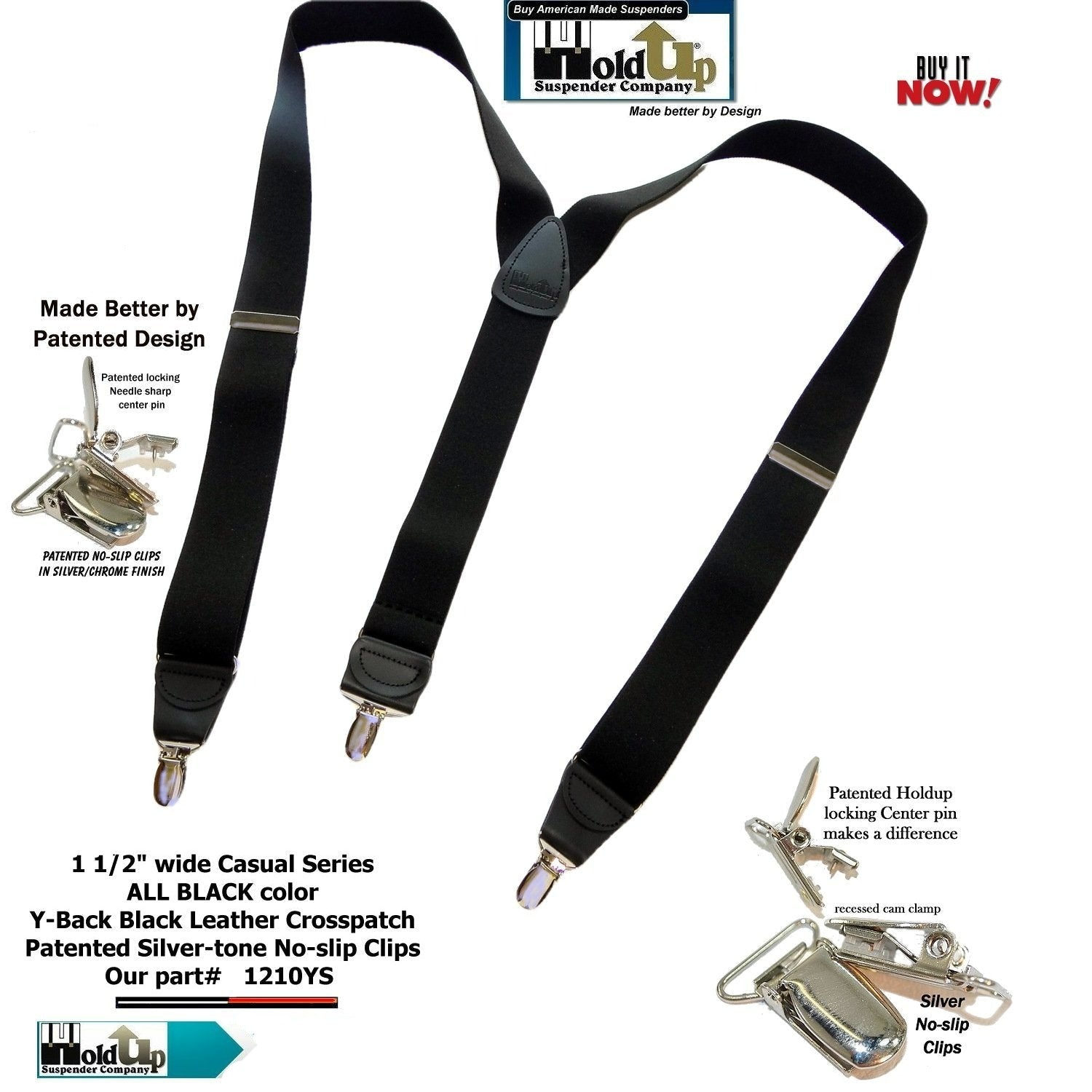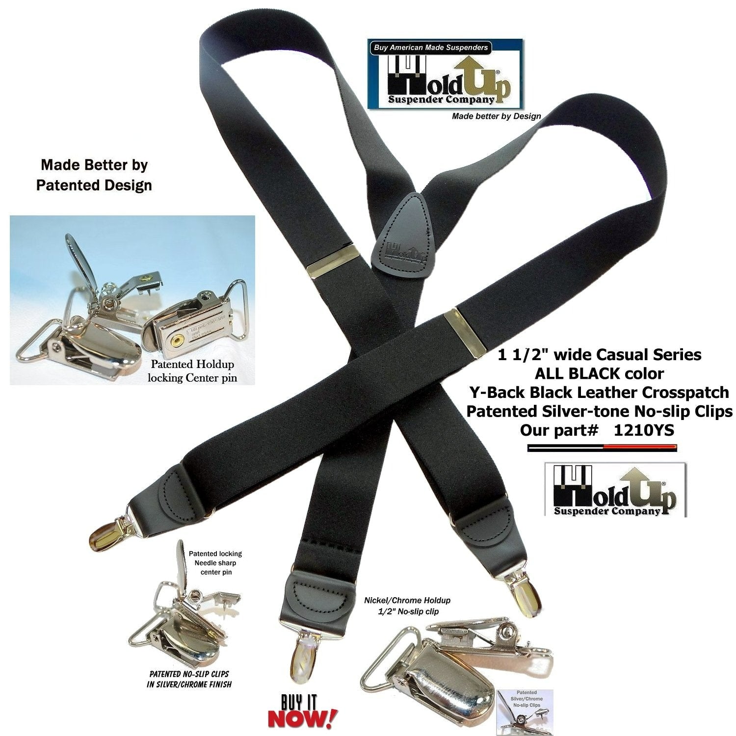 HoldUp Brand All Black Casual Series Y-back Suspenders with patented silver No-Slip clips