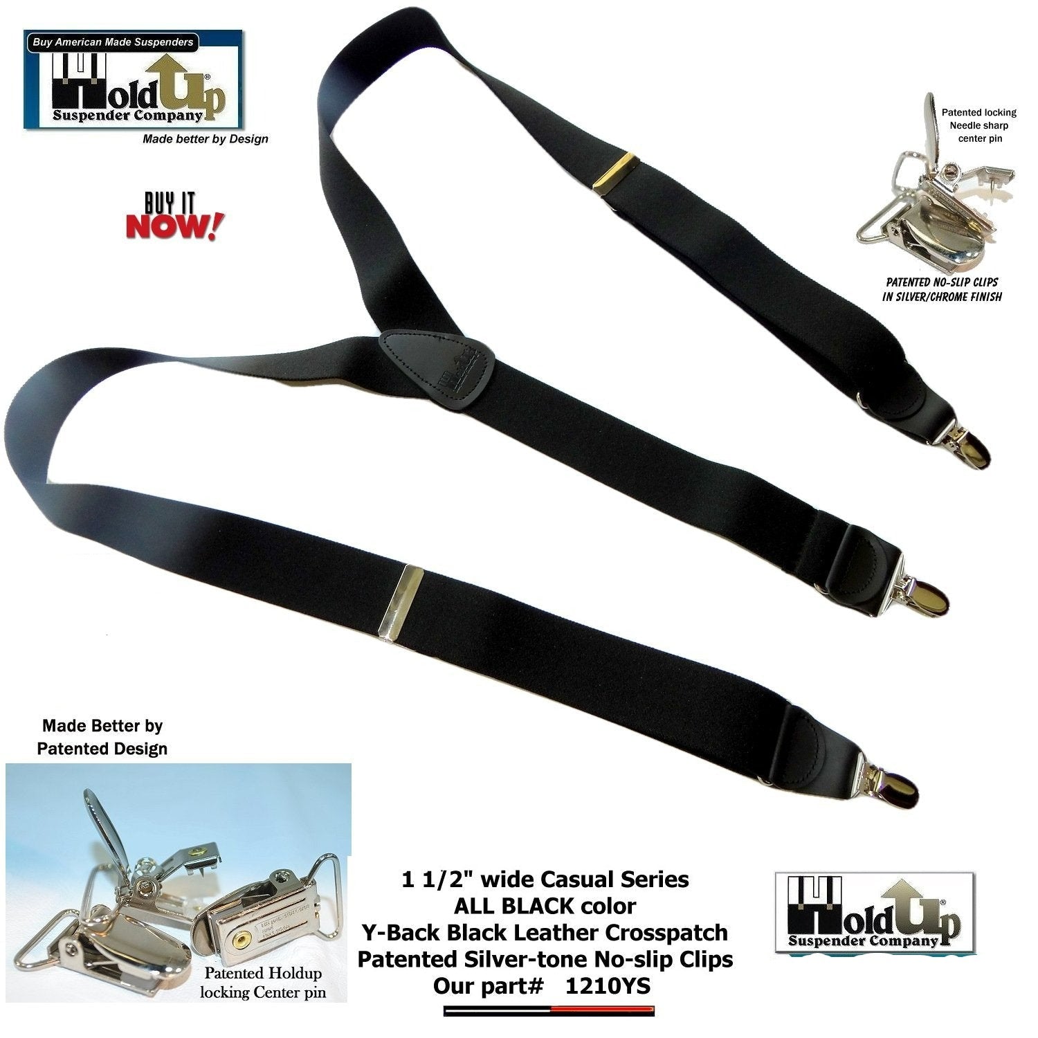 Holdup Suspender Company presents the Casual Series ALL BLACK Y-back suspender featuring our patented nickel chrome no-slip clips. This popular Y-back style features a top-grade genuine black leather crosspatch embossed with our Trademarked Holdup logo. These black American made clip-on black suspenders really look great with solid or pattern shirts at work or out on the town. The tasteful genuine black leather trim and USA made cotton poly-blend elastic washable straps make these a popular choice for businessmen and those seeking a suspender they can wear with any color outfit. The top grade black leather clip tab holders are more tapered in the front and the black leather Y-back crosspatch is branded with the exclusive Trademarked Holdup logo. These are 1 1/2" wide and 48" long so they comfortable fit men to six feet tall. We have a X-back XL version on sale here for the big and tall man. The All Black casual series Hold-Ups can double as a formal event suspender while having a toned down look for wearing with any casual outfit. Buy these here at our HoldupSuspenders.com and get free freight offer when using your preferred payment choice and you can checkout using your familiar Amazon or PayPal secure account.