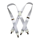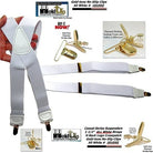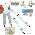 - ALL WHITE casual Holdup suspenders with X-Back and gold-tone patented NO-SLIP® clips with needle-sharp center pin for extra holdup power