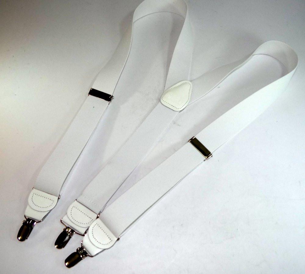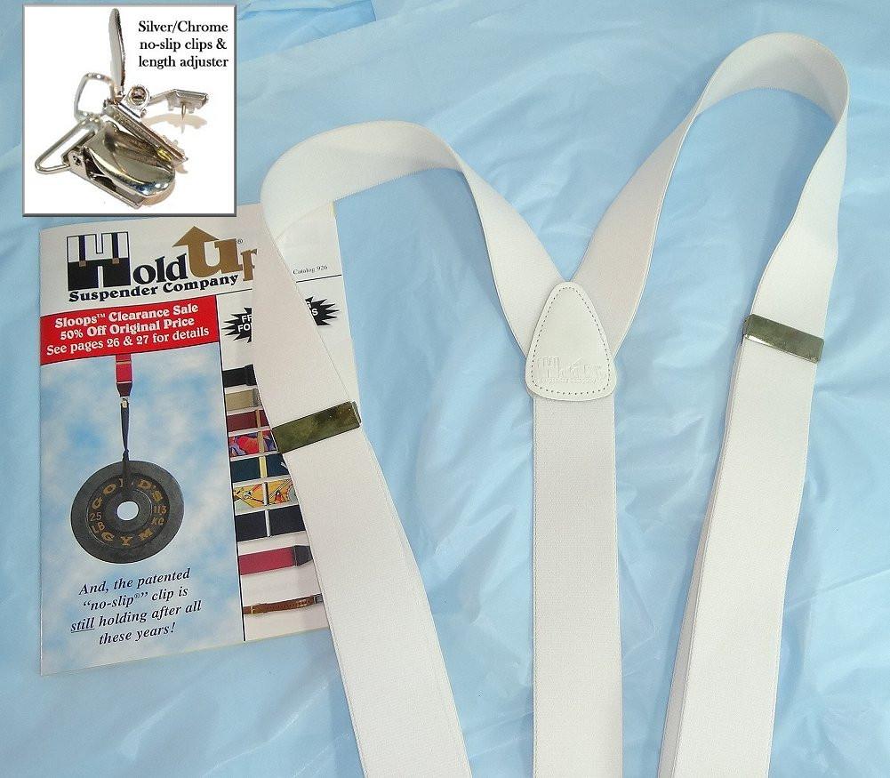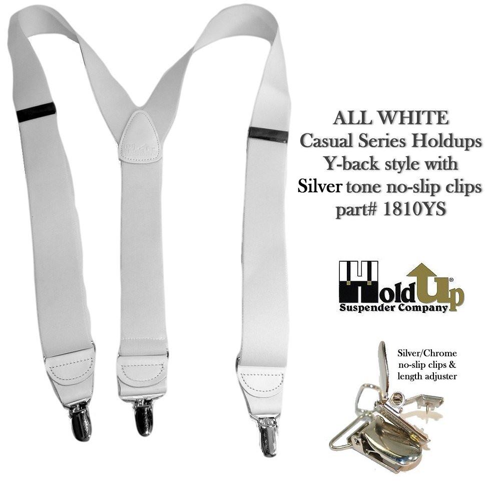 Hold-Ups All White 1 1/2" wide Casual Series Suspenders Y-back USA patented silver No slip clips