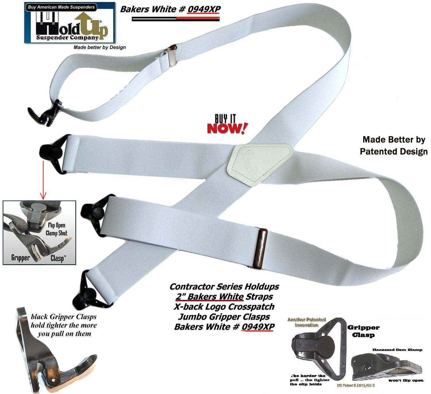 - Baker White wide work Hold-up® suspenders are made better by Patented design in America