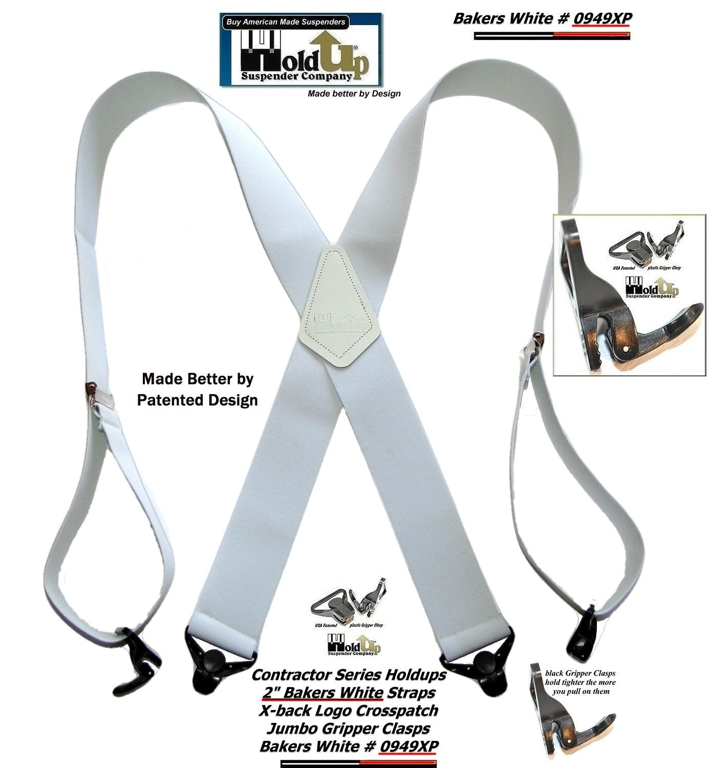 Holdup Suspender Contractor Series Bakers White 2" Wide Work Suspenders in X-back style with USA Patented Jumbo Gripper Clasps
