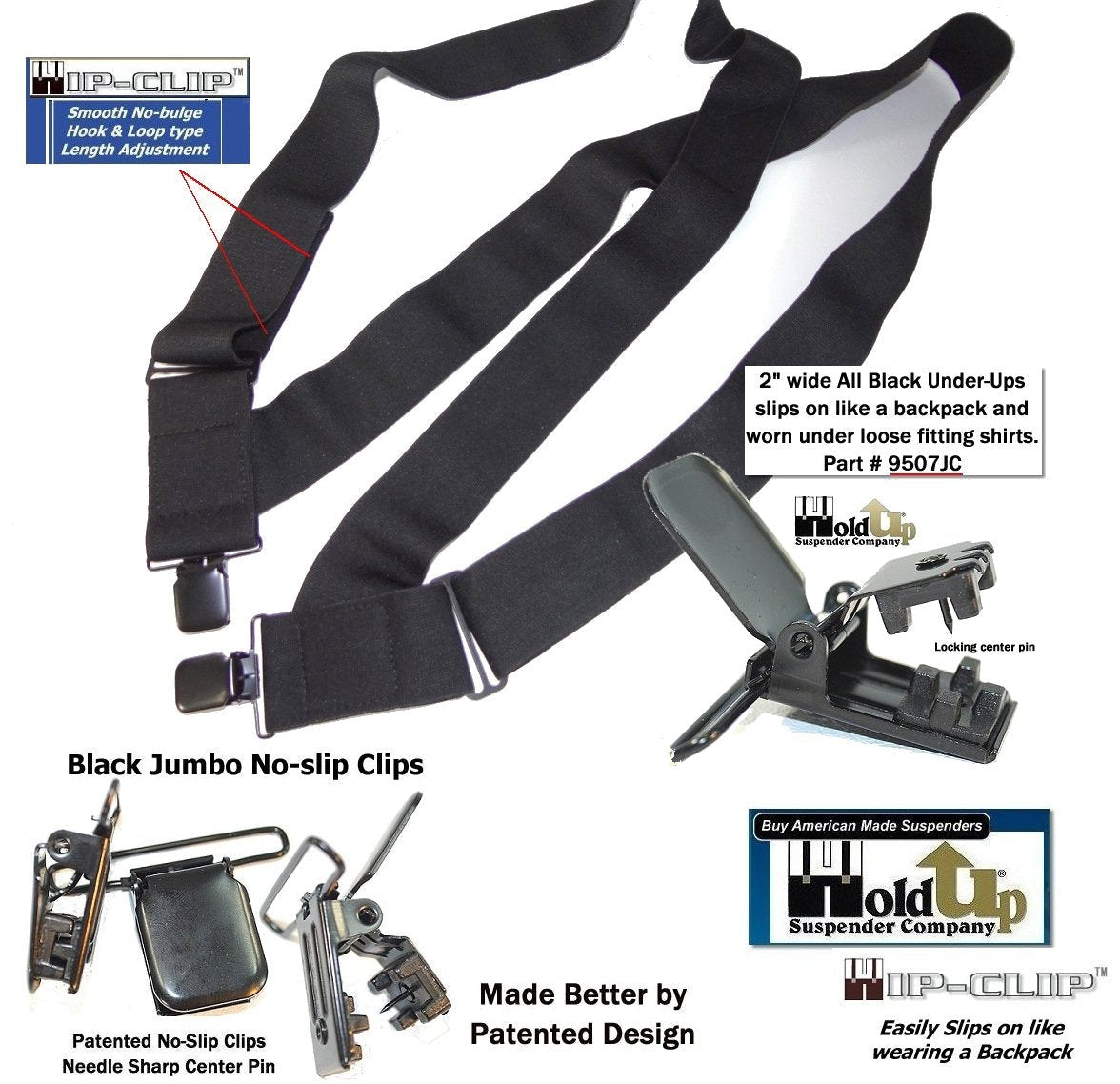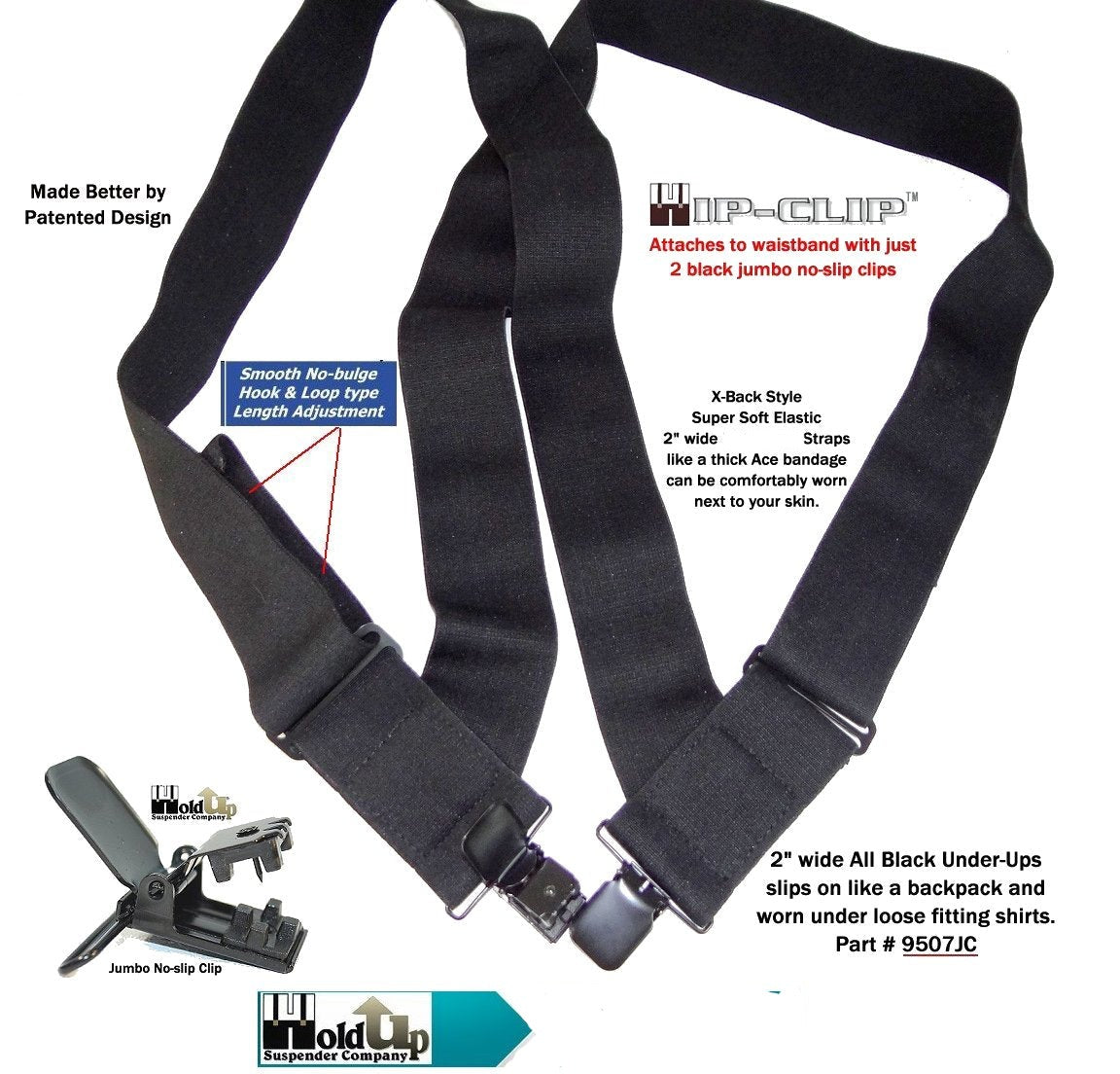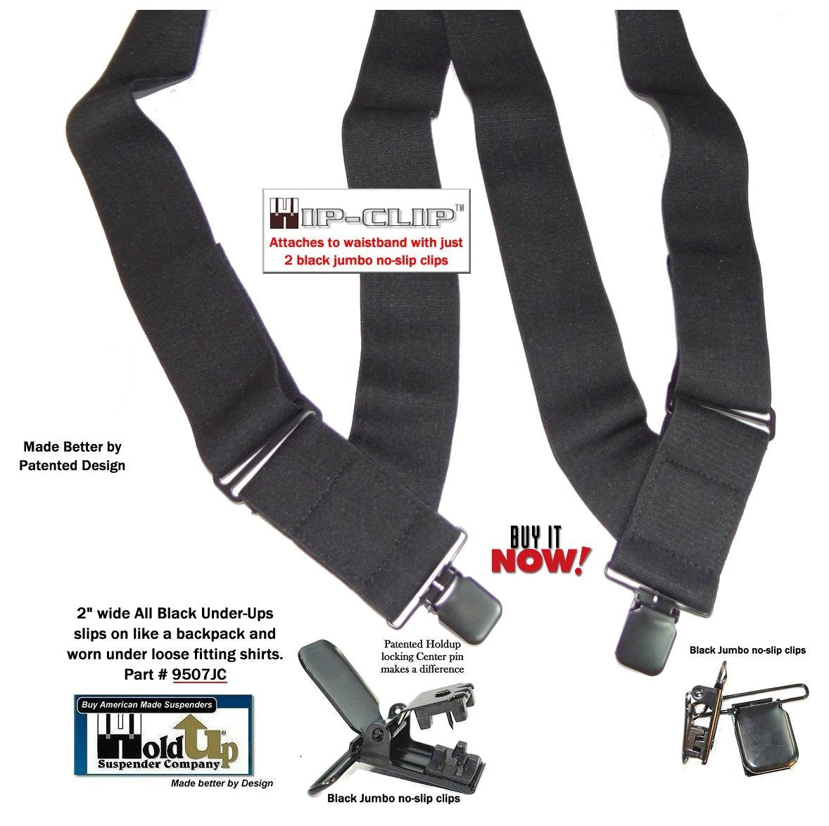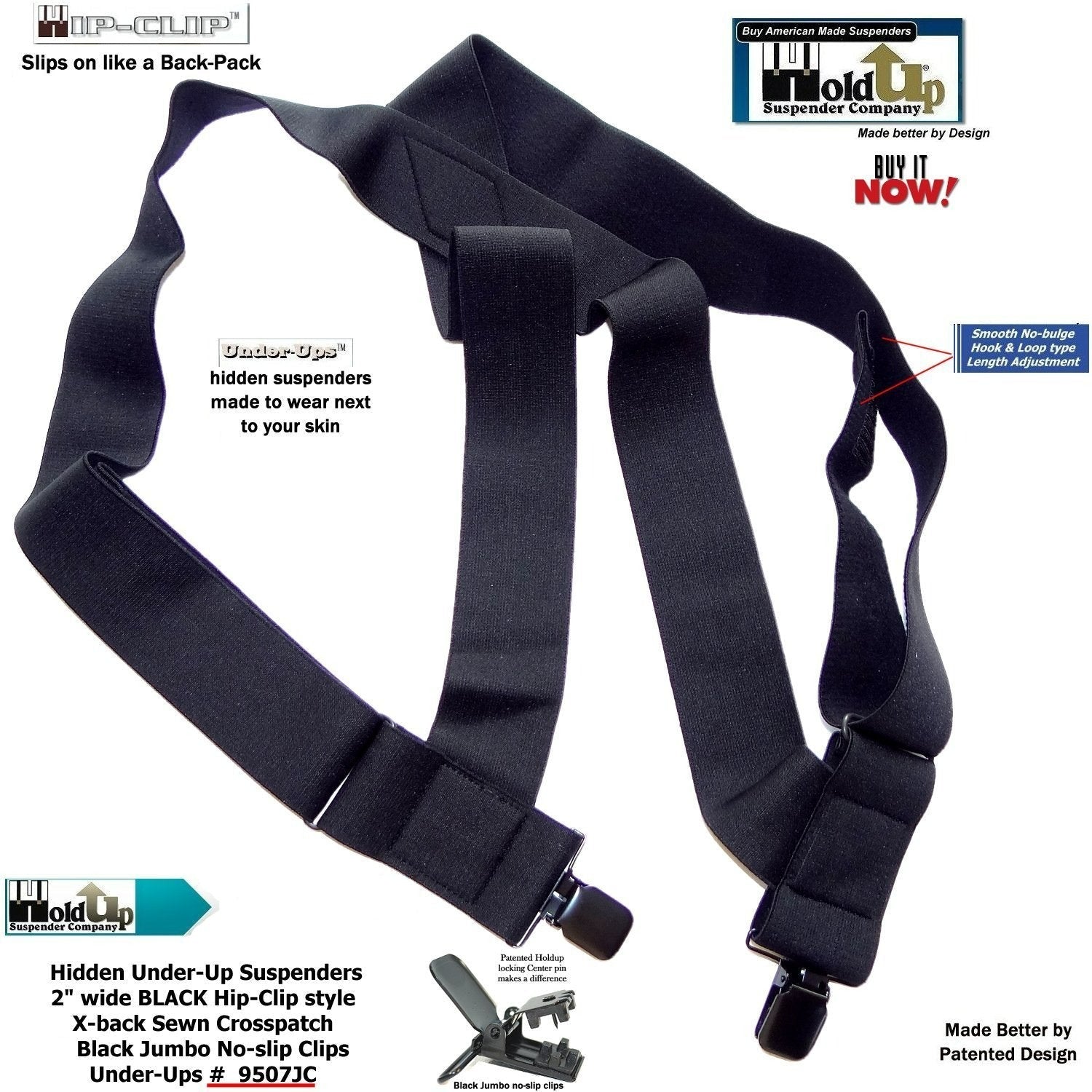 Holdup Brand Under-Ups are perfect for the individual who prefers to wear their suspenders under a loose fitting shirt. HoldUp suspender company features a newly patented flush webbed design which eliminates bulky plastic adjusters and uses a built-in hook and loop style fastening system. These 2" wide comfortable black undergarment suspenders are soft to the skin and slip on like wearing a backpack. Black poly-blend elastic colorfast fabric straps and built-in Hook & Loop smooth (no bulges) length adjusting system make these for wearing under loose fitting shirts with shorts or pants.. The USA patented jumbo black No-slip clips have a locking center pin so they really will not slip or slid off your pants or shorts... Men love the comfort of these 2" wide undergarment all black suspenders in the Trucker side clip-on style. Buy American and get the quality you deserve in a black wide undergarment suspender made to wear under any loose fitting shirt. So comfortable you'll not even notice you're wearing them. Can also be worn by the larger plus-sized pregnant women needing a super soft comfortable and invisible way to "Hold-Up" their maternity pants and shorts. Buy these using your Amazon or PayPal account and get free Freight offer at secure checkout.