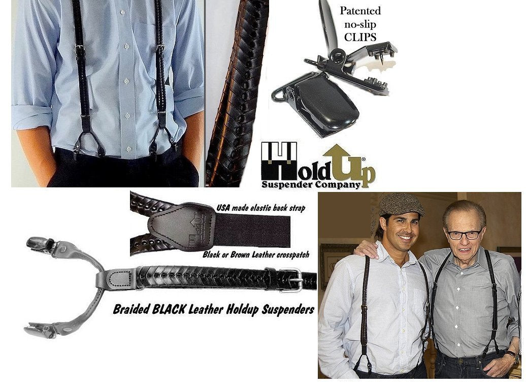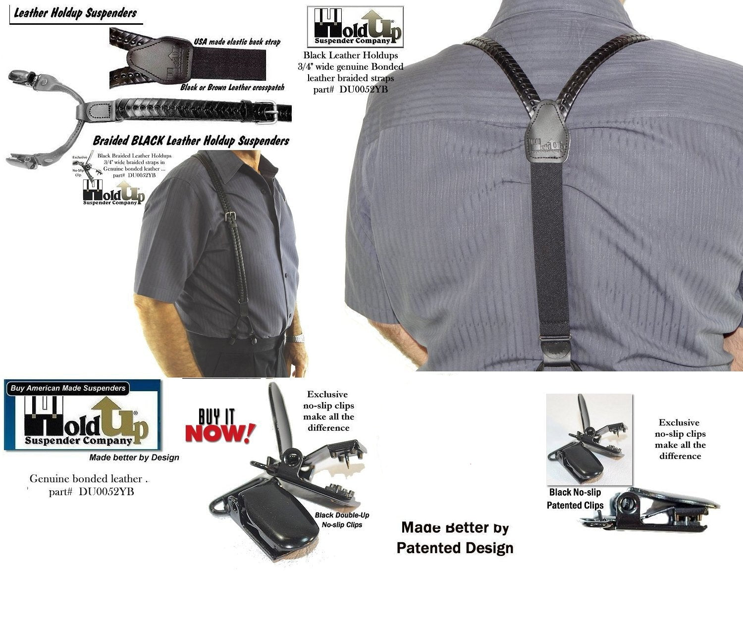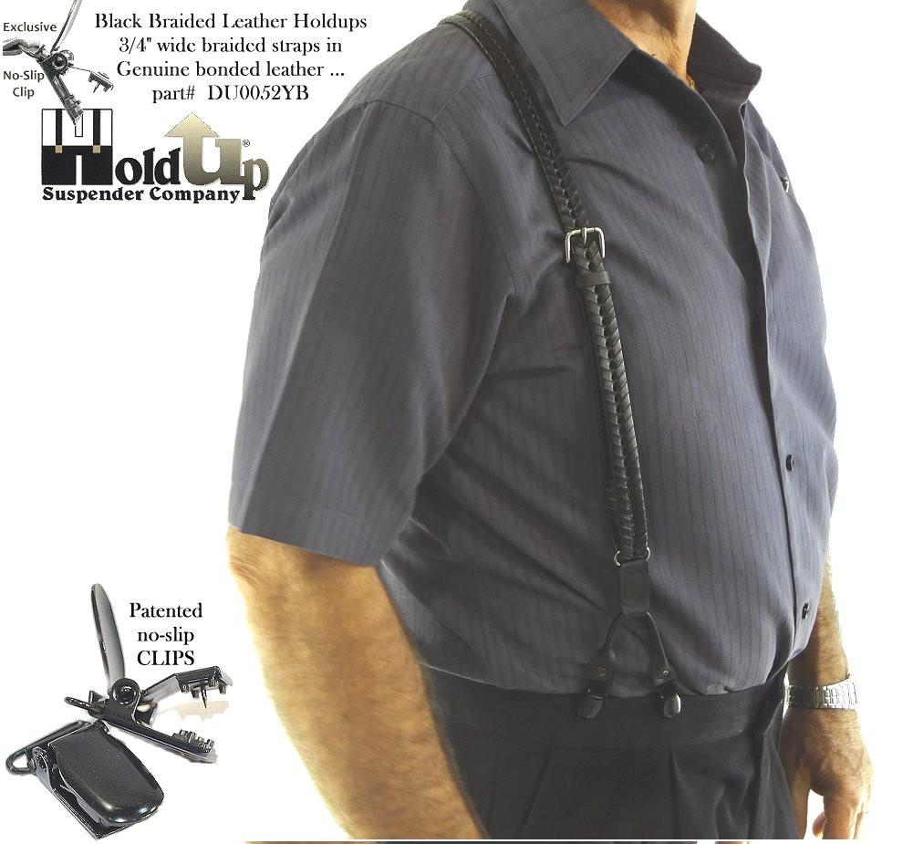 Beautiful 3/4" wide old fashion western wear black genuine finished split Leather braided style leather Holdup Leather Series suspenders are adjustable to 48". Holdup exclusive shiny black No-slip USA patented clips will hold these dual clip Double-Ups style leather Hold-ups attach securely on jeans, slacks or dress pants. Exclusive design feature of these leather clip-on suspenders is we eliminate the proverbial waistband rollover caused by all button-on braces, which pull at the middle of the waistband. These attach at top of pant waistband