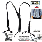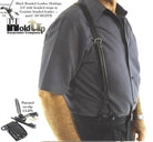- Hold-up® brand black split leather braid suspenders with USA patented no-slip® black Holdup needle sharp center pin type clips