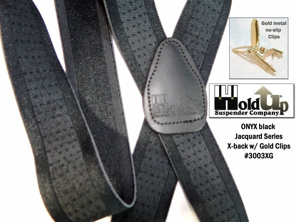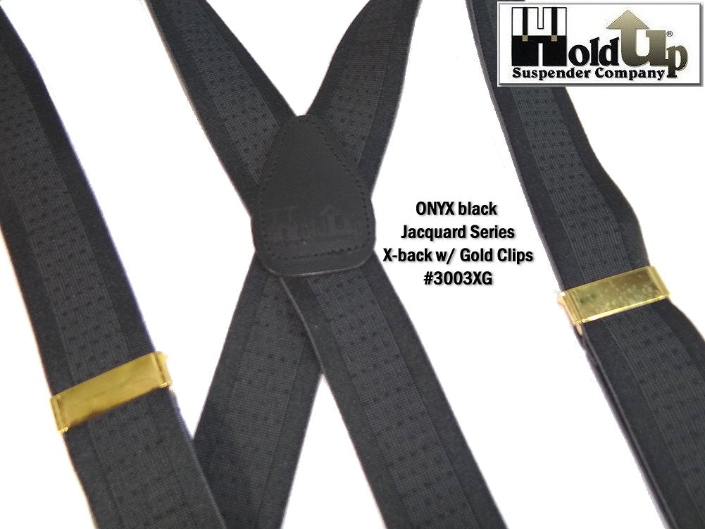 Hold-Up Suspender Company is proud to offer our Jacquard Series men's suspender in a black ONYX jacquard weave color mix. These suspenders feature an X-back style with gold metal clips and matching length adjusters. These are 1 1/2" wide and are adjustable to 48" in length. The single-clip Jacquard Series Hold-Ups all feature our patented No-Slip Suspender Clip guaranteed to never slip, slide, or fly off your pants like all other suspender clips do. No matter how much you spend or how often you have a tailor sew on suspender buttons, the net result will never equal a pair of ONYX Hold-Up suspenders! We offer you an unconditional 30 day money back guarantee which will back up our quality fabrics and clips.