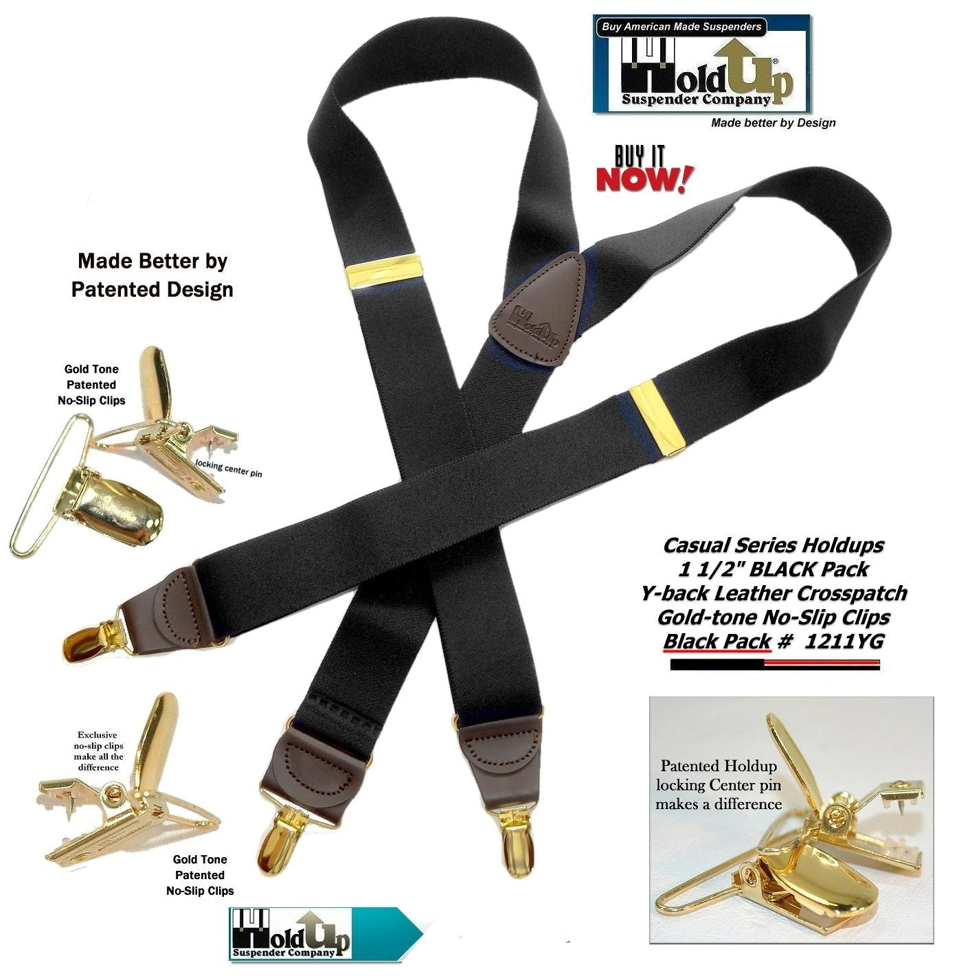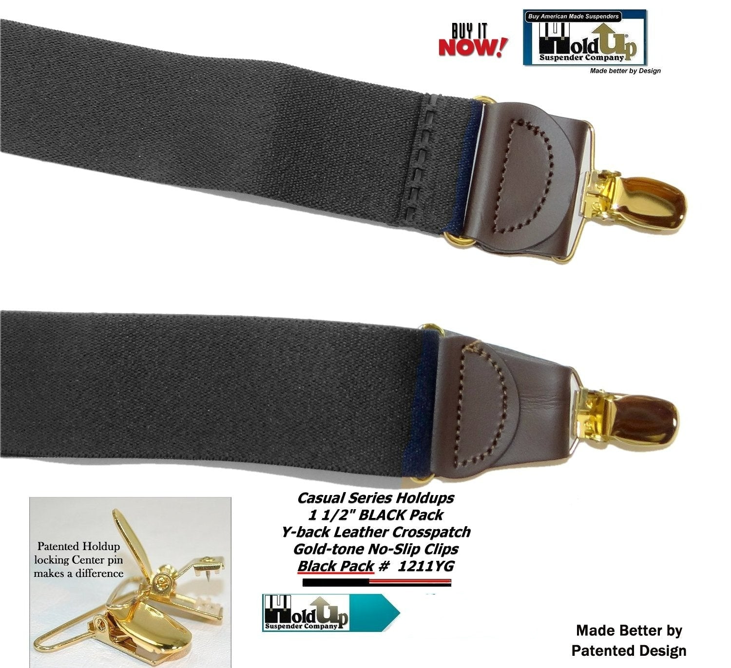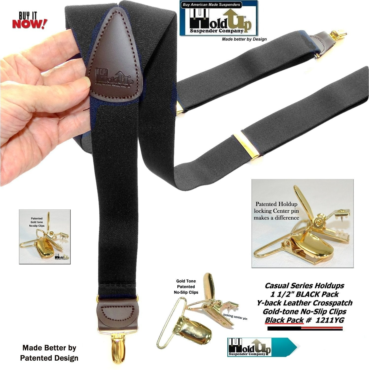 Holdup Brand Suspenders in the Black Pack color as part of the Casual Series Y-back Suspenders with Patented No-slip Gold tone no-slip Clips.  You'll love these Black Y-back Holdup top quality Suspenders or we'll gladly refund your money. Holdup Suspender Company has the first suspender clip patent in 124 years to back up our entire line of 450 styles of men's and women's suspenders. Buy safely here at Amazon where we offer these in additional colors and back styles (X-or Y-back), and brown leather crosspatch embossed with our exclusive Hold-up brand logo.