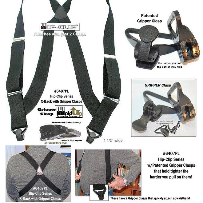 - Black Trucker Style suspenders with 2 patented Gripper clasps that hold tighter the harder you pull on them