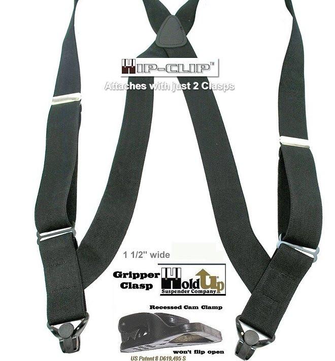 Hold-Ups Black Trucker Style Hip-clip Suspenders 1 1/2" Wide with Patented Gripper Clasps