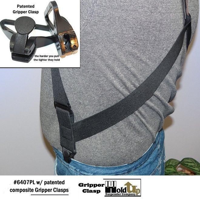 - Trucker style black HoldUp suspenders with 2 composite plastic Patented Gripper Clasps