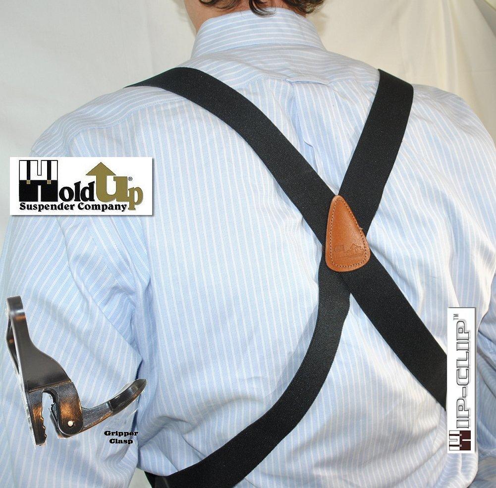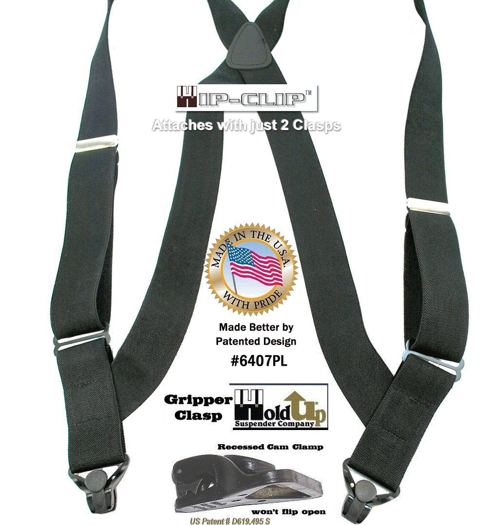 HoldUp Suspender Companies owner Sal Herman has done it again and introduces an innovative BLACK Trucker, or side-clip suspender, called the Hip-ClipTM. Now you can comfortably hold up any weight pants or jeans with just the snap of 2 of our exclusive Patented black Gripper Clasps at the side of your pant waistband. Keep your pants in the right place with our rugged side clip suspenders which can be worn under jackets or sweaters with ease. Modeled after shoulder holsters and slip on like a backpack. They're designed with 1 1/2" wide USA made straps that crisscross your back and attach at the sides. Slip them on like you would a backpack. 1-1/2" narrower strap width and 48" length with silver metal patented NO-SLIP clips. We stock Red, Navy Blue, Tan or Black colors - all with brown leather X-back crosspatch embossed with Holdup logo. Sometimes called "trucker" suspenders, or side clip suspenders, they're designed to never fly open when sliding across truck or car seat covers as they attach to the sides of your pants. Buy several pair here at Amazon using your account and save on freight...