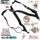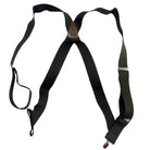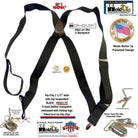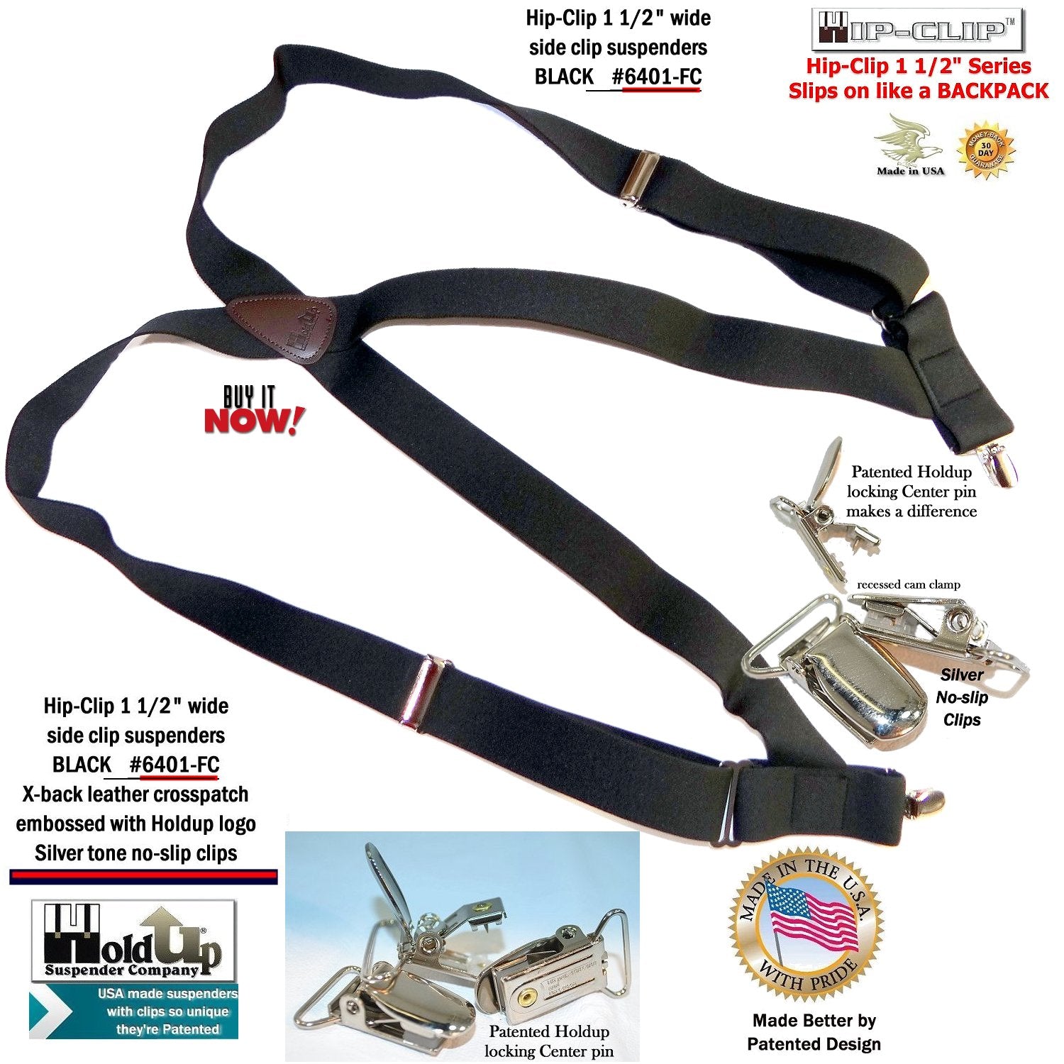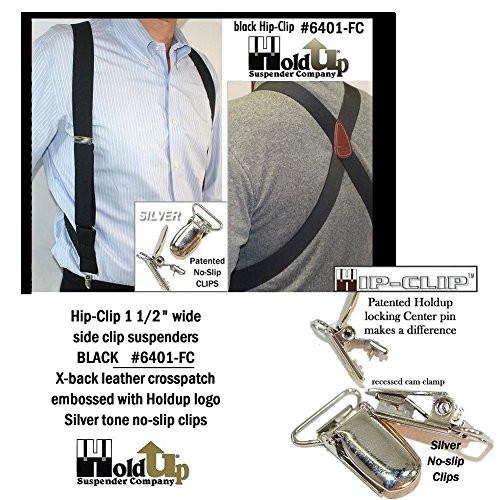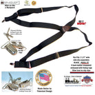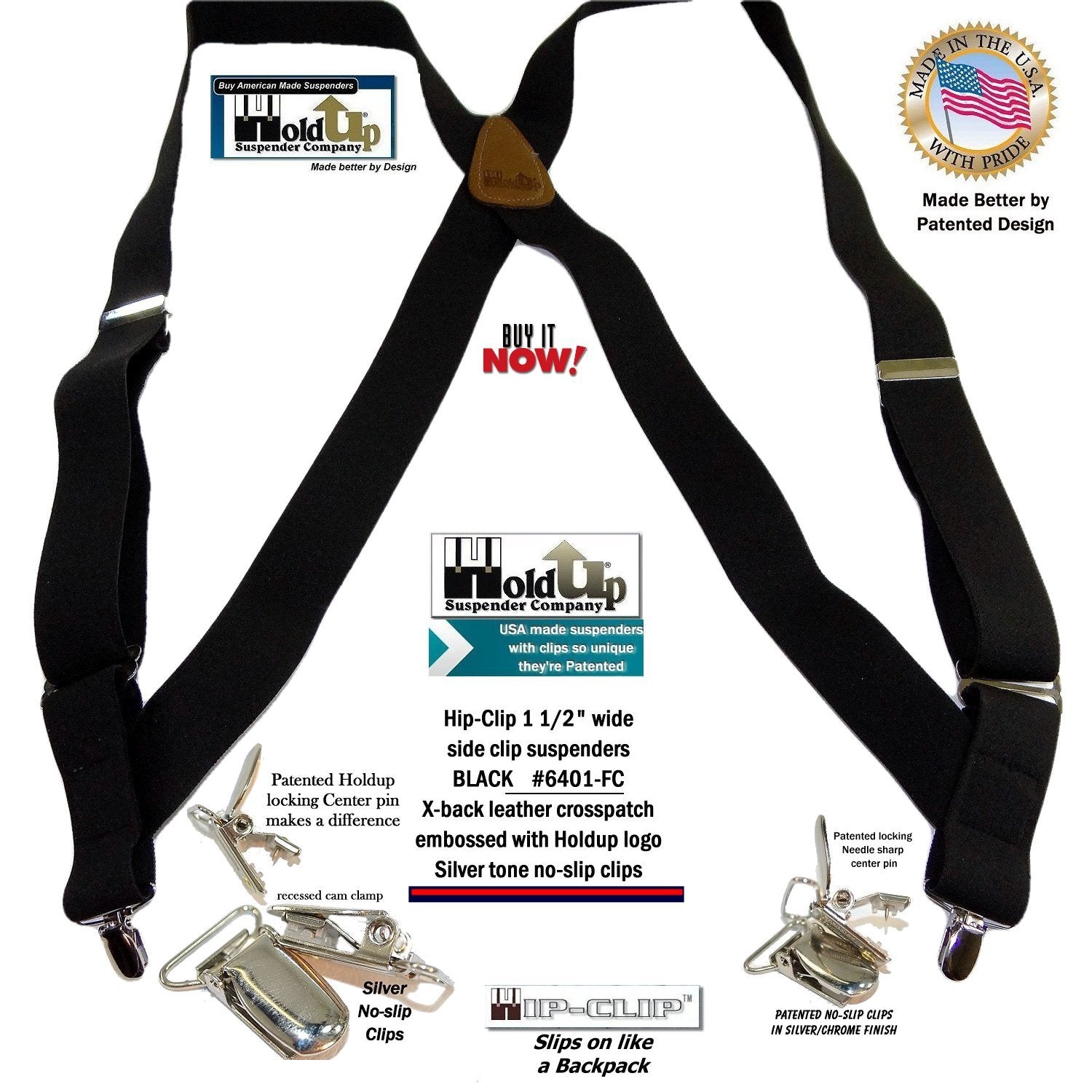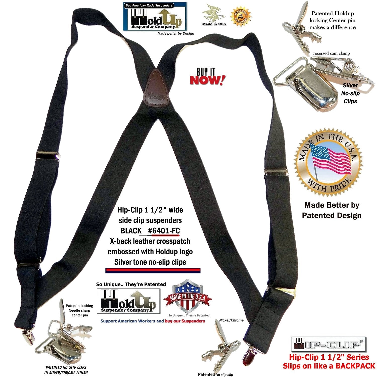 - Black side-clip suspenders with X-back genuine Brown leather crosspatch embossed with trademarked Holdup logo and 1 1/2" wide elastic USA made cotton poly-blend elastic straps