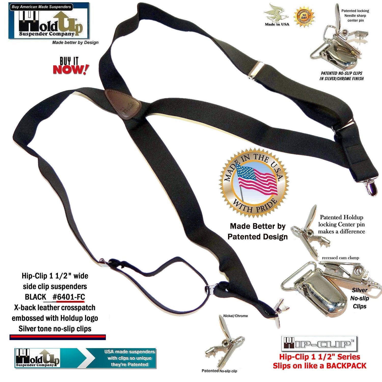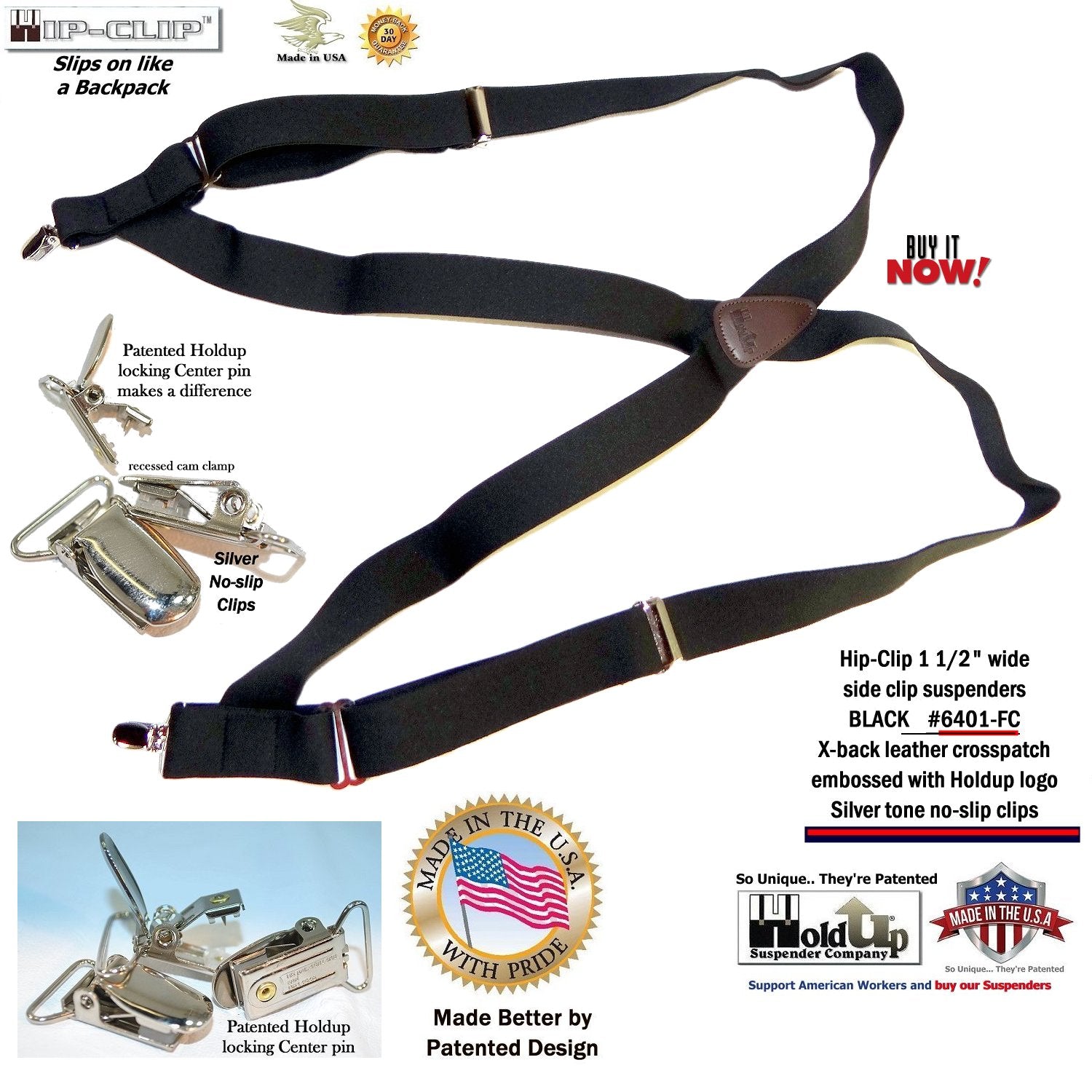 - Flat finish black elastic webbing Made in USA on premium cotton poly-blend elastic fabric and htese American Made Trucker style black HoldUp side clip suspenders have 2 silver-tone patented no-slip clips