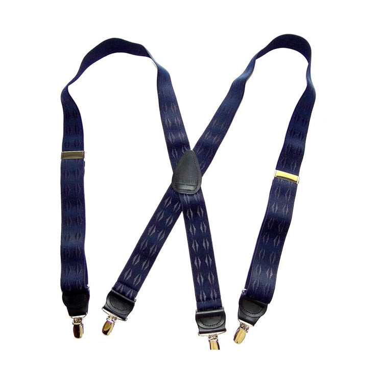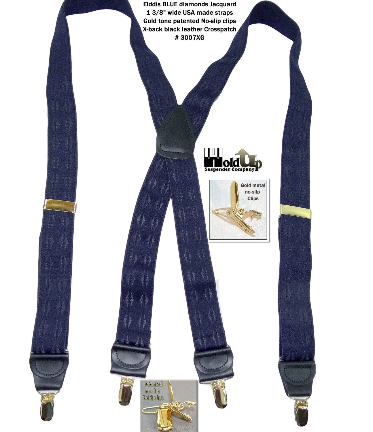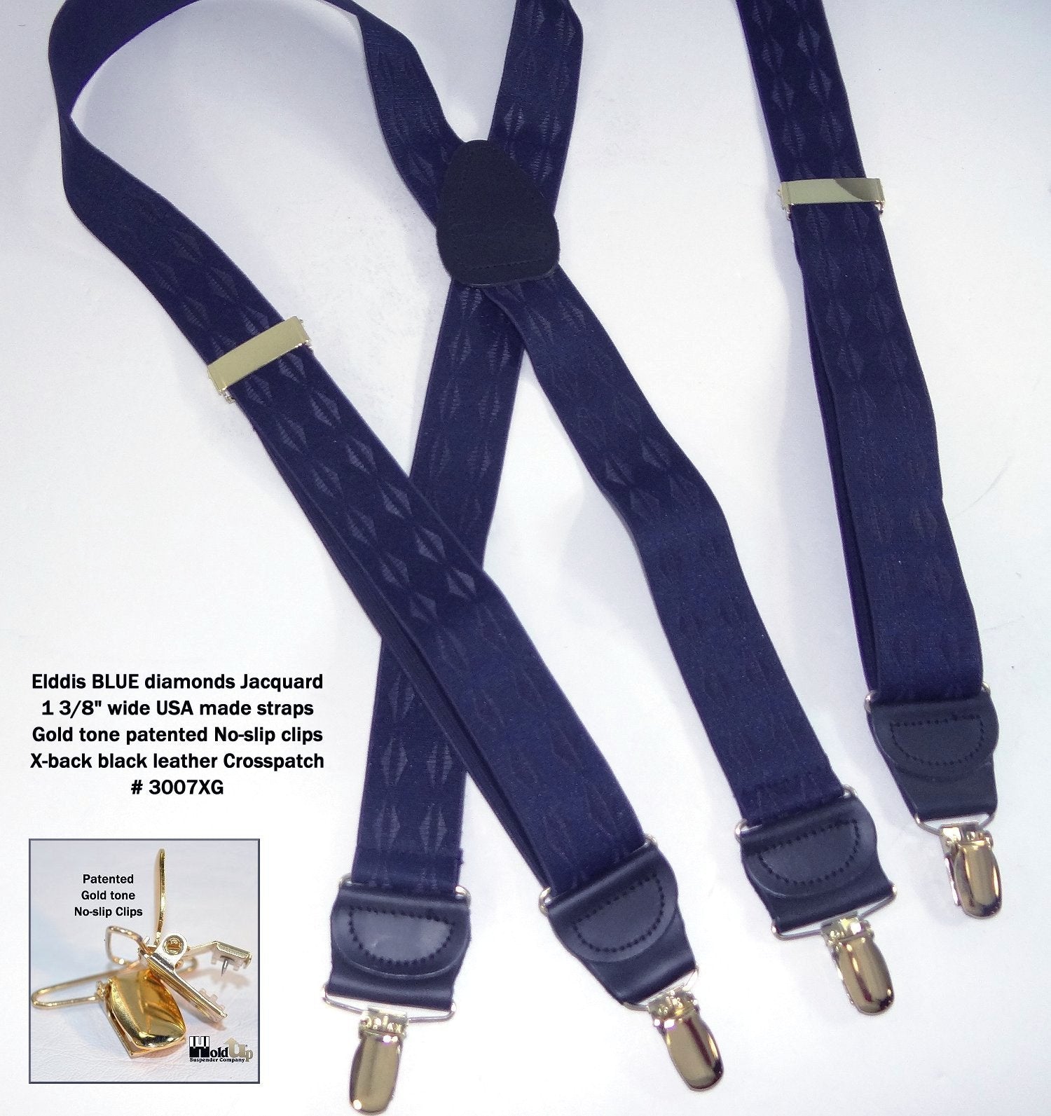 Hold-Ups Blue Elddis Diamond Pattern Jacquard Suspenders X-back And USA Patented Gold No-slip Clips