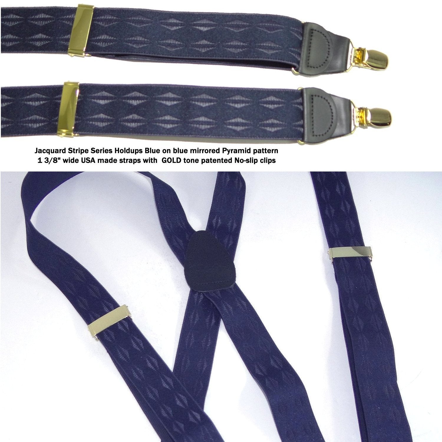 These 1 3/8" wide Tone-on-tone Jacquard Weave Series suspenders shown with Navy Blue on Blue colored mirrored pyramid pattern from HoldUp Suspender Company have Gold tone no-slip clips. These stylish and classy jacquard weave blue on blue Elddis pattern of reverse pyramids. Jacquard Series Holdups featuring a dense weave using comfortable hand washable cotton poly-blend elastic fabric straps. These have black tapered leather clip tabs in front and back and a top grade black leather X-back style crosspatch embossed with the trademarked Holdup logo. These deep navy blue jacquard weave Holdups have our patented gold tone "no-slip" clips, will never ever slip off your pants. Suitable for casual or business wear these Blue on Blue Elddis reverse pyramid pattern jacquard weave Holdup suspenders are sold here at Amazon with this pair having the X-back option and gold tone patented no-slip clips
